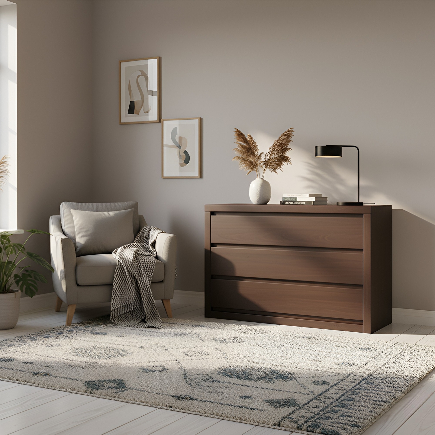 Szeroka i solidna komoda o długości 140 cm, wykonana w całości z twardego drewna bukowego. Połączenie pogrubionego korpusu i nowoczesnego, bezuchwytowego systemu otwierania (poprzez podcięcia na palce) nadaje jej designerski i elegancki charakter. To idealny, pojemny mebel do sypialni.