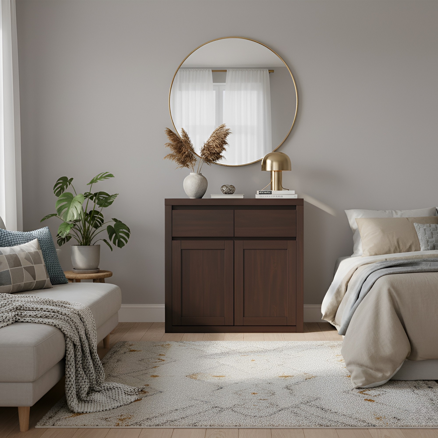Luksusowa komoda o szerokości 90 cm, wykonana w całości z twardego drewna bukowego. Pogrubiony korpus i bezuchwytowy system otwierania (podcięcia na palce) nadają jej designerski, nowoczesny charakter, wprowadzając do wnętrza luksusową i elegancką barwę. To idealny, solidny mebel do sypialni.