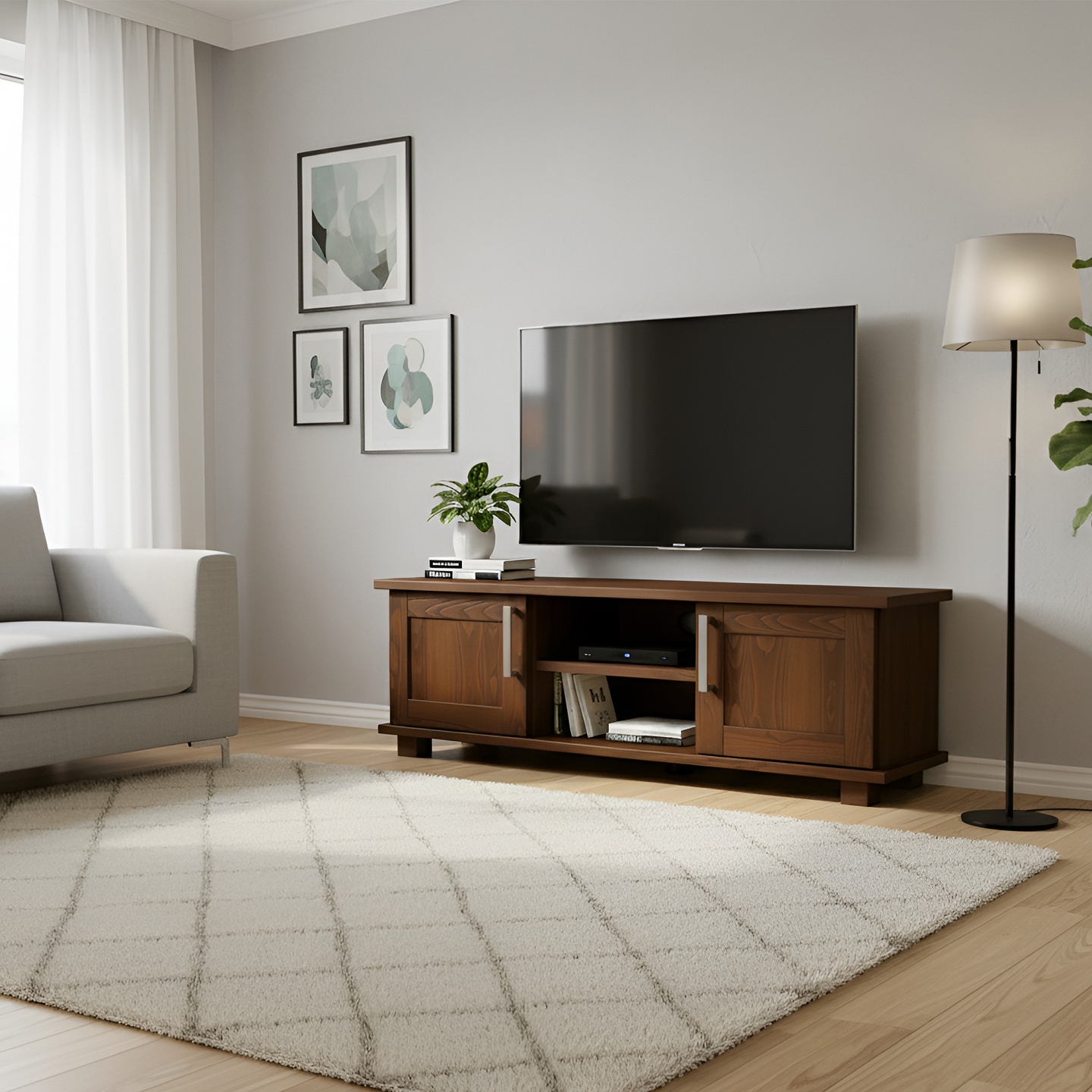 Szafka pod sprzęt RTV o szerokości 120 cm, wykonana w całości z twardego drewna bukowego. Ten mebel, charakteryzujący się minimalistyczną wysokością (40 cm), jest idealny do nowoczesnych salonów. Wszystkie elementy, z wyjątkiem tyłów i dna, są wykonane z litego, bezsęcznego drewna bukowego, wykończonego bejcą.