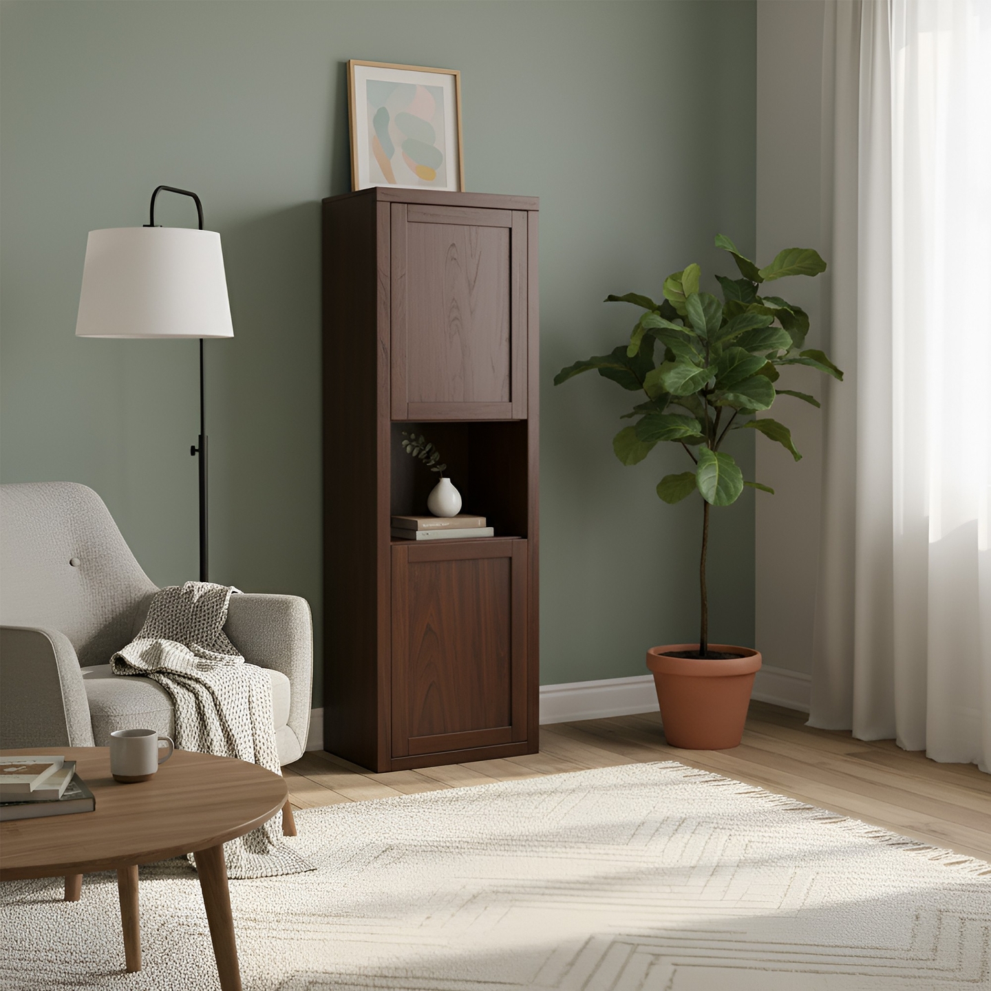 Wysoki i wąski słupek (witryna) o wysokości 190 cm, wykonany w całości z twardego drewna bukowego. Połączenie pogrubionego korpusu i nowoczesnego, bezuchwytowego systemu otwierania nadaje jej designerski i luksusowy charakter. To solidny mebel do pokoju dziennego, idealny do przechowywania.