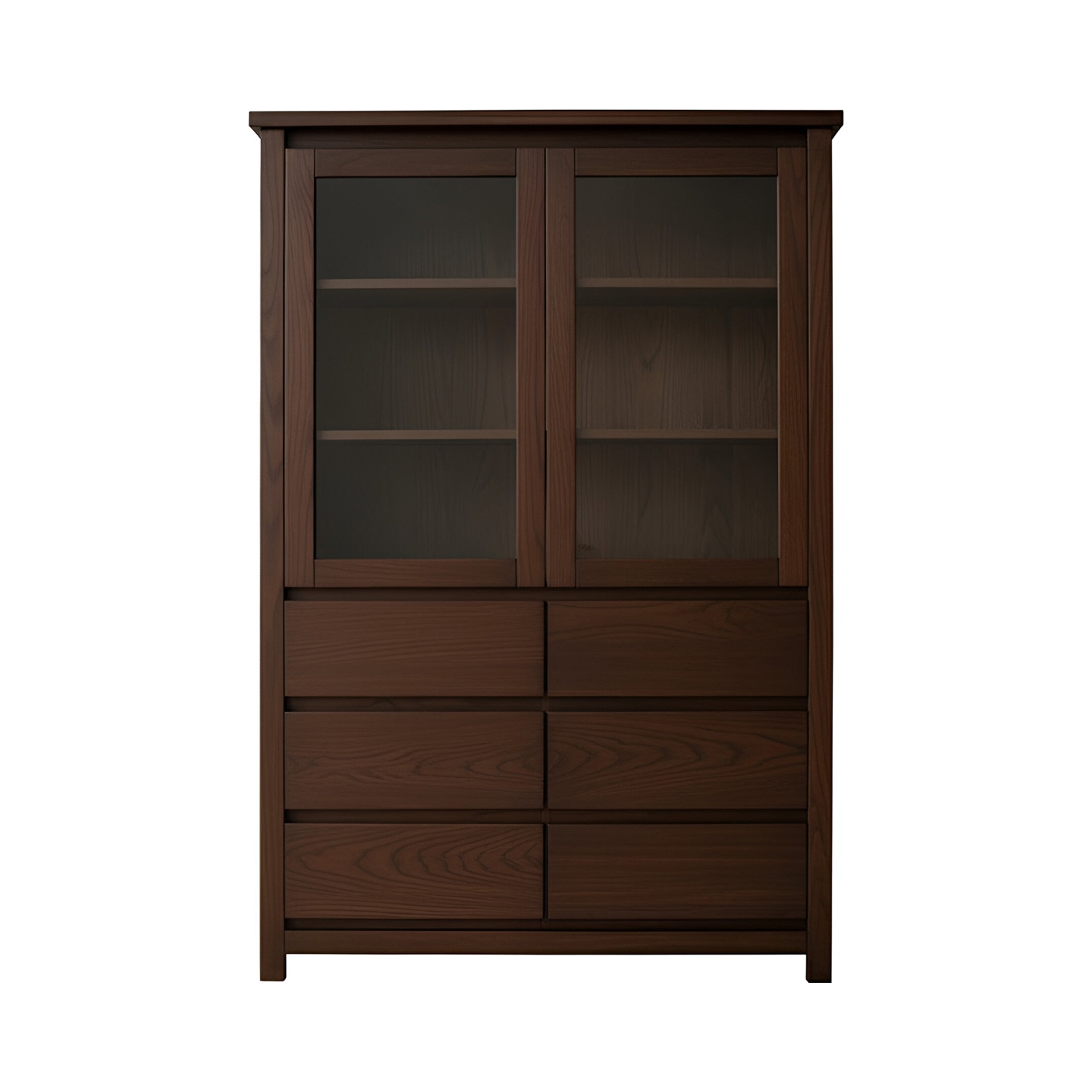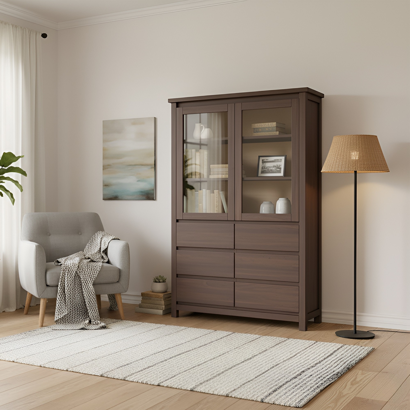 Wysoka i szeroka witryna o wysokości 180 cm, wykonana w całości z twardego drewna bukowego. Połączenie przeszklonych drzwi, pogrubionego korpusu i bezuchwytowego systemu otwierania nadaje jej designerski i luksusowy charakter, idealny do nowoczesnych wnętrz.