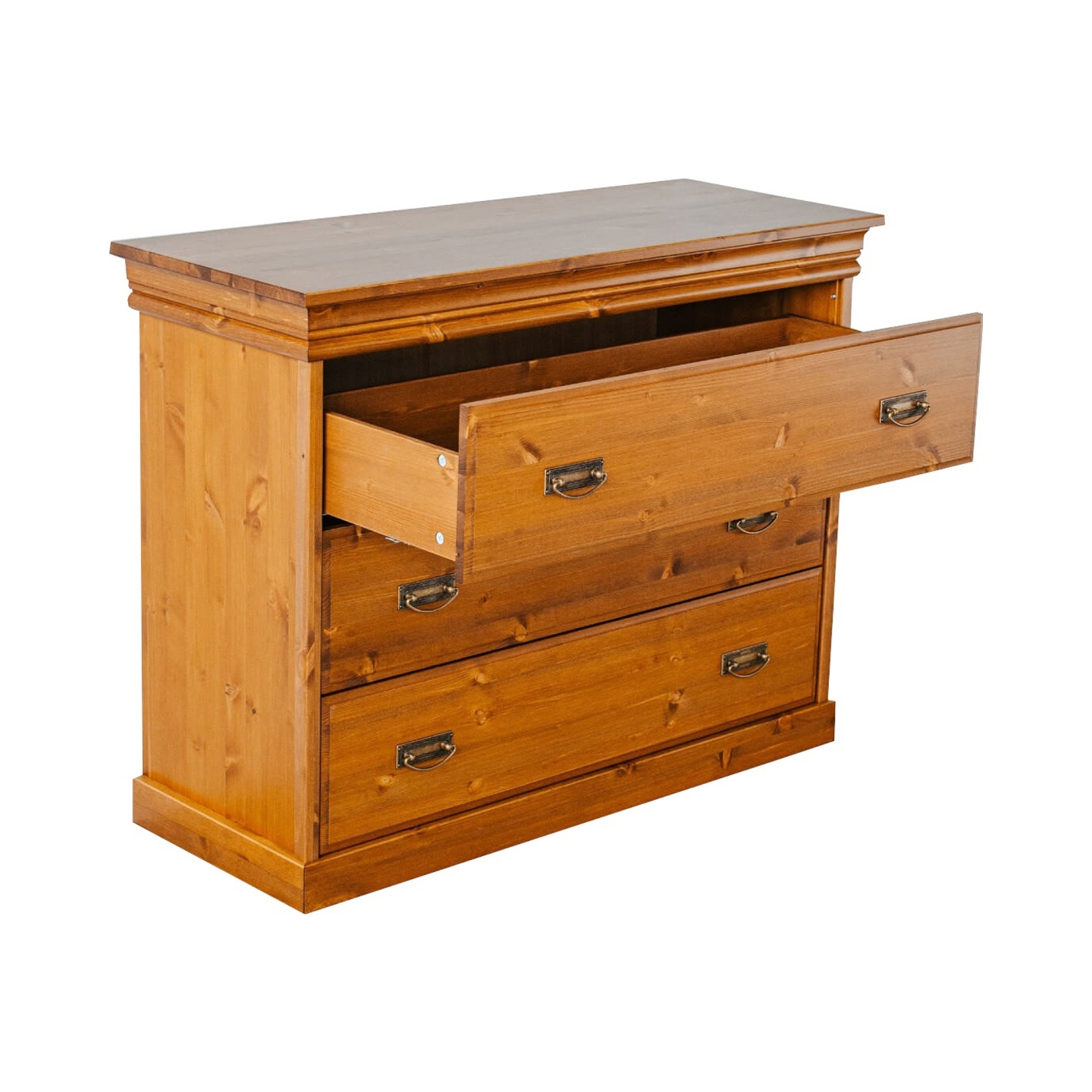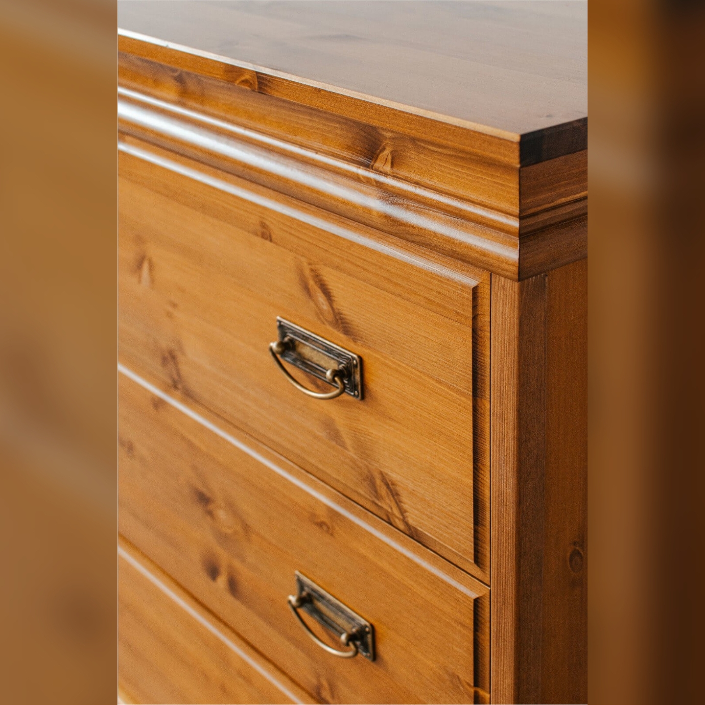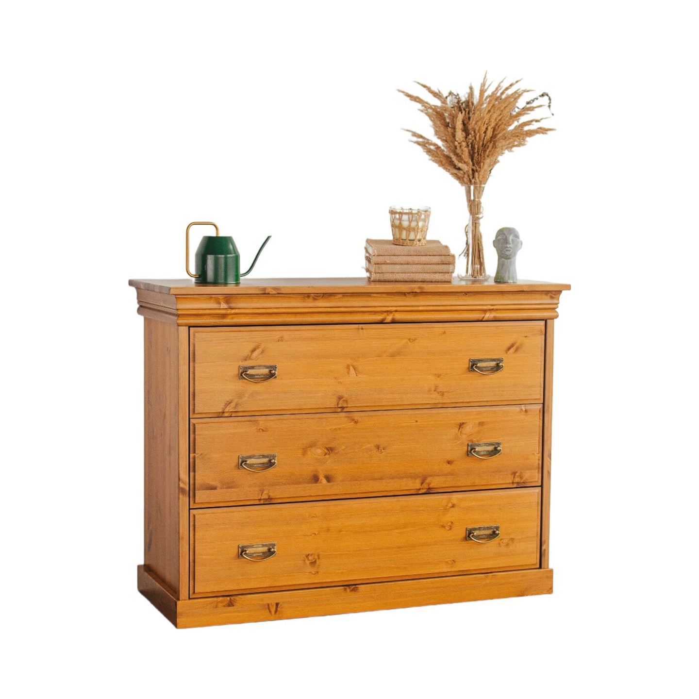 Wprowadź do swojego wnętrza naturalny akcent dzięki Komodzie Sosnowej z Szufladami Sycylia. Ten urokliwy mebel, wykonany z litego drewna sosnowego, jest doskonałym wyborem dla osób ceniących przytulny i solidny design. Powierzchnia mebla została starannie zabejcowana na kolor miodowy, który nadaje komodzie ciepły i przyjemny wygląd, pięknie eksponując naturalne usłojenie sosny (jak widoczne na załączonym zdjęciu). Komoda Sycylia to synonim praktyczności – jej pojemne szuflady, wyposażone w solidne prowadnice, zapewniają dużo miejsca do przechowywania i są łatwe w użytkowaniu. Metalowe uchwyty w stylu vintage stanowią oryginalny detal, który doskonale komponuje się z drewnem, nadając meblowi rustykalny charakter i wyjątkowy wygląd.