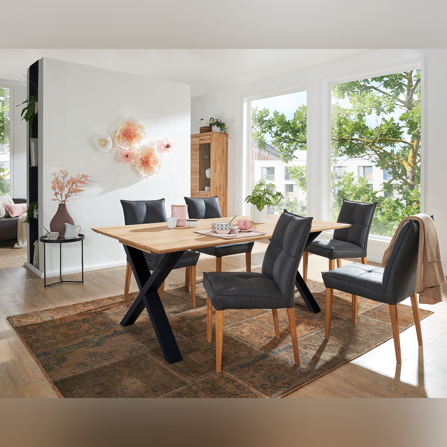 Odkryj nowoczesną elegancję z naszym Drewnianym Stołem Rozkładanym, wykonanym z wysokiej jakości dzikiego dębu olejowanego o grubości 25 mm. Ten stylowy stół o wymiarach 140 cm szerokości, 75 cm wysokości i 90 cm głębokości idealnie wpisze się w nowoczesne wnętrza. Dzięki możliwości rozłożenia do 190 cm za pomocą wkładki o długości 50 cm, z łatwością dostosujesz go do liczby gości. Charakterystyczne metalowe nogi w kształcie litery X dodają mu industrialnego charakteru i zapewniają stabilność. Na zdjęciu prezentowany jest stół z blatem o naturalnym odcieniu dębu, zestawiony z nowoczesnymi krzesłami na tle jasnego pomieszczenia.