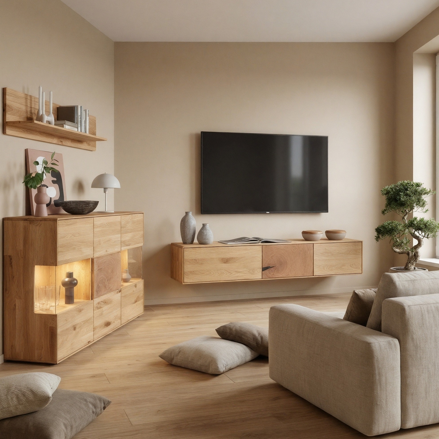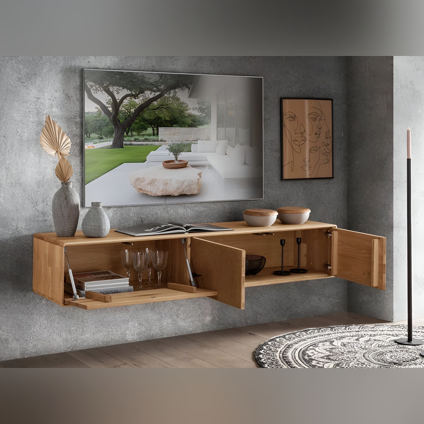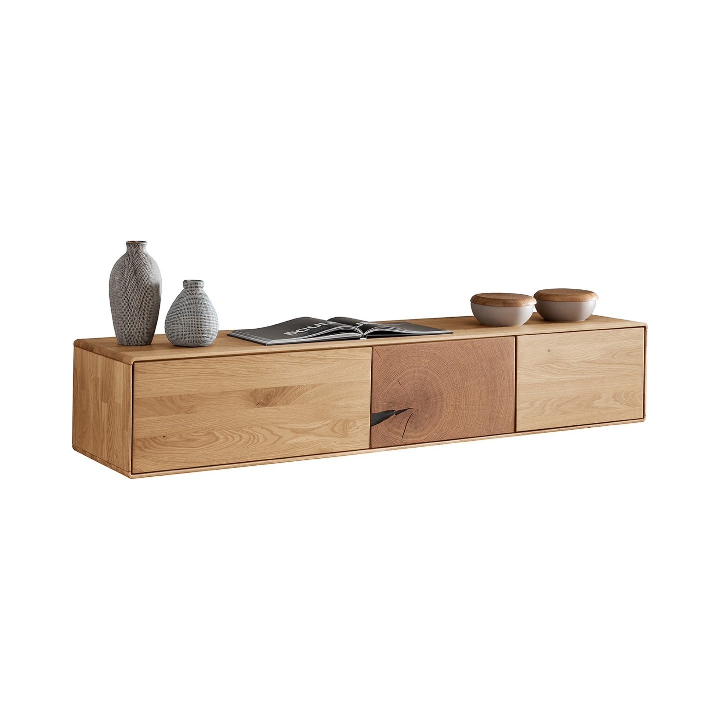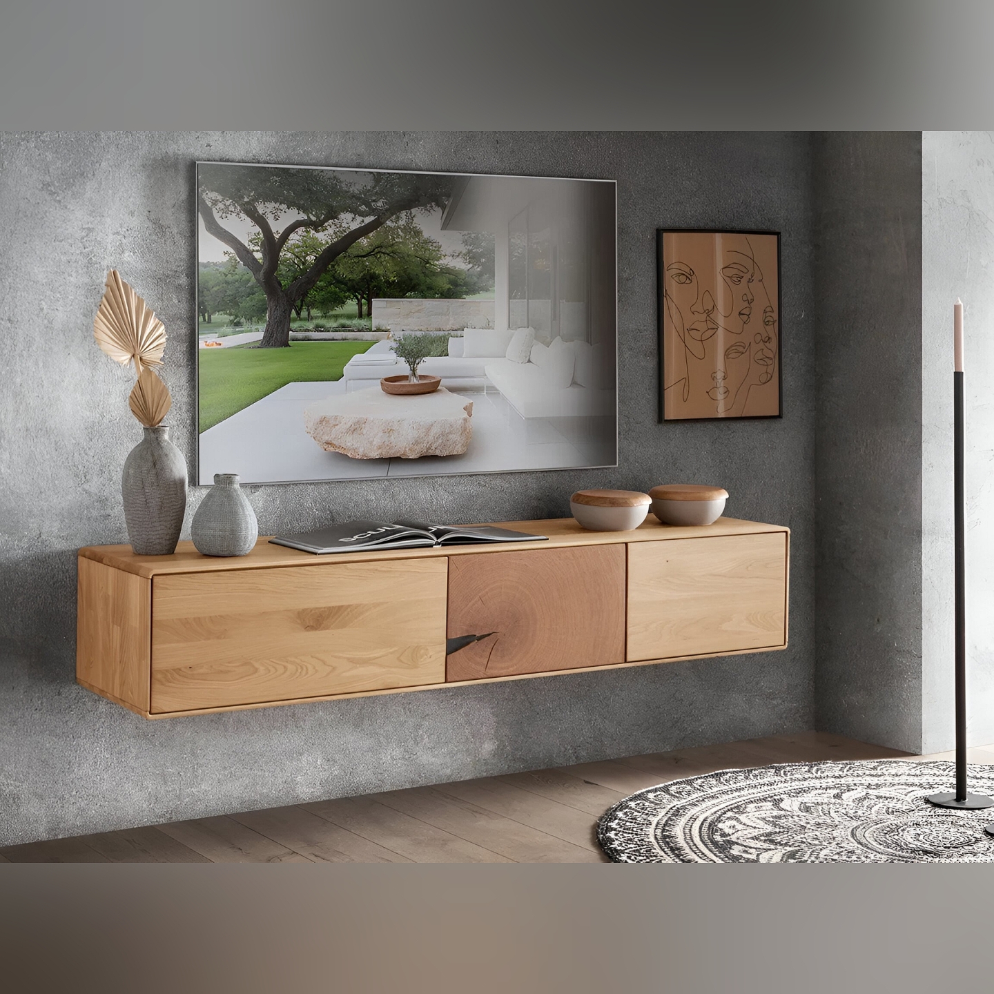 Przedstawiamy nowoczesną i elegancką Szafkę RTV Essenza I, wykonaną z wysokiej jakości litego dzikiego dębu. Ten niski, a zarazem funkcjonalny mebel to idealne rozwiązanie do Twojego salonu, łączące naturalne piękno drewna z minimalistycznym designem. Jej wymiary – 170 cm szerokości, 30,5 cm wysokości i 40 cm głębokości – zapewniają wystarczająco dużo miejsca na sprzęt RTV oraz inne akcesoria, jednocześnie nie dominując przestrzeni. Na załączonym zdjęciu widoczna jest szafka RTV z trzema frontami, za którymi kryją się praktyczne przestrzenie do przechowywania sprzętu elektronicznego, płyt, kabli czy pilotów, pomagając utrzymać porządek w Twoim salonie.