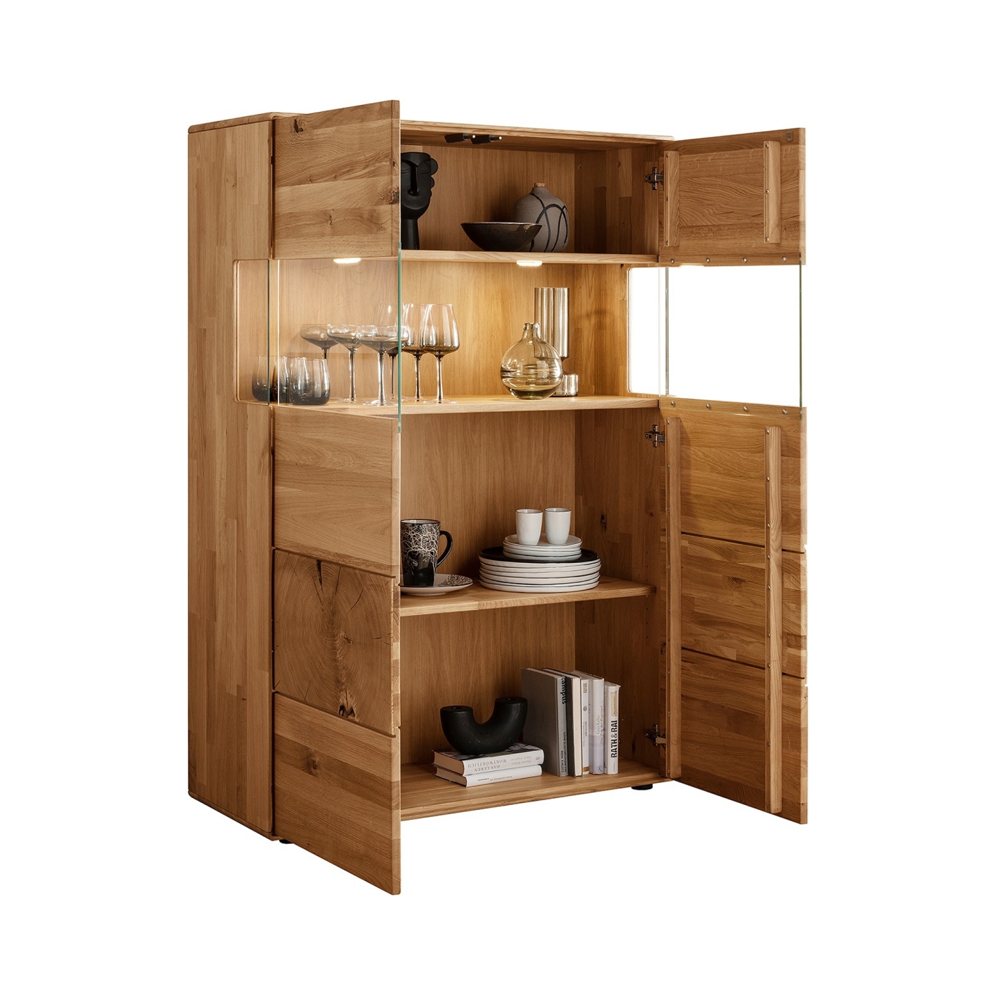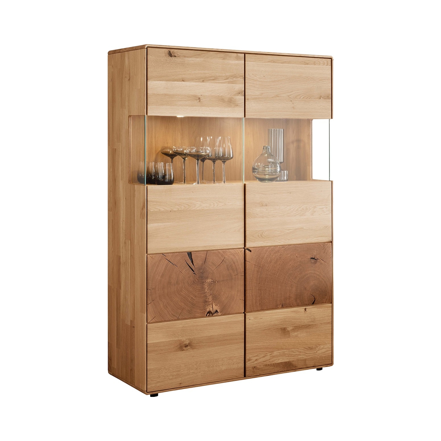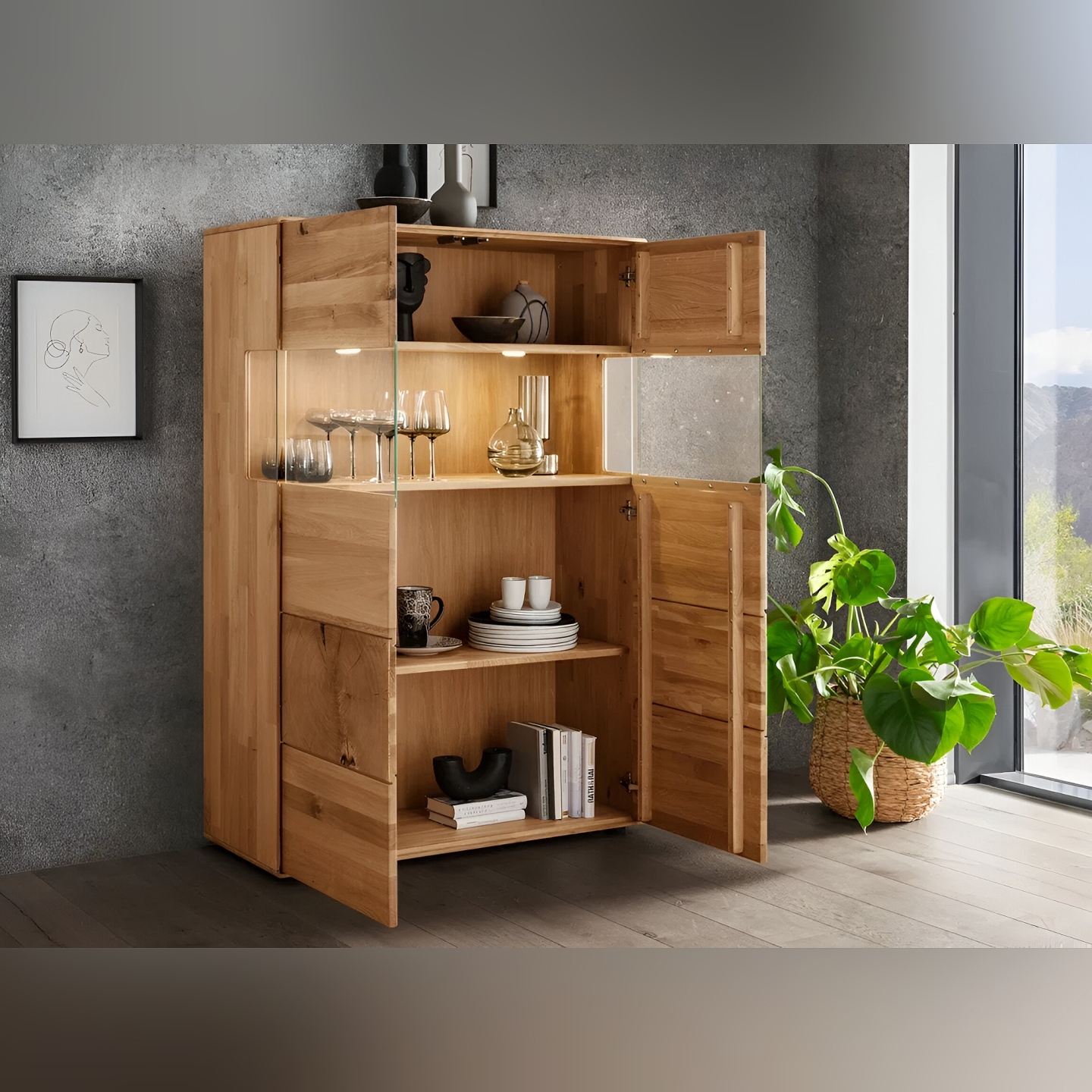 Odkryj wyjątkowy urok i funkcjonalność Kredensu Essenza II, wykonanego z wysokiej jakości litego dzikiego dębu. Ten solidny i stylowy mebel to idealne rozwiązanie do przechowywania i eksponowania przedmiotów w Twoim salonie lub jadalni. Jego wymiary – 100 cm szerokości, 145 cm wysokości i 40 cm głębokości – oferują znaczną przestrzeń użytkową. Na załączonym zdjęciu widoczna jest górna część kredensu z przeszklonymi frontami, idealna do wyeksponowania zastawy, szkła czy dekoracji, oraz dolna część z pełnymi frontami, zapewniająca dyskretne miejsce do przechowywania innych przedmiotów.