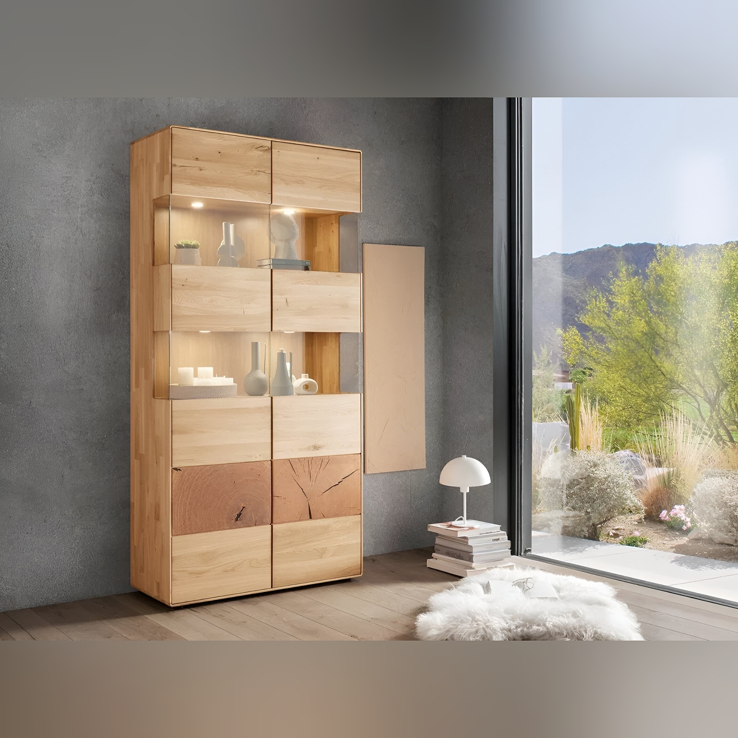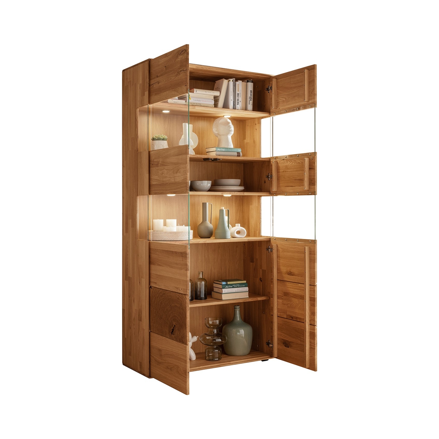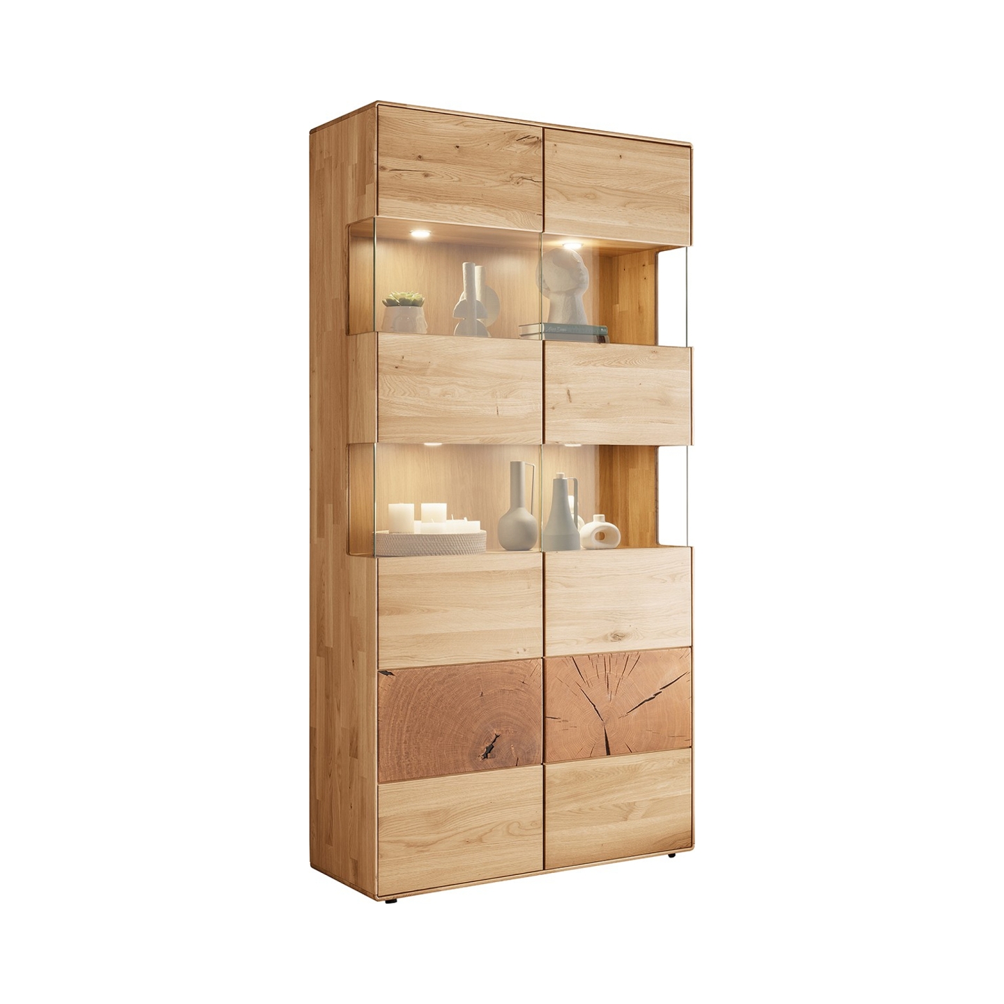 Odkryj imponującą Witrynę Essenza II, wykonaną z wysokiej jakości litego dzikiego dębu. Ten przestronny mebel zachwyca naturalnym pięknem drewna i oferuje mnóstwo miejsca do ekspozycji i przechowywania. Jej wymiary – 100 cm szerokości, 202 cm wysokości i 40 cm głębokości – czynią ją idealnym wyborem do salonu czy jadalni. Na załączonym zdjęciu widoczna jest witryna z częściowo przeszklonymi frontami w górnej części oraz pełnymi frontami w dolnej części, co pozwala na eleganckie wyeksponowanie dekoracji, szkła czy książek, a jednocześnie zapewnia dyskretne miejsce do przechowywania innych przedmiotów.