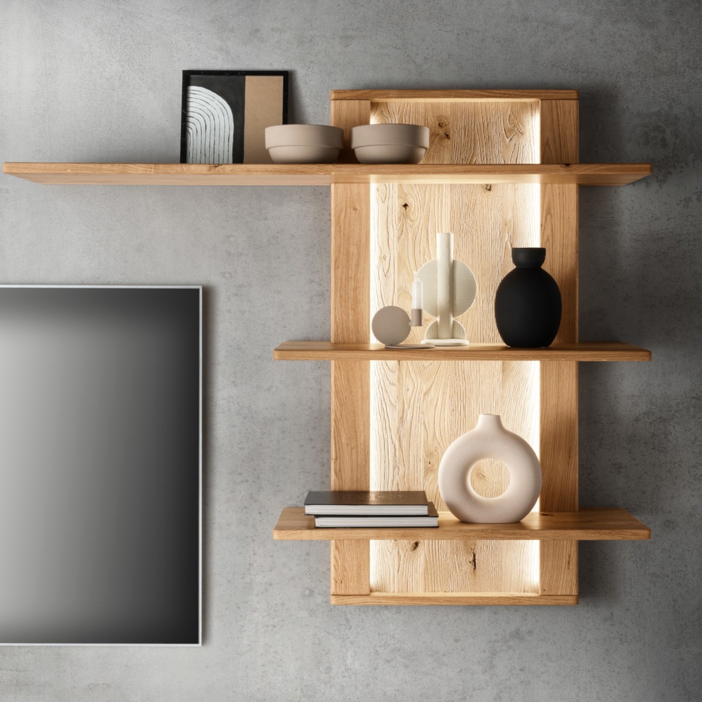 Wybór półki wiszącej dębowej II Corazon to inwestycja w mebel, który łączy funkcjonalność z wyrafinowanym designem. Użycie litego dębu zapewnia jej trwałość i odporność na uszkodzenia, co jest kluczowe dla mebli wiszących. Masa 27,5 kg świadczy o solidności konstrukcji. Dzięki oryginalnej wysokości i dekoracyjnej tylnej ścianie, półka ta staje się znaczącym elementem wystroju, a nie tylko dodatkiem. Jest dostarczana zmontowana, co ułatwia instalację, a oświetlenie w zestawie pozwala na natychmiastowe stworzenie przytulnej atmosfery. Półka ta jest idealna dla osób, które cenią sobie elastyczność aranżacji i chcą wyeksponować swoje zbiory na tle szlachetnego i trwałego drewna dębowego.