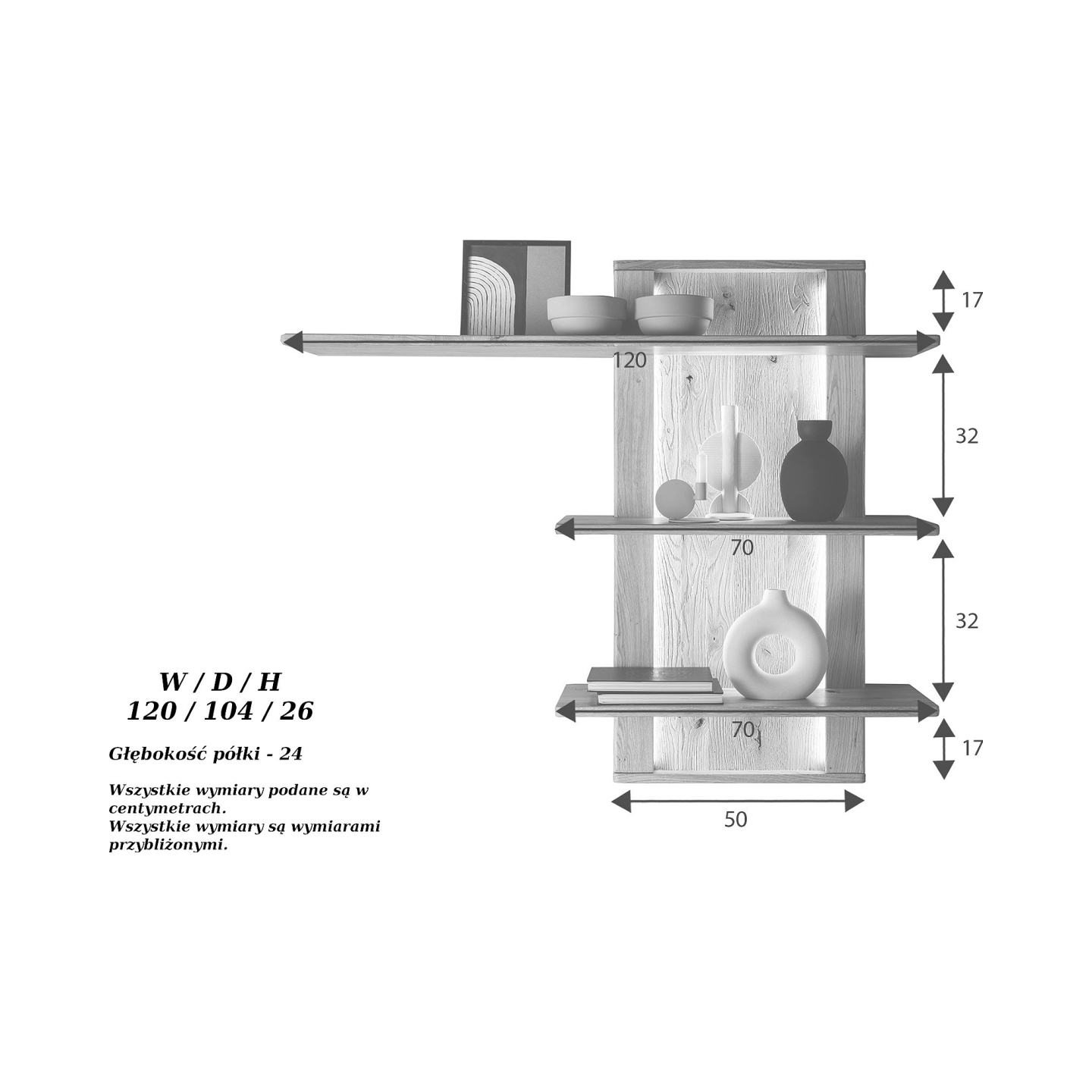 Wprowadź do swojego wnętrza funkcjonalny i efektowny akcent z półką wiszącą dębową II Corazon 120 cm. Wykonana z litego drewna dębowego, ta wyjątkowa półka jest znacznie wyższa niż standardowe modele (104 cm wysokości przy 120 cm szerokości), co pozwala na stworzenie pionowej kompozycji ściennej. Jej trwałość i odporność na uszkodzenia gwarantują, że będzie służyć przez wiele lat, niezależnie od tego, czy zawiśnie w salonie, sypialni, czy gabinecie. Unikalnym elementem jest tylna ściana wykonana z dekoracyjnego panelu piaskowanego. Półka jest dostarczana z oświetleniem w zestawie, które zapewnia efektowne podświetlenie ekspozycji. Dzięki możliwości montażu półek po lewej lub prawej stronie, jest niezwykle elastyczna w aranżacji.