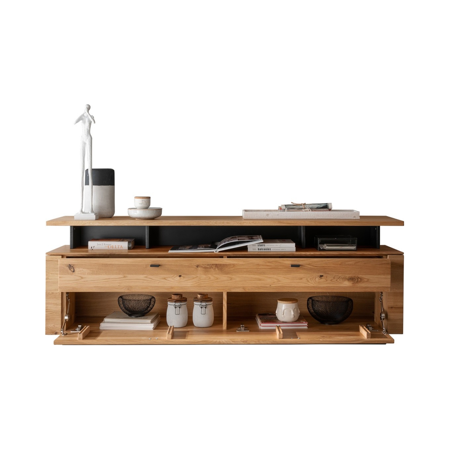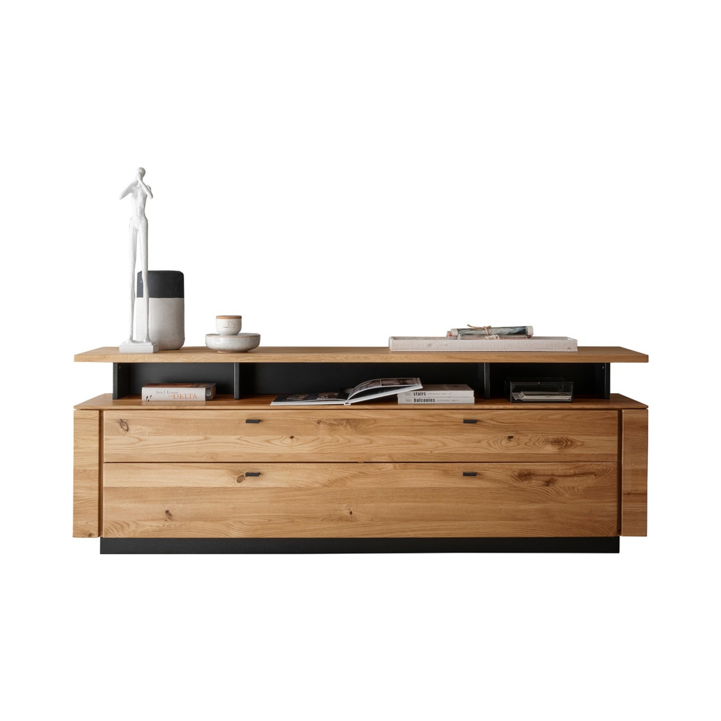 Wybierz szafkę RTV dębową I z nadstawką Corazon, aby harmonijnie połączyć funkcjonalność z naturalnym, szlachetnym wyglądem litego drewna dębowego. Ta szeroka szafka RTV o długości 179 cm jest doskonałym wyborem do przestronnych salonów, oferując znaczną powierzchnię na telewizor i sprzęt elektroniczny. Funkcjonalne połączenie pojemnej szuflady i zamykanej półki pozwala na dyskretne przechowywanie, a nadstawka dodaje dodatkowe możliwości aranżacyjne i miejsce do eksponowania dekoracji. Wykończenie olejem (bezbarwnym lub czarnym) podkreśla naturalny urok dębu. Oryginalne boki, wycięte z końca belek, stanowią unikalny i wyrazisty detal, wnosząc do wnętrza świeżość i oryginalność. Mebel jest dostarczany w całości zmontowany, co świadczy o jego solidności i natychmiastowej gotowości do użytku.