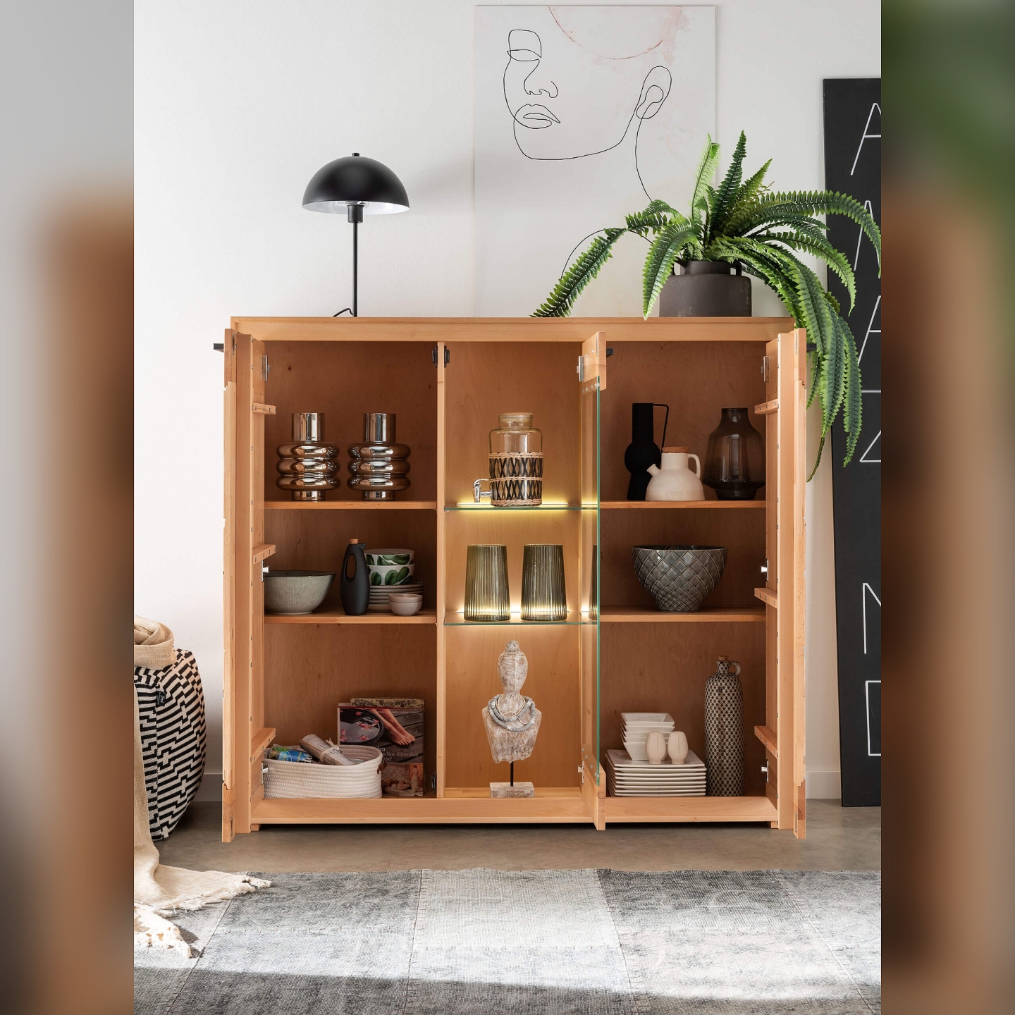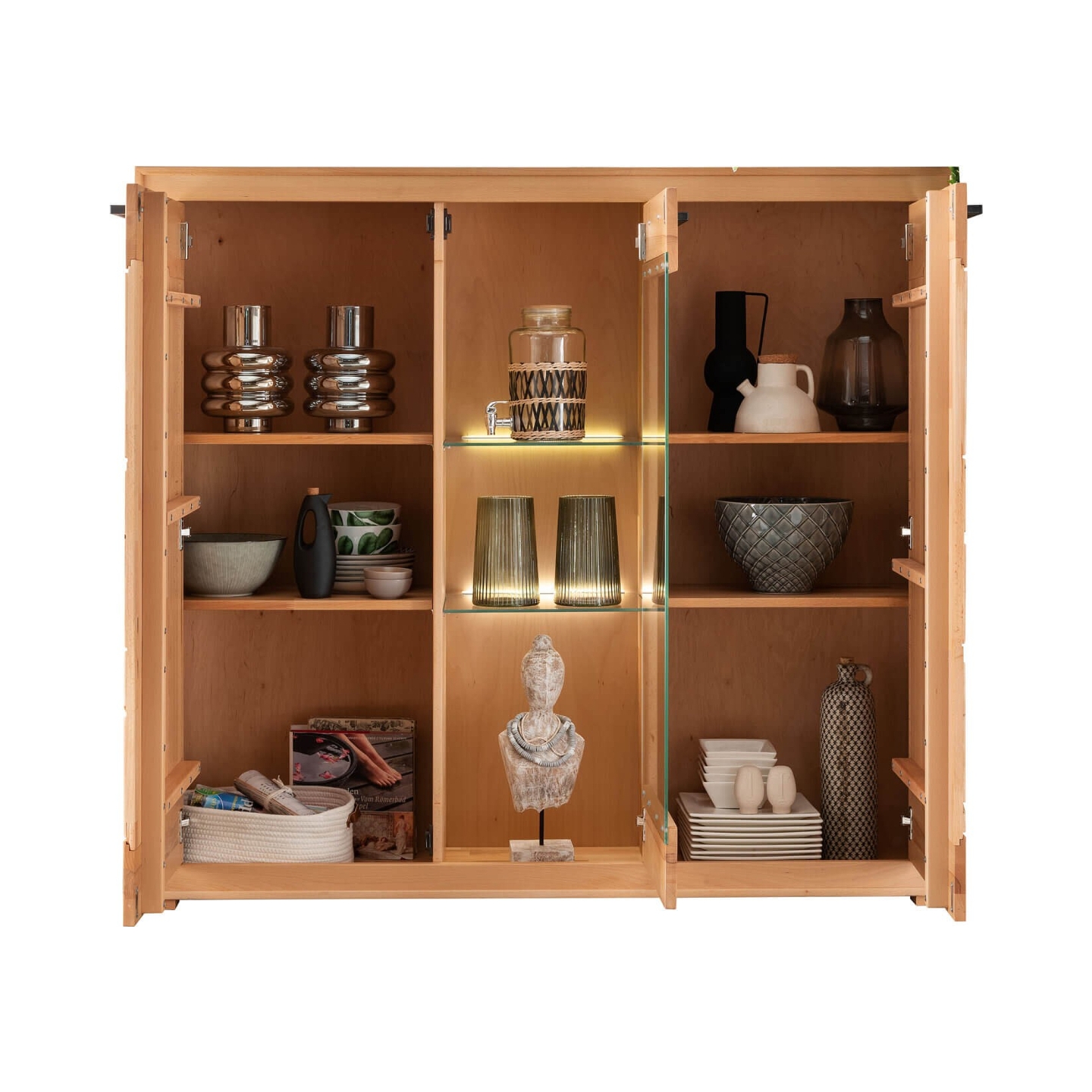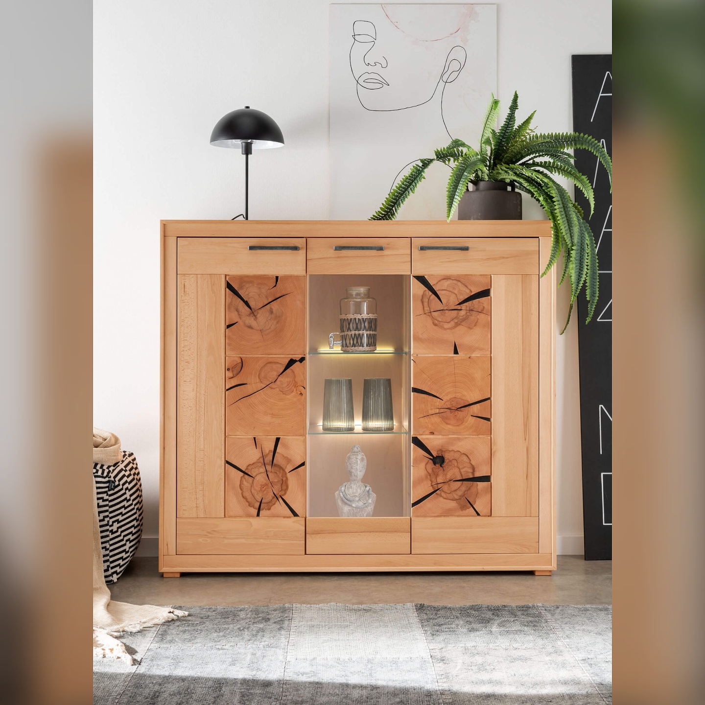Kredens II to masywny mebel o bogatym wzornictwie. Szczególnie przykuwającym uwagę elementem są fronty wycięte z końca belek. Ze względu na zachowanie naturalnych pęknięć, słojów, barwy, każdy mebel jest inny i niepowtarzalny. Kredens oferuje wiele miejsca do zagospodarowania oraz wyeksponowania rzeczy.