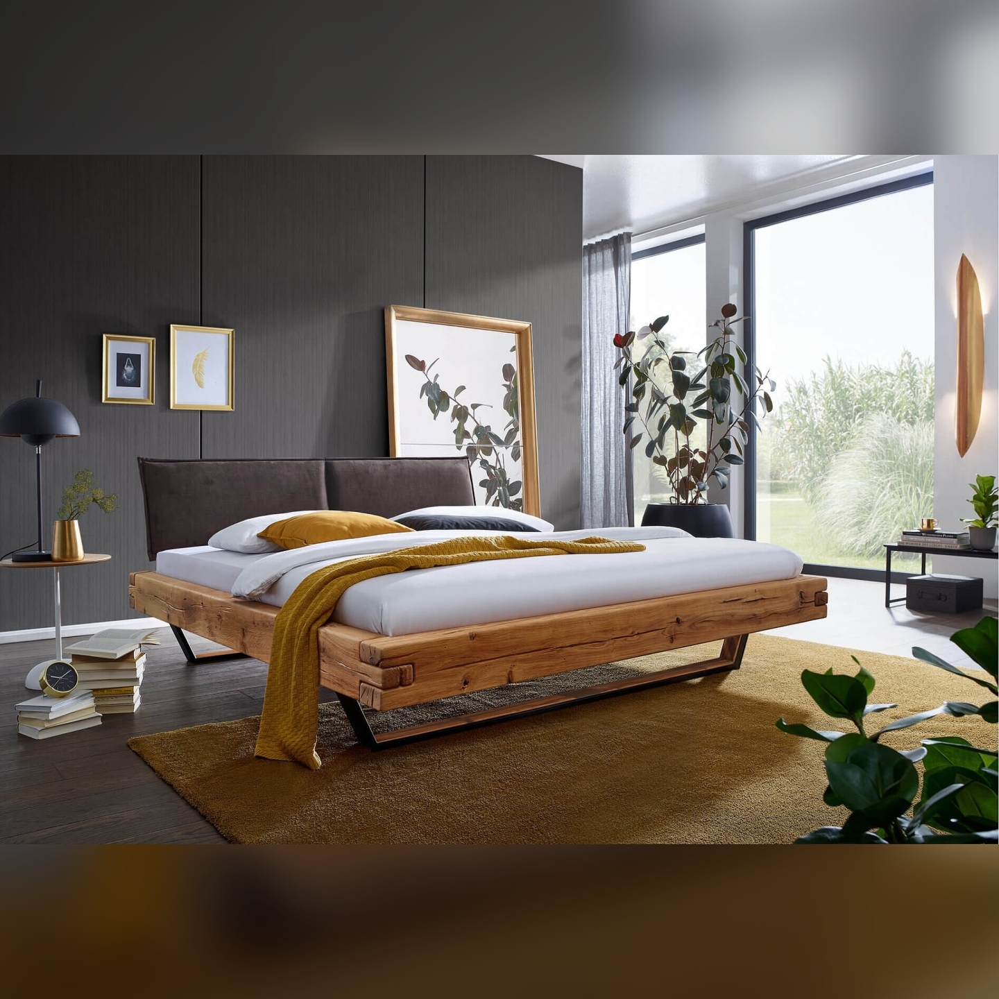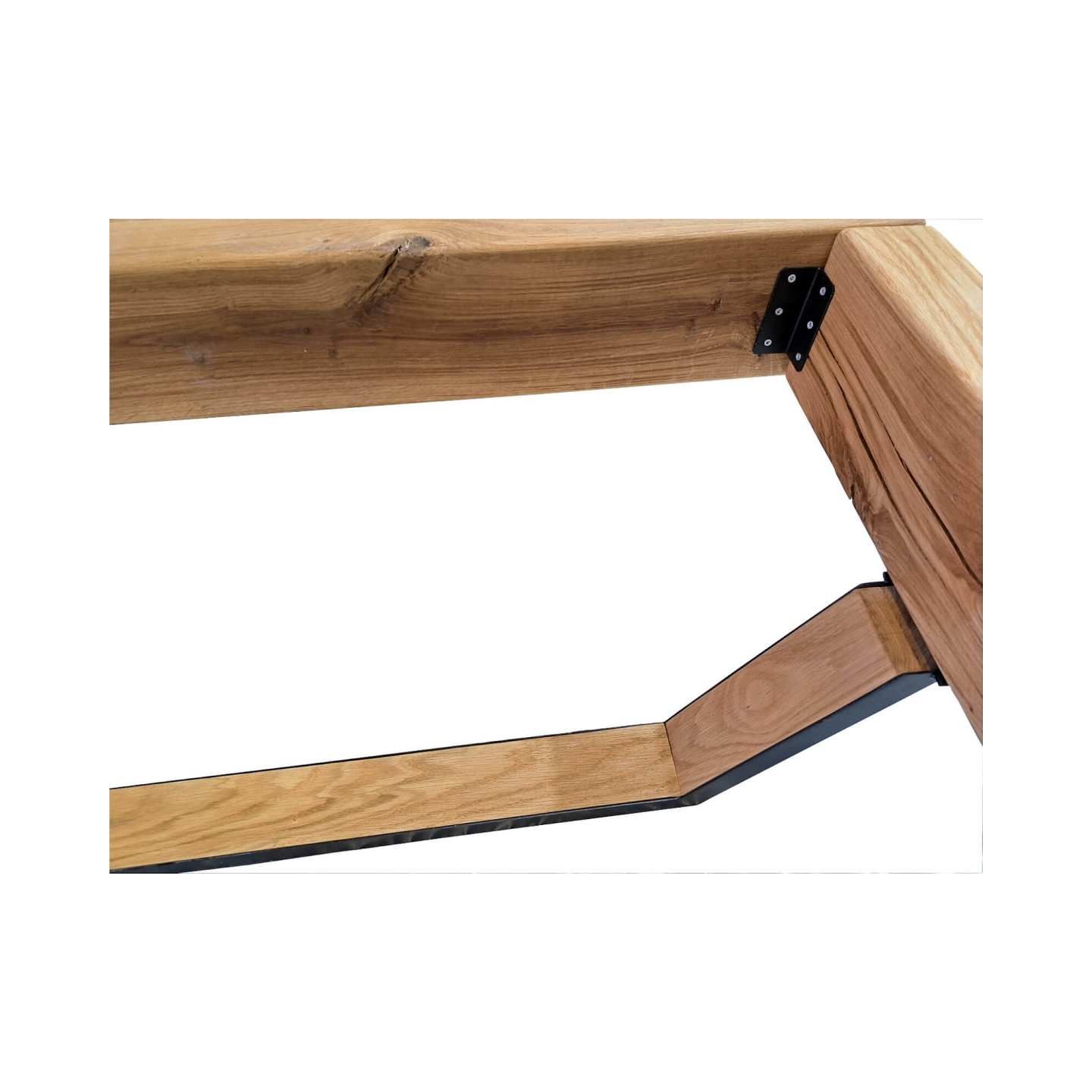 Łóżko drewniane Merak 160x200 to wysokiej klasy mebel, który łączy niezrównaną trwałość litego drewna dębowego z nowoczesnymi akcentami. Ramę łóżka tworzą masywne dębowe belki (grubość 16x9 cm), które w naturalny sposób eksponują unikalny układ słojów, pęknięcia oraz ciepłą barwę charakterystyczną dla tego szlachetnego gatunku drewna. Ten solidny fundament gwarantuje stabilność oraz komfort użytkowania przez długie lata. Łóżko Merak o powierzchni spania 160x200 cm idealnie pasuje do średnich i większych sypialni, a jego oparcie stanowi przyjemny w dotyku, wygodny tapicerowany zagłówek o wysokości 98 cm. Nowoczesny, industrialny charakter mebla podkreśla stabilna płoza z metalu, z subtelną drewnianą wkładką.