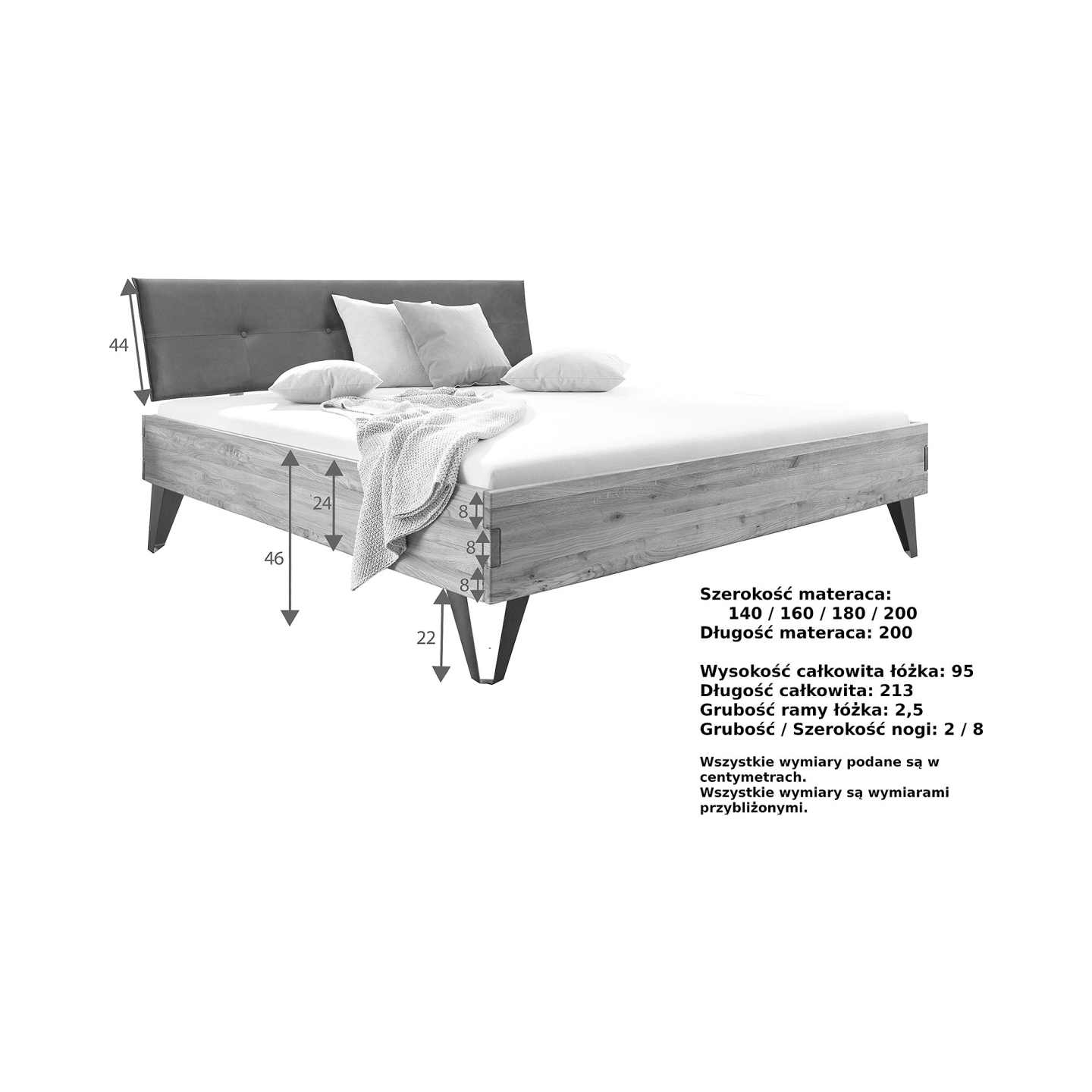 | Dodatkowe informacje | Wykonanie z dębu dzikiego, metalowe nogi, tapicerowany zagłówek w kolorze antracytu, zmienna głębokość łóżka ok. 11-18 cm, możliwość dokupienia szafki nocnej wiszącej, bez stelaża, do montażu |