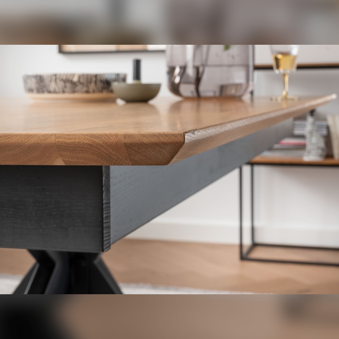 Model w wersji 180×100 cm daje wyraźnie więcej przestrzeni na co dzień, a po rozłożeniu do 265 cm bez problemu sprawdzi się podczas dużych rodzinnych spotkań i przyjęć. Metalowa podstawa typu podwójny X, malowana na czarno, stabilizuje całą konstrukcję i nadaje stołowi nowoczesny, loftowy charakter, który doskonale kontrastuje z naturalnym kolorem dębu.