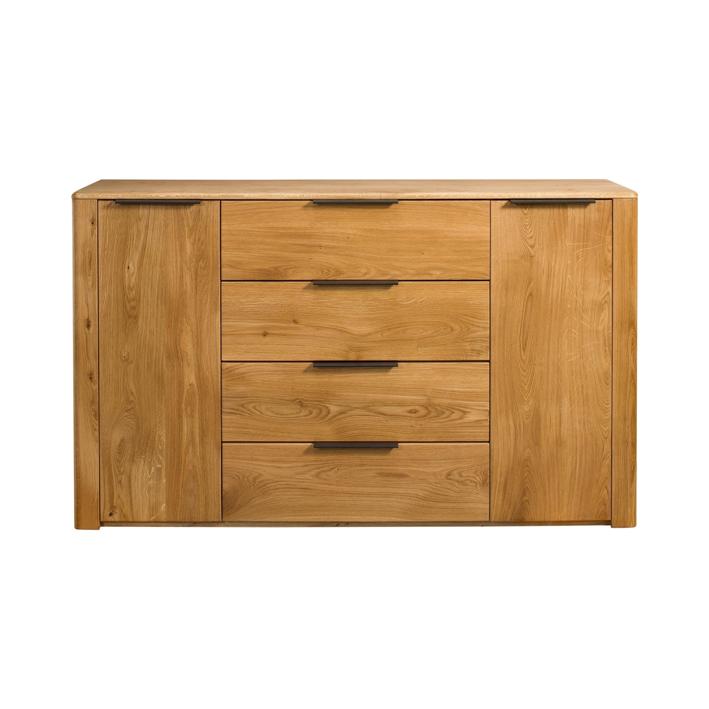 Wykończenie olejowe wnika w głąb drewna i chroni je przed zabrudzeniami, a szczotkowanie frontów odsłania pory i słoje. Dzięki temu komoda dobrze pasuje zarówno do wnętrz rustykalnych, jak i nowoczesnych aranżacji. Dwie boczne szafki i cztery środkowe szuflady zapewniają uporządkowaną i praktyczną przestrzeń do przechowywania.