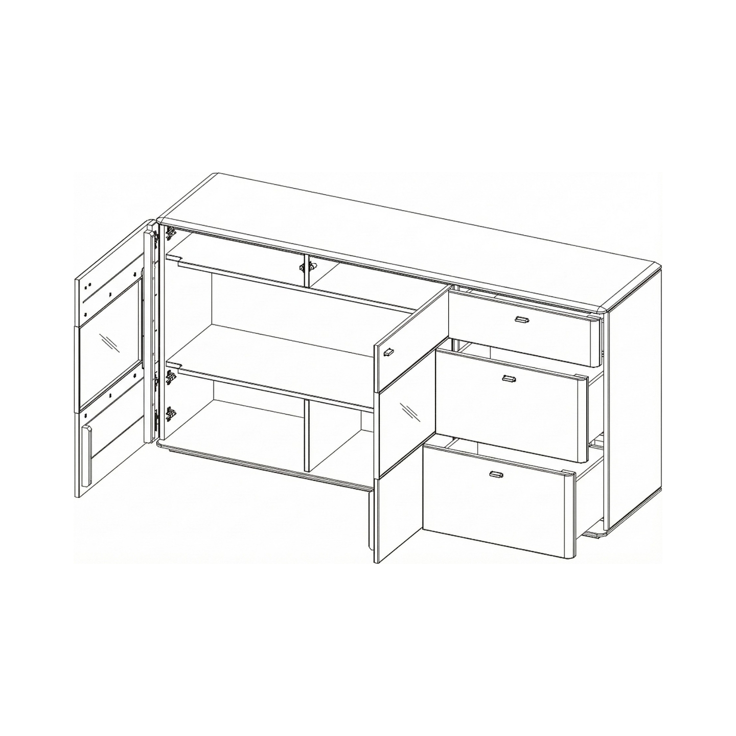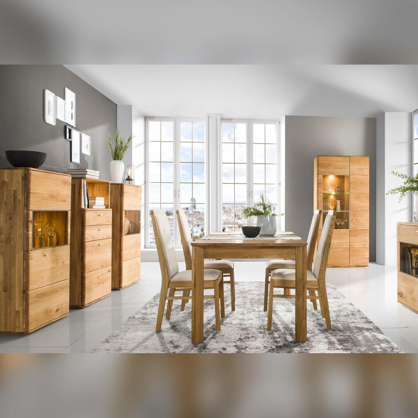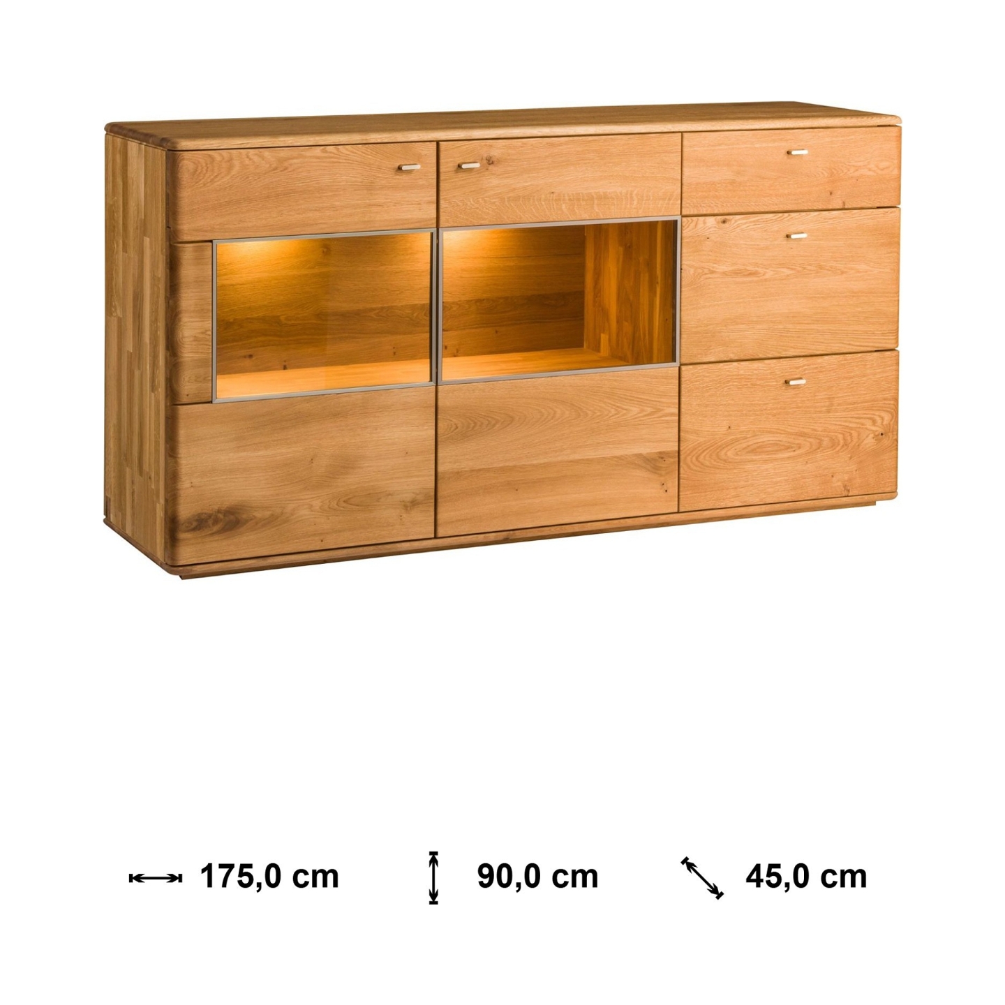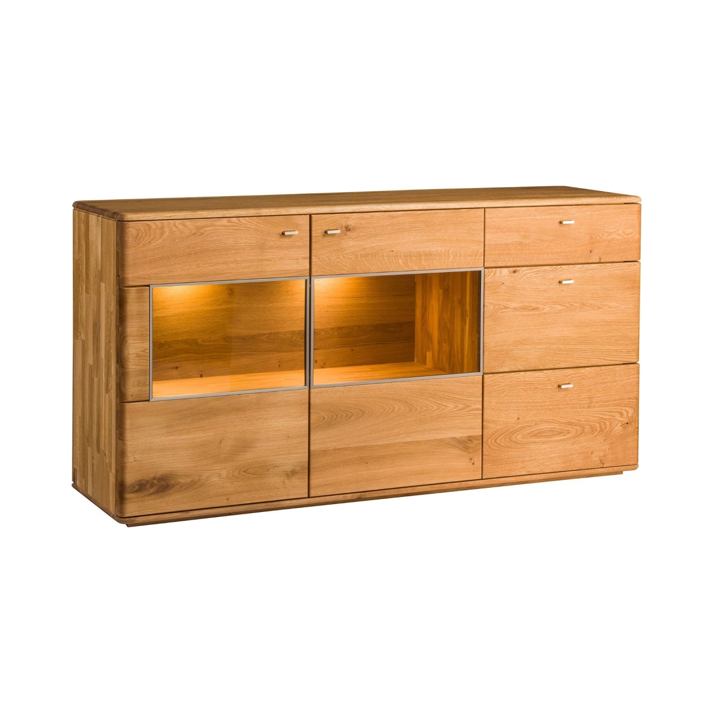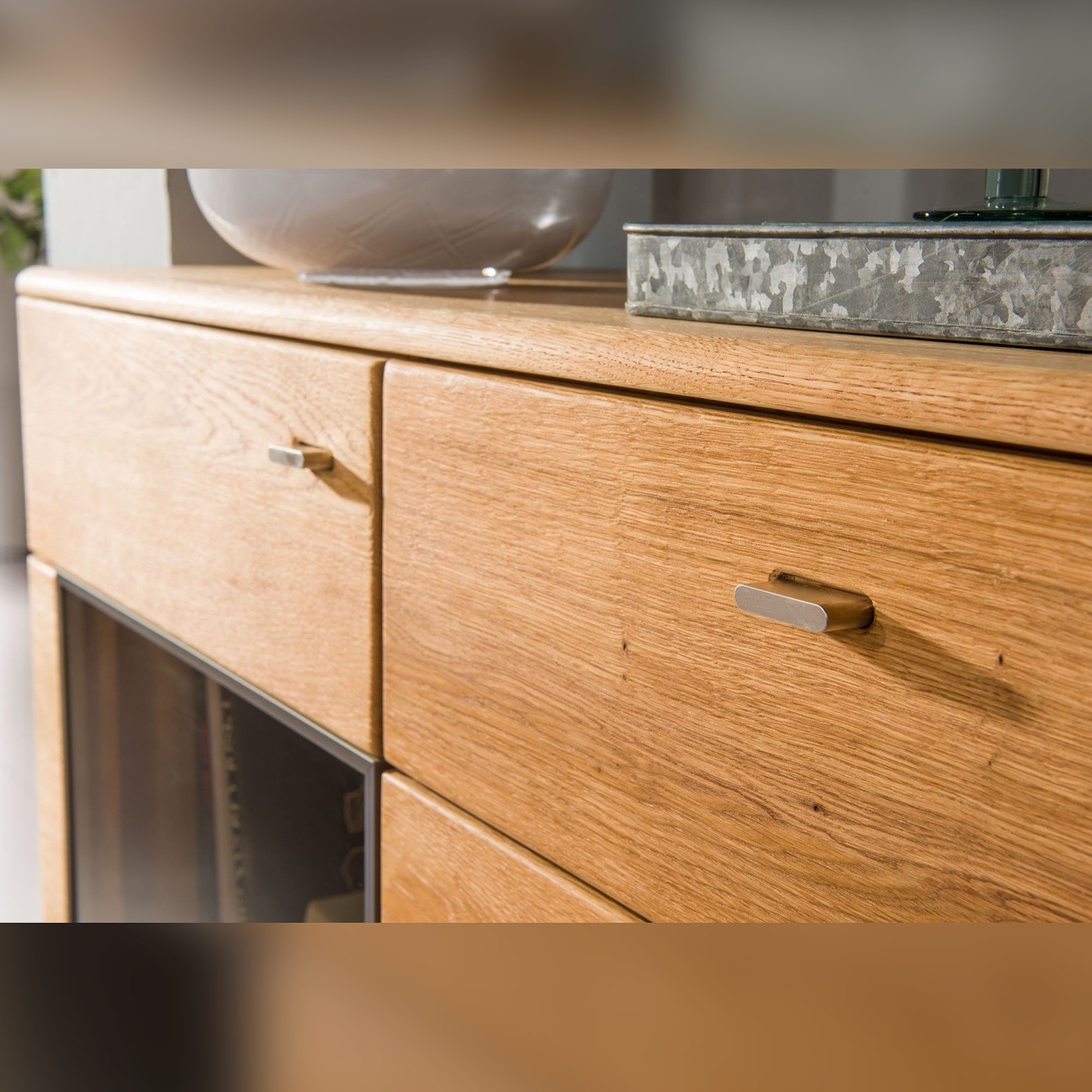Wykończenie olejem chroni powierzchnię przed codziennym użytkowaniem, a szczotkowanie nadaje fakturę wyczuwalną pod dłonią. Przeszklone wnęki pozwalają wyeksponować dekoracje, a głębokie szuflady i szafki ułatwiają utrzymanie porządku w salonie lub jadalni.