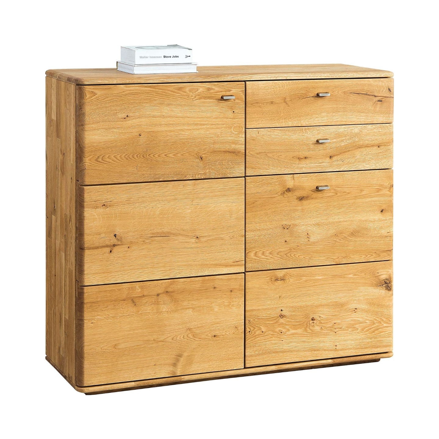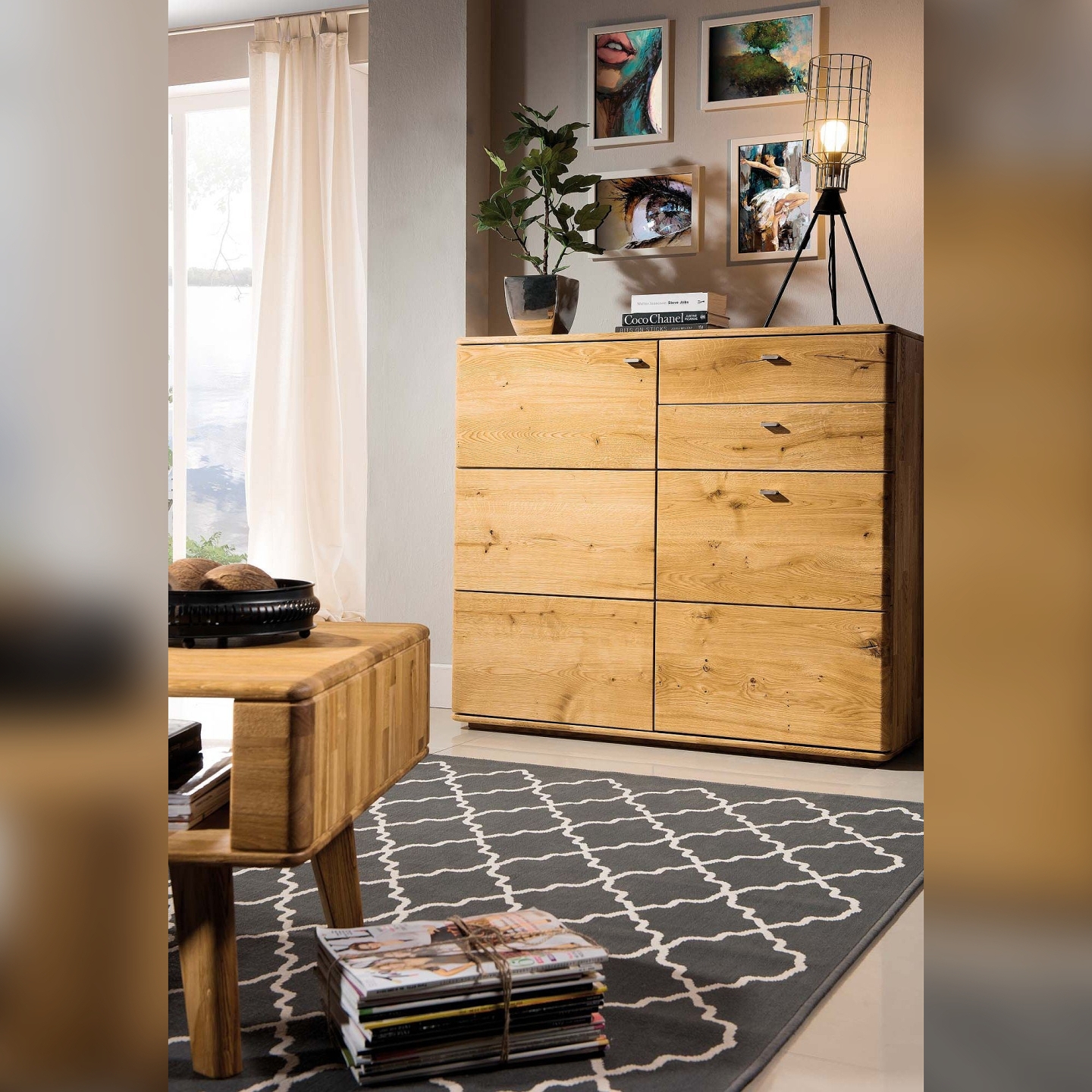 Wykończenie olejowe wnika w głąb drewna i chroni je przed zabrudzeniami, a szczotkowanie frontów odsłania pory i słoje. Dzięki temu komoda dobrze pasuje zarówno do wnętrz rustykalnych, jak i nowoczesnych aranżacji. Dwie boczne szafki i cztery środkowe szuflady zapewniają uporządkowaną i praktyczną przestrzeń do przechowywania.