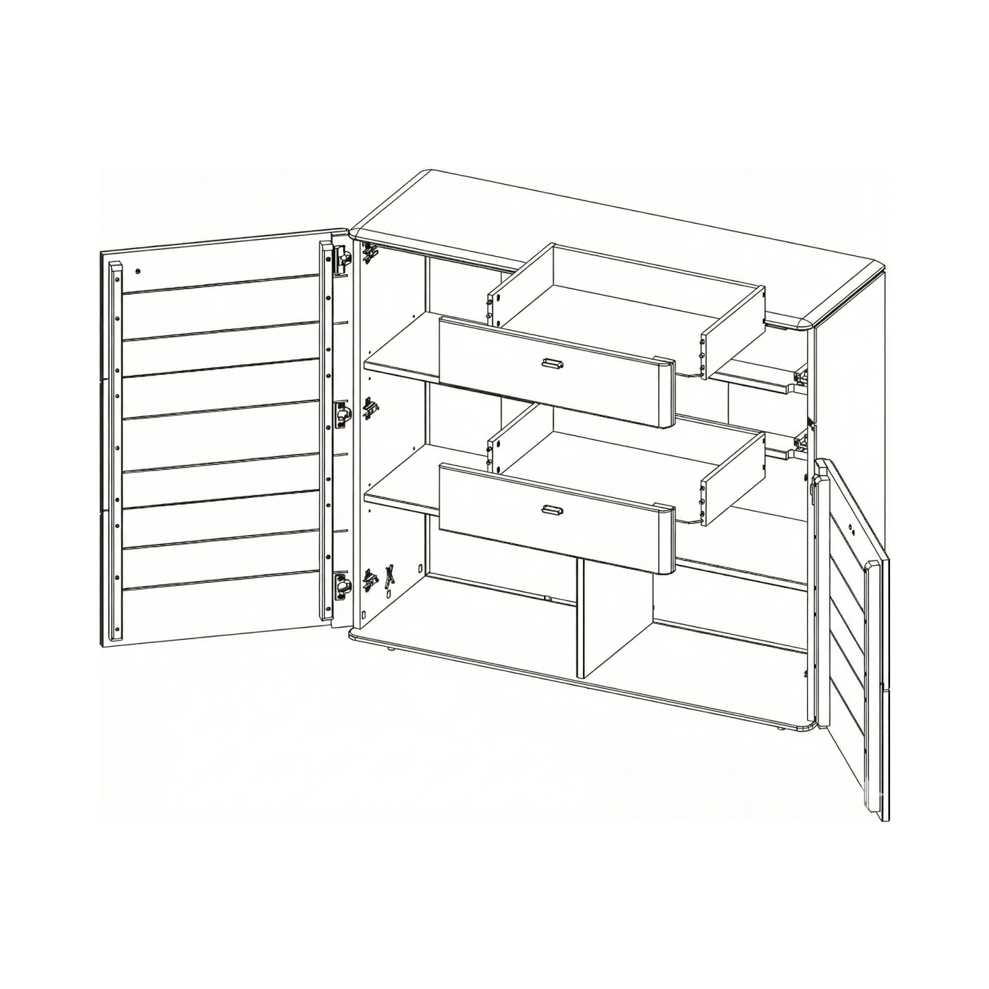 👉 Funkcjonalny układ przechowywania: dwie szafki po bokach i cztery szuflady na środku.