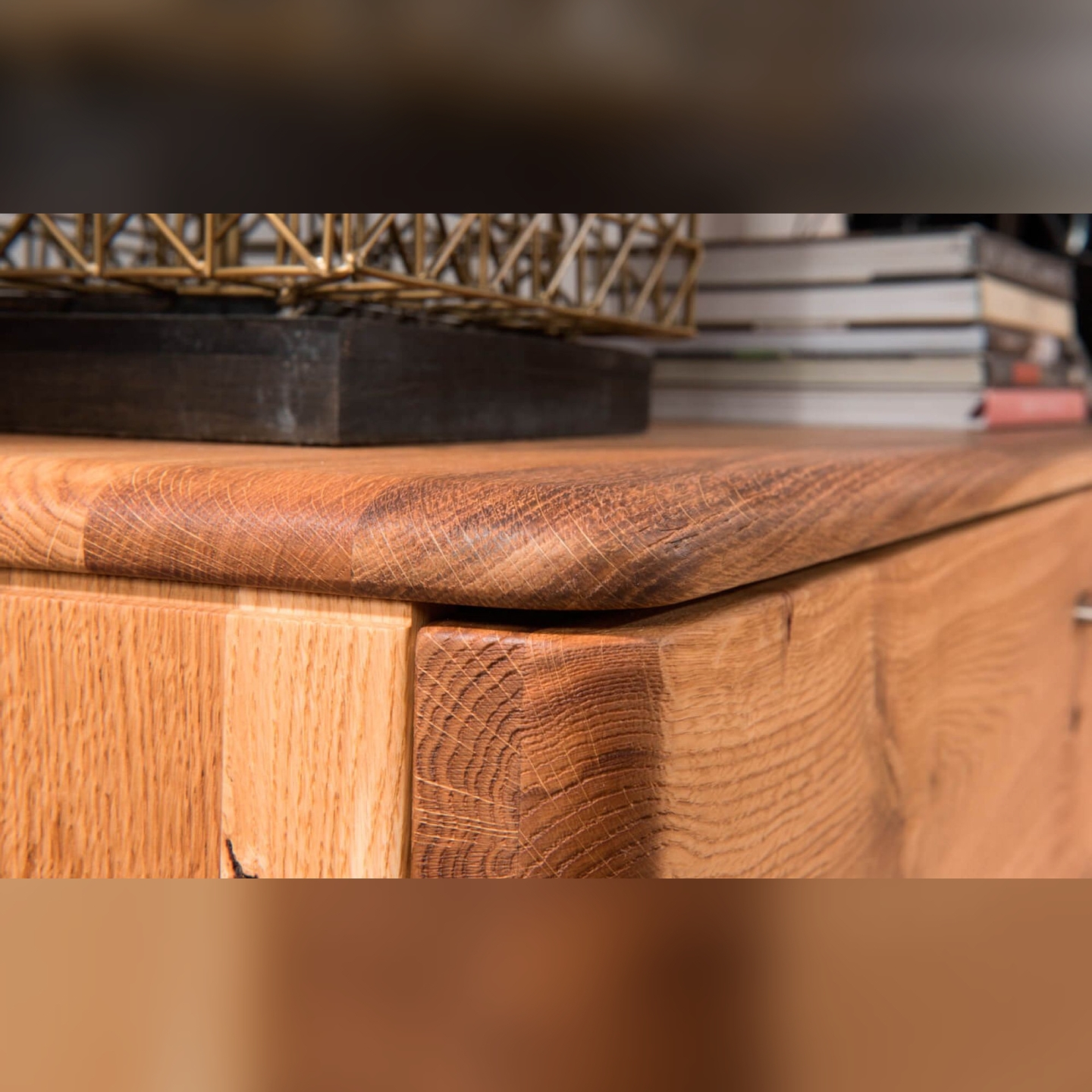 Korpus z litego dębu zapewnia stabilną konstrukcję, a wykończenie olejem lub woskiem zabezpiecza powierzchnię przed zabrudzeniami i podkreśla naturalne słoje. Komoda jest dostarczana w całości, bez konieczności montażu po dostawie.