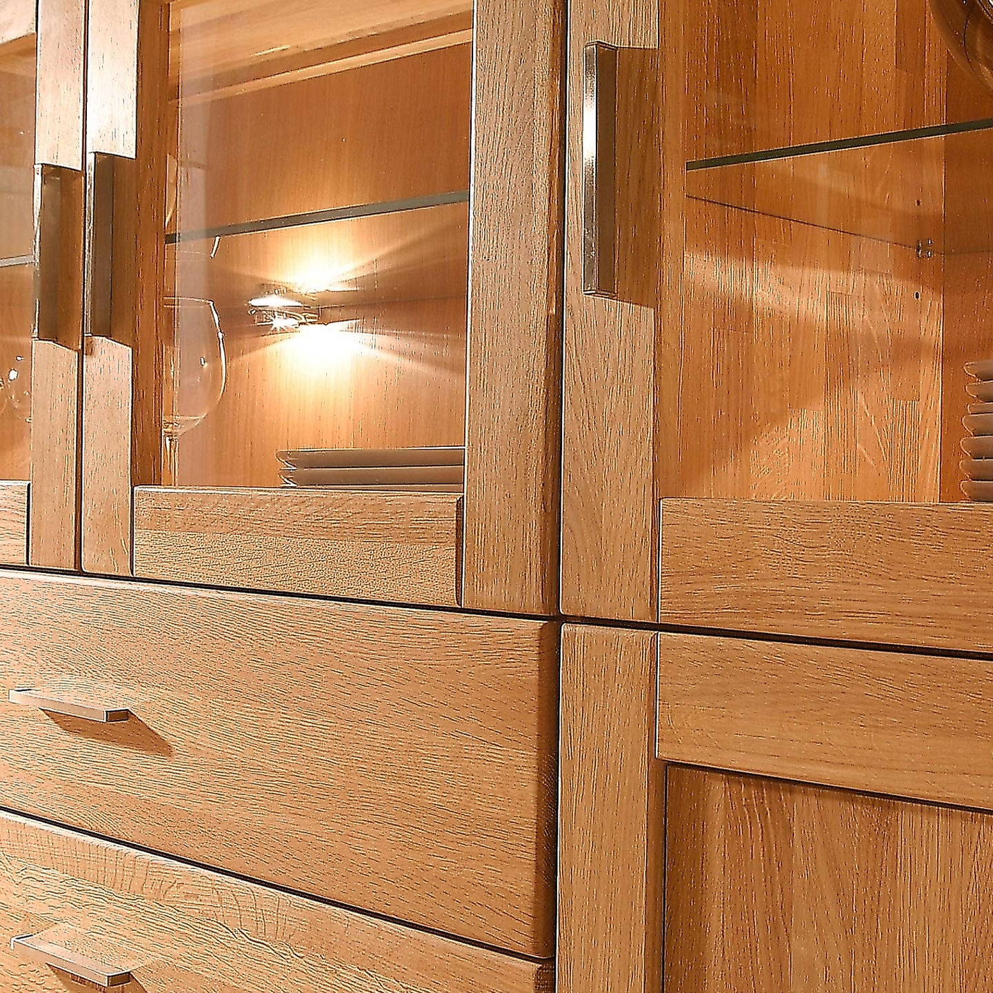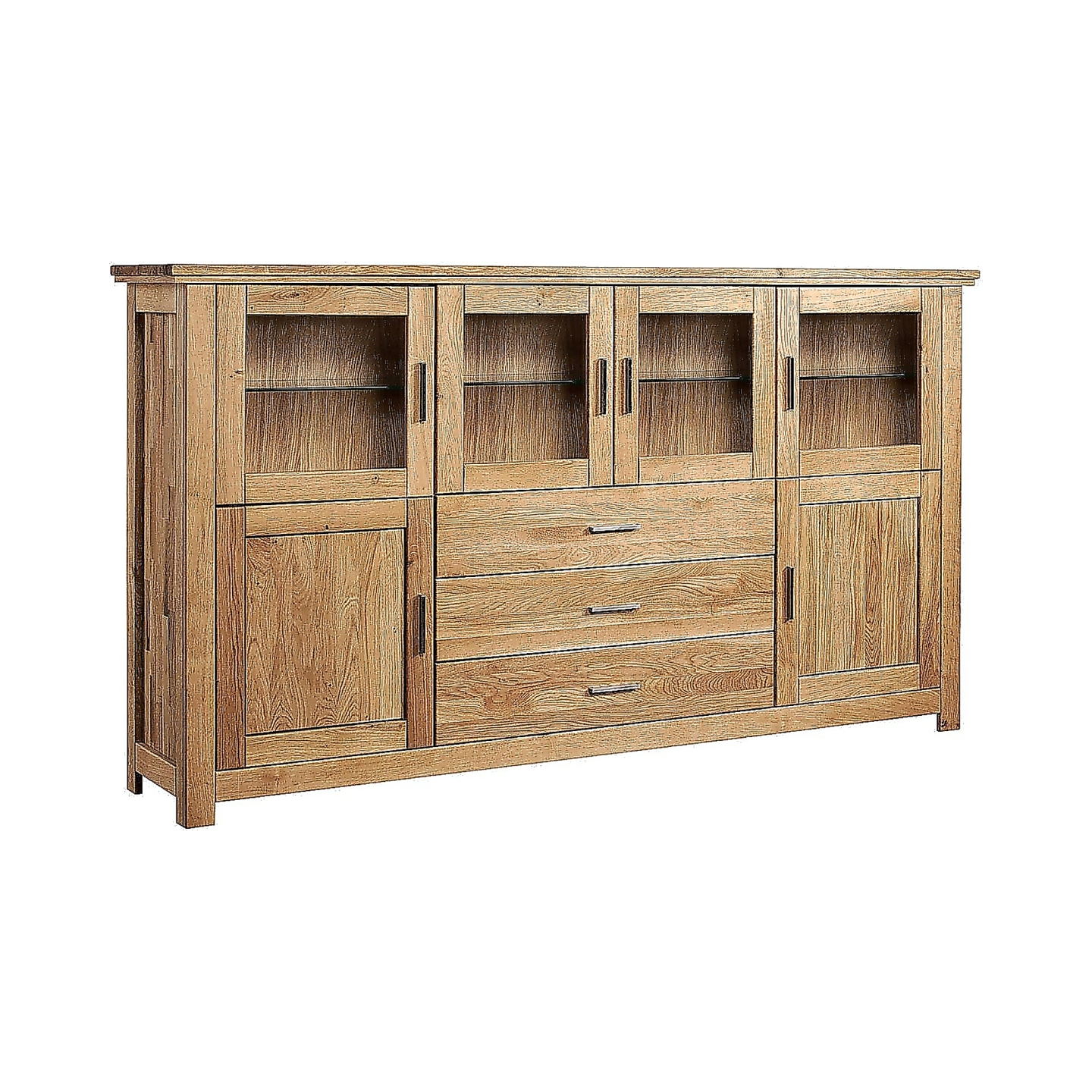 Model oferuje rozbudowany i logiczny układ przechowywania: trzy szuflady, dwie szafki z półkami oraz cztery przeszklone komory, które pozwalają oddzielić rzeczy użytkowe od elementów ekspozycyjnych. Konstrukcja z pełnego drewna dębowego dobrze znosi codzienne obciążenia, a mebel nie wymaga montażu, ponieważ dostarczany jest w całości.