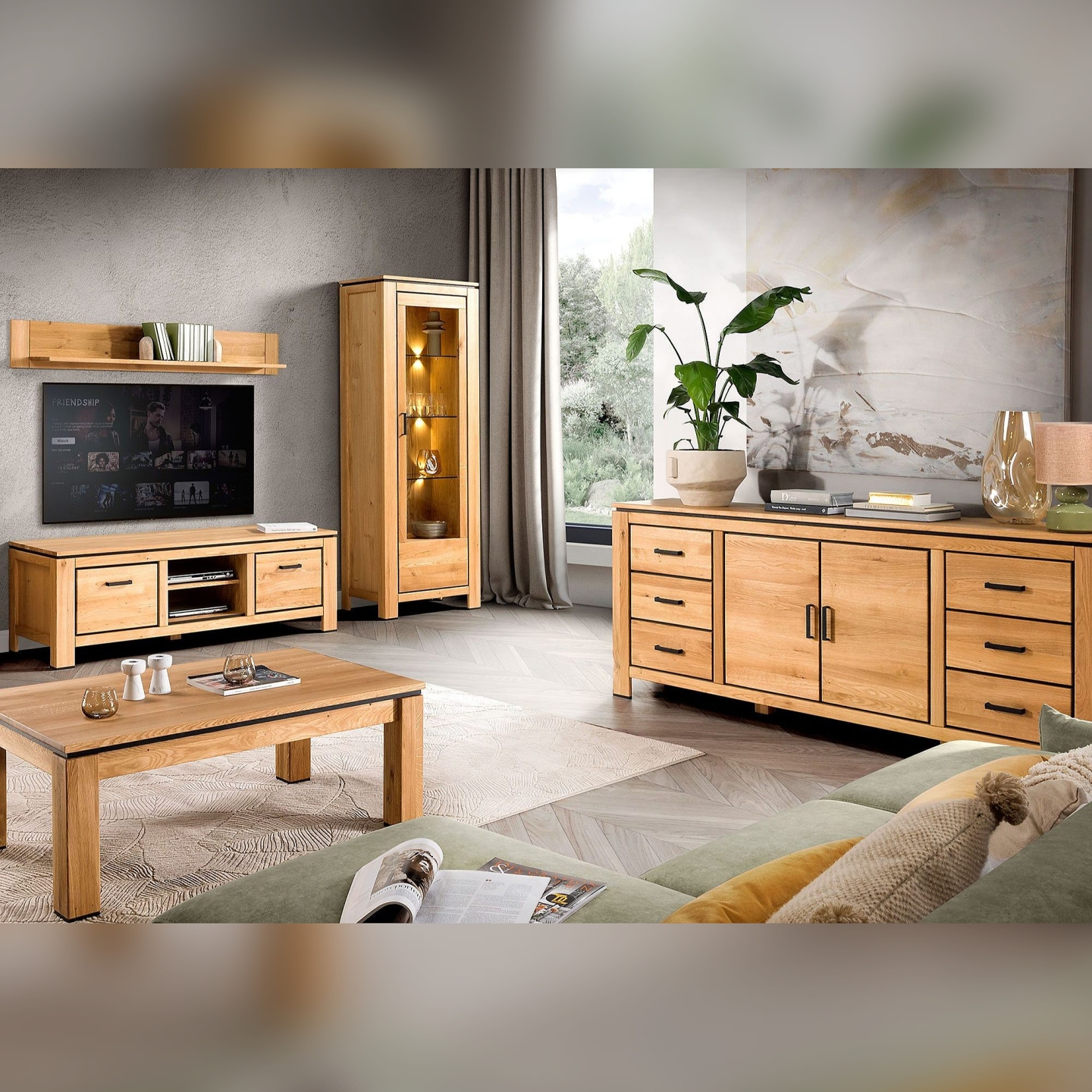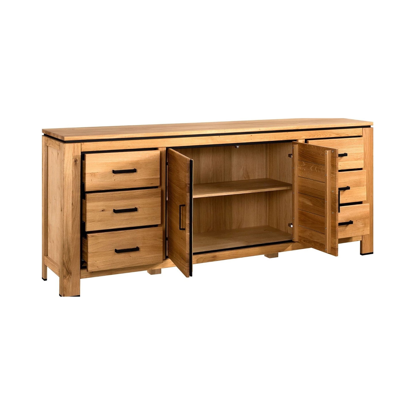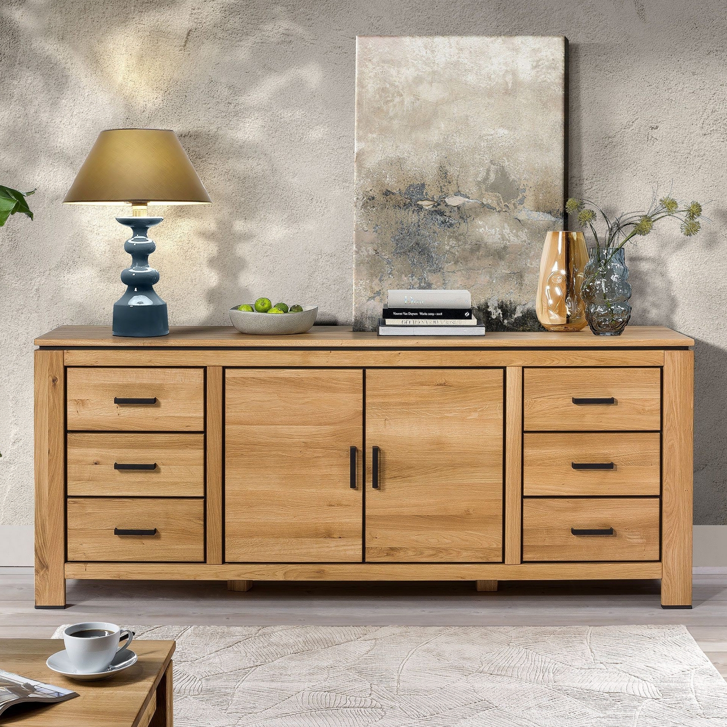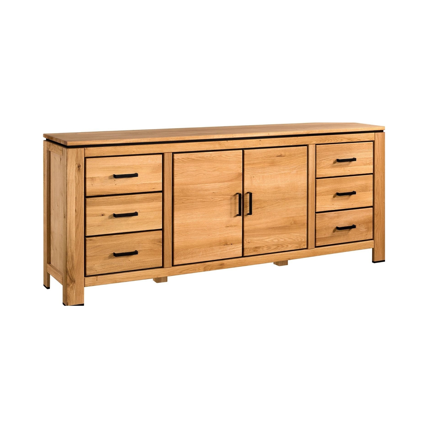 Prezentujemy Komodę Faro II dąb sęczny – solidny i elegancki mebel, który doskonale sprawdzi się w każdym salonie, jadalni czy sypialni, oferując przestronne miejsce do przechowywania i ekspozycji. Wykonana z dbałością o najwyższą jakość, z dębu sęcznego ciętego po długości na frontach i masywnego dębu na wieńcu górnym, komoda ta zachwyca naturalnym pięknem drewna i jego unikalnym usłojeniem. Wykończenie olejem/woskiem natura podkreśla szlachetny charakter dębu, a subtelne czarne akcenty wokół szuflad, drzwi oraz pod wieńcem górnym dodają jej nowoczesności i elegancji. Na załączonym zdjęciu widać masywną konstrukcję komody z trzema szufladami po lewej stronie, dwoma drzwiami w centralnej części i trzema szufladami po prawej stronie.