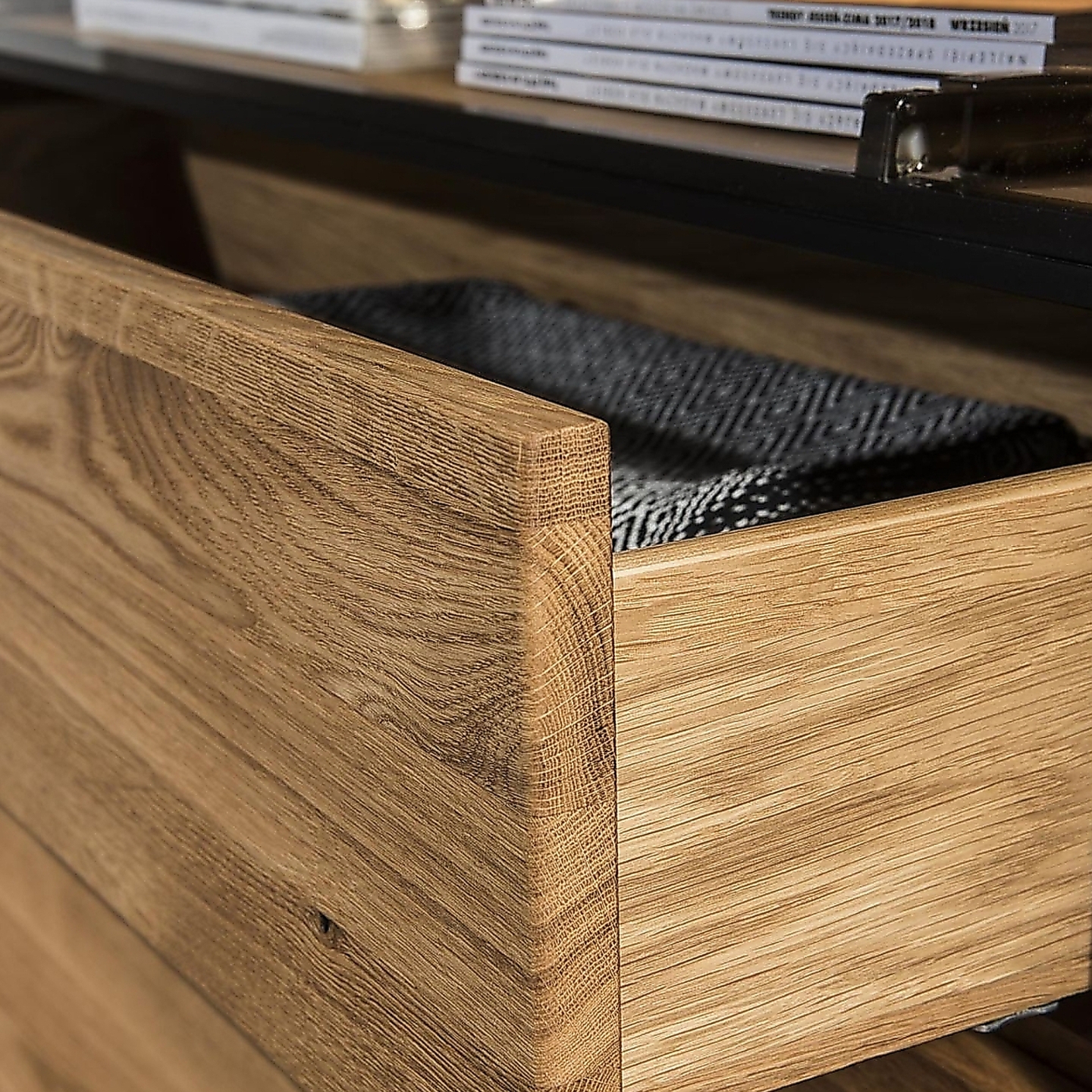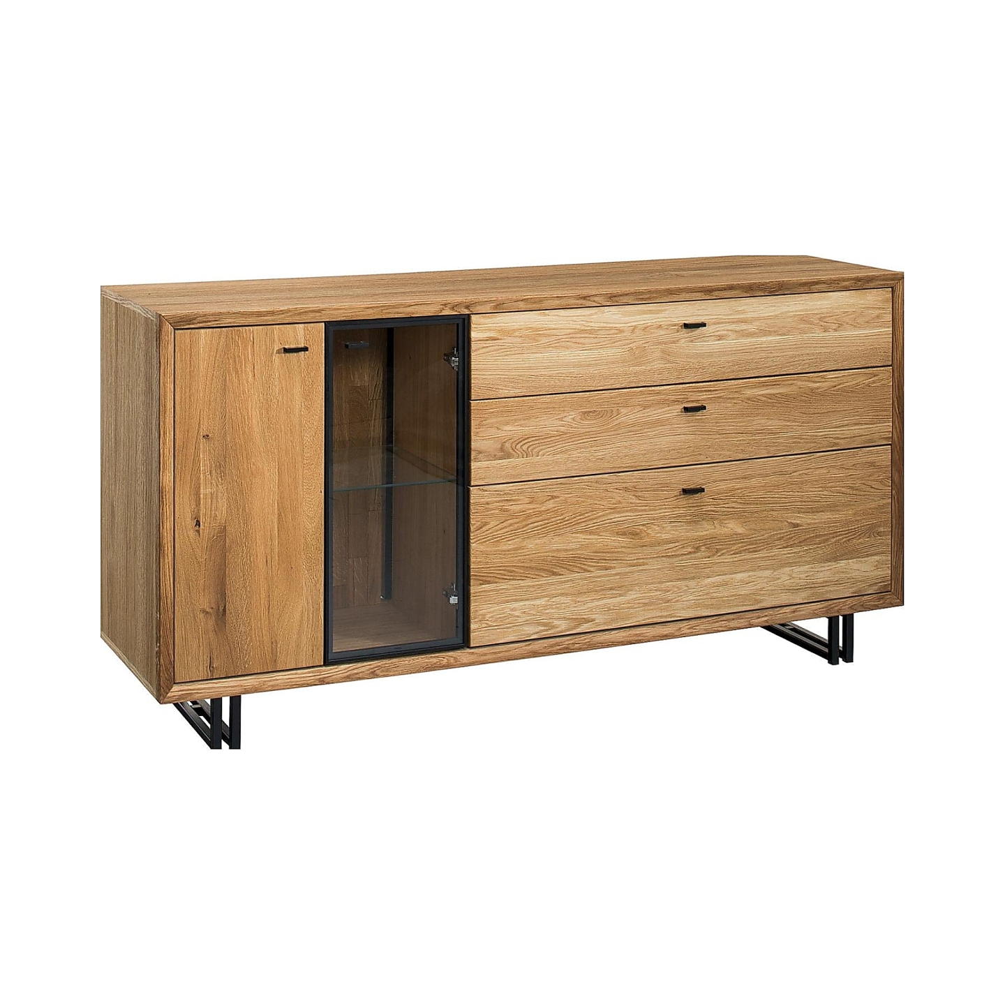 Przedstawiamy imponującą i niezwykle funkcjonalną Komodę IV Vigo, wykonaną z wysokiej jakości drewna dębowego w ciepłym wybarwieniu dąb olej natura. Ta nowoczesna komoda to idealne rozwiązanie do salonu, jadalni czy przestronnej sypialni, łącząca w sobie elegancję z praktycznością. Na załączonym zdjęciu widać, że komoda wyróżnia się harmonijnym połączeniem przeszklonej witryny z szufladami i pełnymi drzwiczkami, co pozwala zarówno na wyeksponowanie ulubionych przedmiotów, jak i na dyskretne przechowywanie. Fronty z litego, sękatego dębu oraz korpus z fornirowanej płyty wiórowej gwarantują trwałość i solidność na lata, a naturalne sęki w drewnie podkreślają jej autentyczny i unikalny charakter. Całość wsparta jest na metalowych, stabilnych nóżkach, które dodają jej lekkości i nowoczesnego charakteru.
