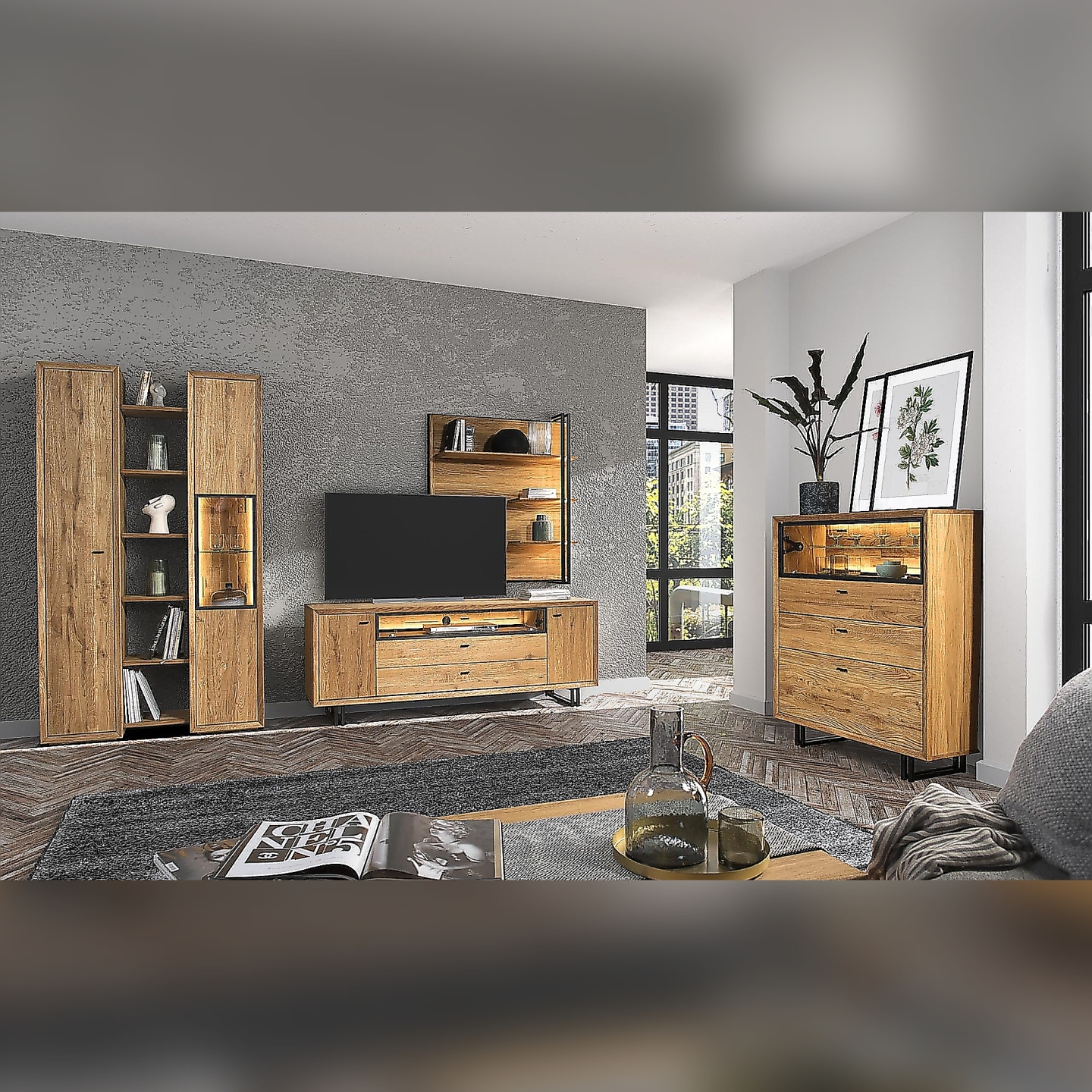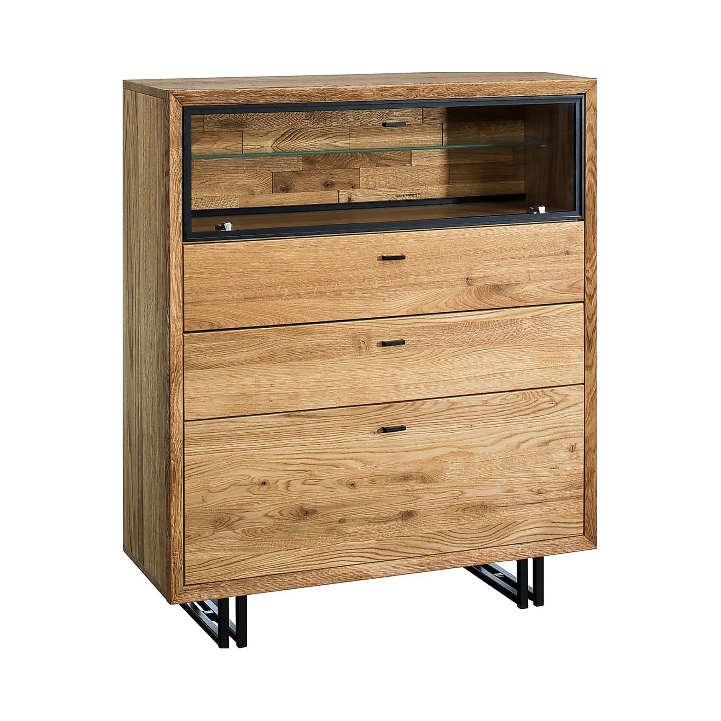 Przedstawiamy elegancką i funkcjonalną Komodę II Vigo, wykonaną z wysokiej jakości drewna dębowego w naturalnym wybarwieniu dąb olej natura. Ta nowoczesna komoda to idealne rozwiązanie do salonu, jadalni czy sypialni, łącząca w sobie pojemność z estetyką. Na załączonym zdjęciu widać, że komoda wyróżnia się harmonijnym połączeniem przeszklonej witryny w górnej części oraz trzech pojemnych szuflad poniżej, co pozwala zarówno na wyeksponowanie ulubionych przedmiotów, jak i na dyskretne przechowywanie. Fronty z litego, sękatego dębu oraz korpus z fornirowanej płyty wiórowej gwarantują trwałość i solidność na lata, a naturalne sęki w drewnie podkreślają jej autentyczny i unikalny charakter. Całość wsparta jest na metalowych, stabilnych nóżkach, które dodają jej lekkości i nowoczesnego charakteru.