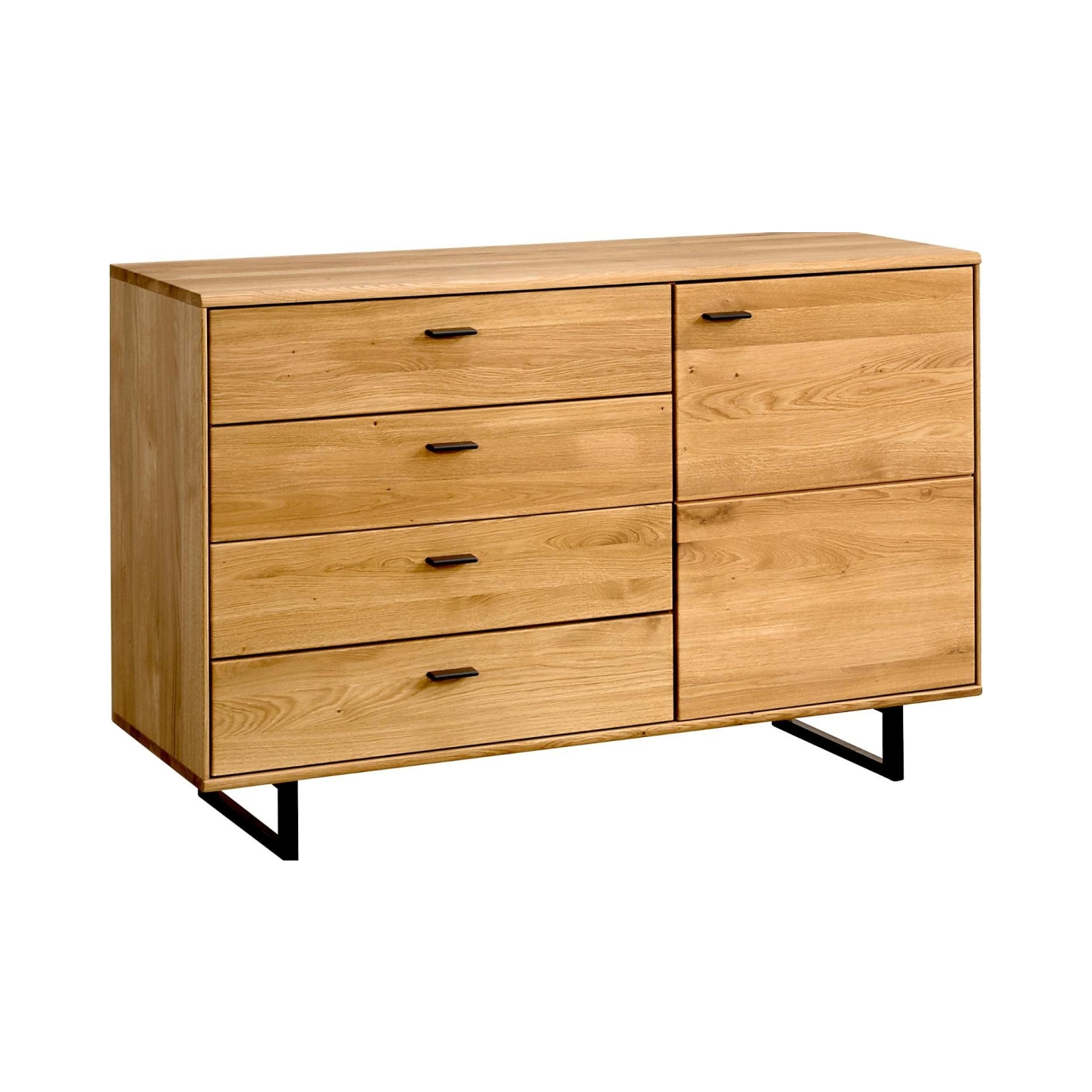 Przedstawiamy Komodę I Tramonto dębową – mebel, który harmonijnie łączy w sobie surową elegancję naturalnego drewna z nowoczesnym, industrialnym akcentem. Ta solidna i pojemna komoda, widoczna na załączonym zdjęciu, została wykonana z dębu sęcznego ciętego po długości i szczotkowanego, co podkreśla jego naturalne piękno i unikalną fakturę. Jej przemyślana konstrukcja i wysokiej jakości materiały gwarantują trwałość i funkcjonalność na lata, czyniąc ją doskonałym wyborem do każdego wnętrza, od salonu po sypialnię czy jadalnię.