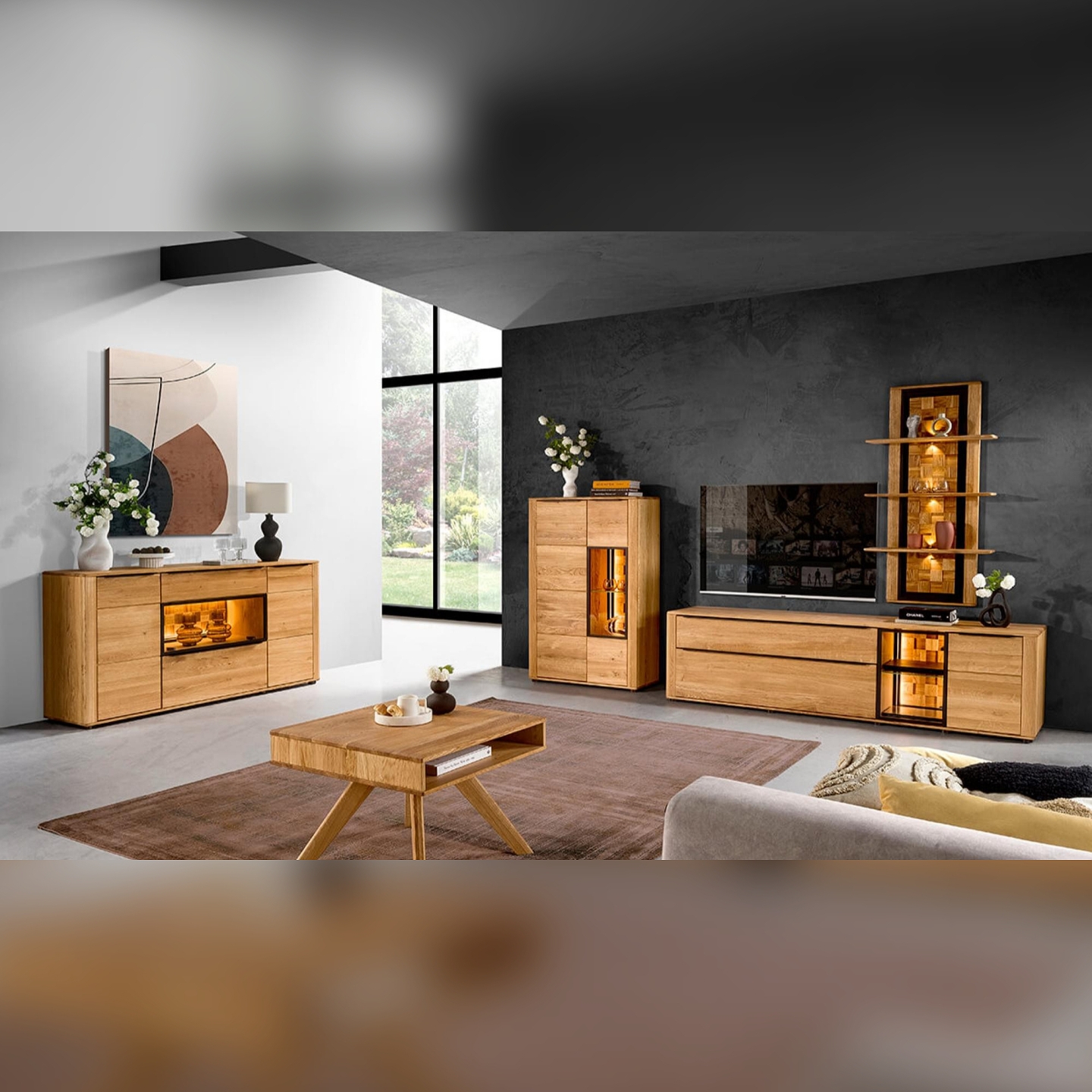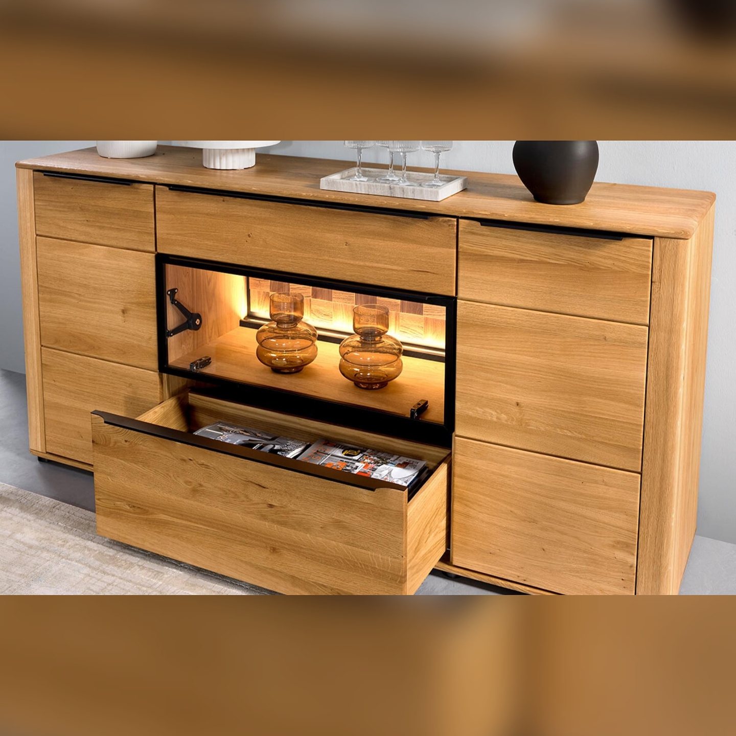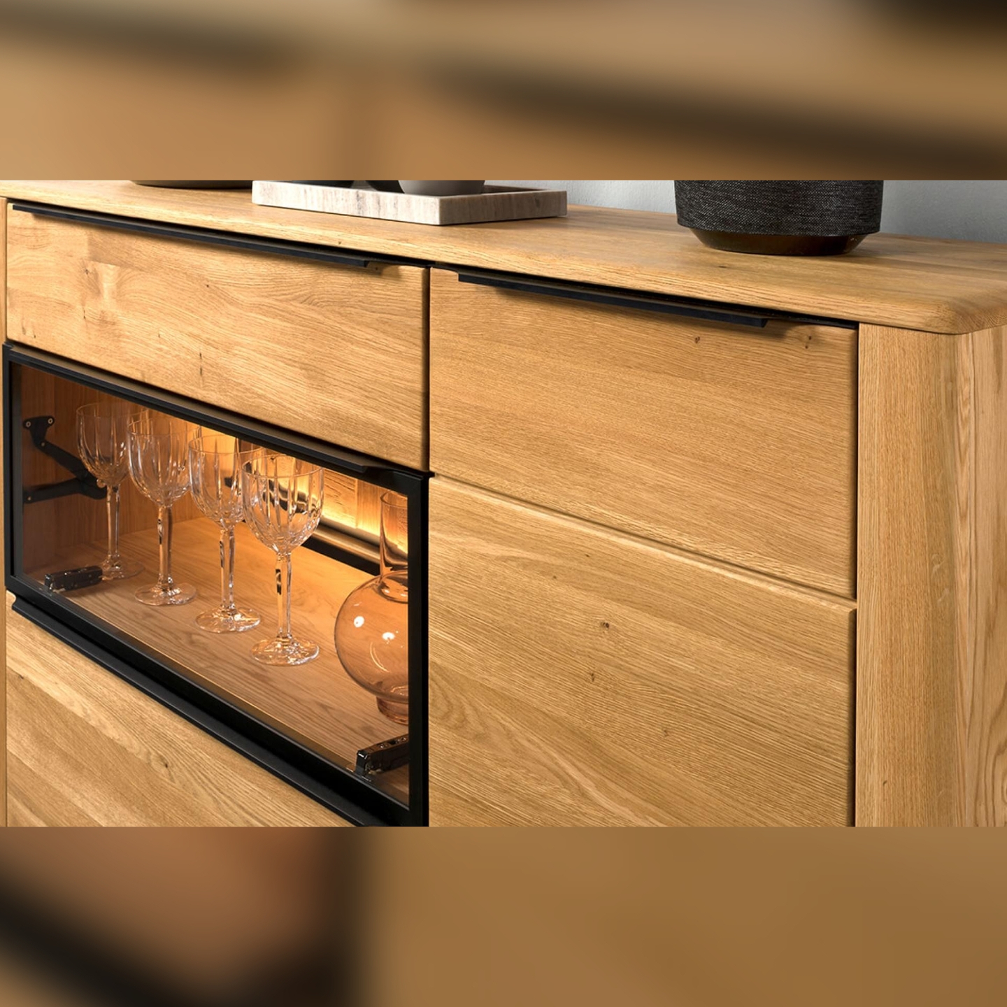 Przedstawiamy Komodę II nowoczesną Luna – idealne rozwiązanie do przestronnych salonów i jadalni, które potrzebują zarówno funkcjonalności, jak i wyrafinowanego designu. Widoczna na zdjęciu komoda zachwyca szerokością 182,8 cm, oferując obszerną przestrzeń do przechowywania. Wykonana z dębu sęcznego ciętego po długości na frontach oraz płyty wiórowej z fornirem dębowym na korpusie, gwarantuje trwałość i naturalne piękno. Jej szczotkowana powierzchnia wykończona olejem natura podkreśla unikalny rysunek drewna, nadając meblowi szlachetnego charakteru.