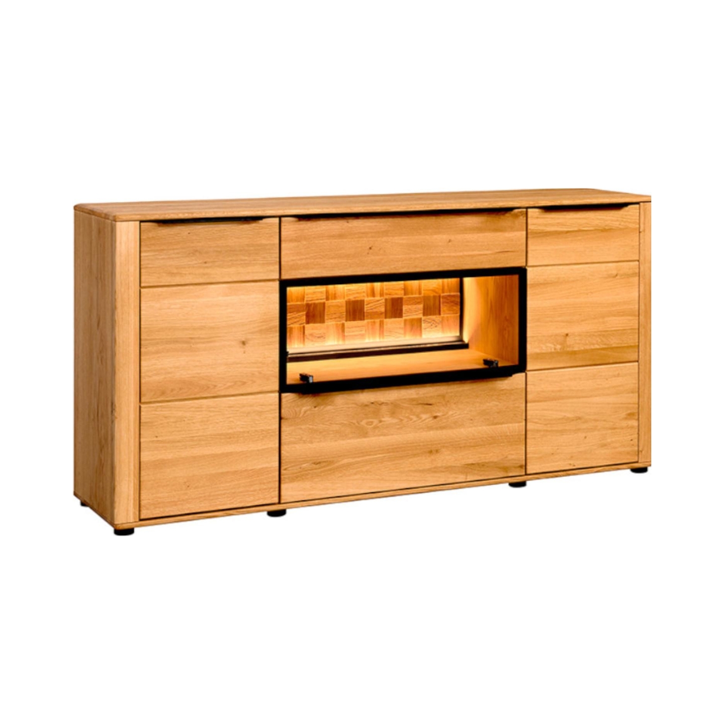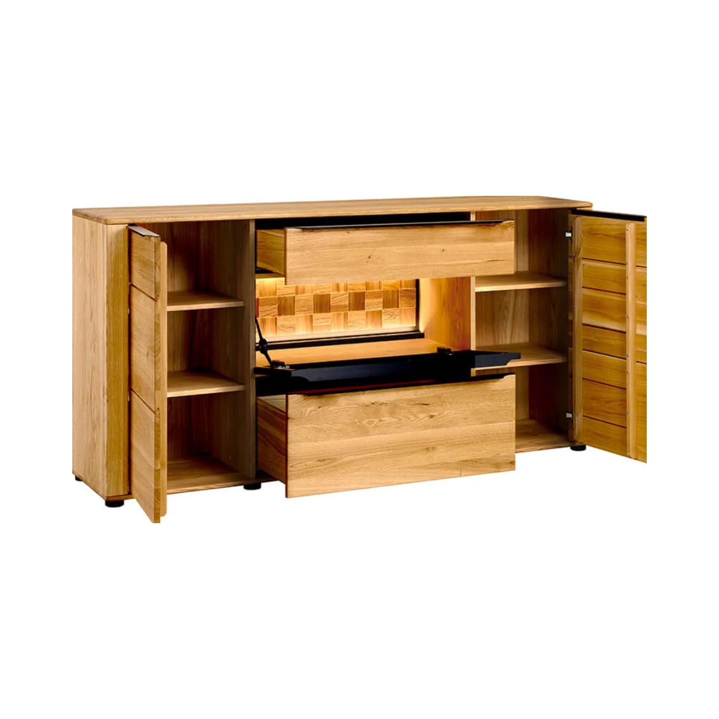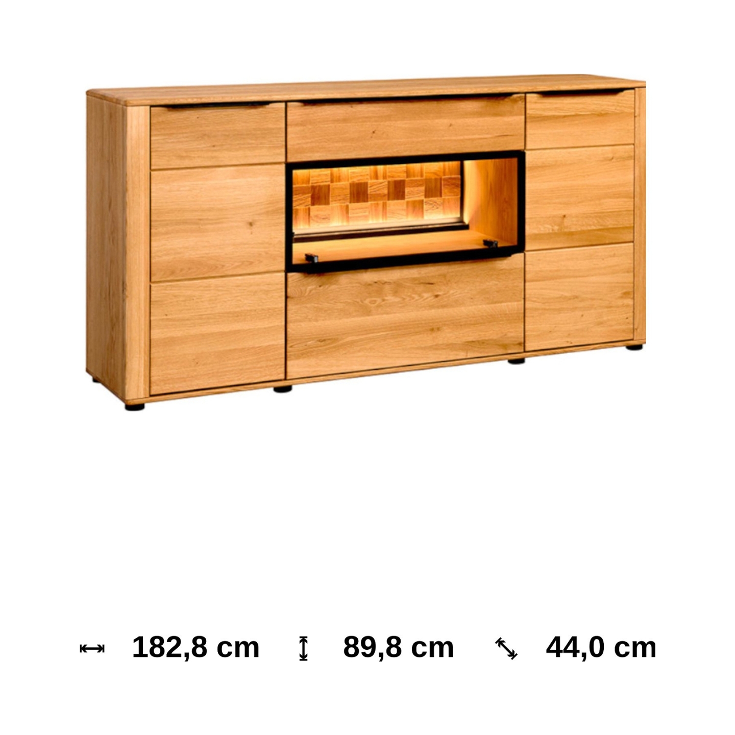 Przedstawiamy Komodę II nowoczesną Luna – idealne rozwiązanie do przestronnych salonów i jadalni, które potrzebują zarówno funkcjonalności, jak i wyrafinowanego designu. Widoczna na zdjęciu komoda zachwyca szerokością 182,8 cm, oferując obszerną przestrzeń do przechowywania. Wykonana z dębu sęcznego ciętego po długości na frontach oraz płyty wiórowej z fornirem dębowym na korpusie, gwarantuje trwałość i naturalne piękno. Jej szczotkowana powierzchnia wykończona olejem natura podkreśla unikalny rysunek drewna, nadając meblowi szlachetnego charakteru.