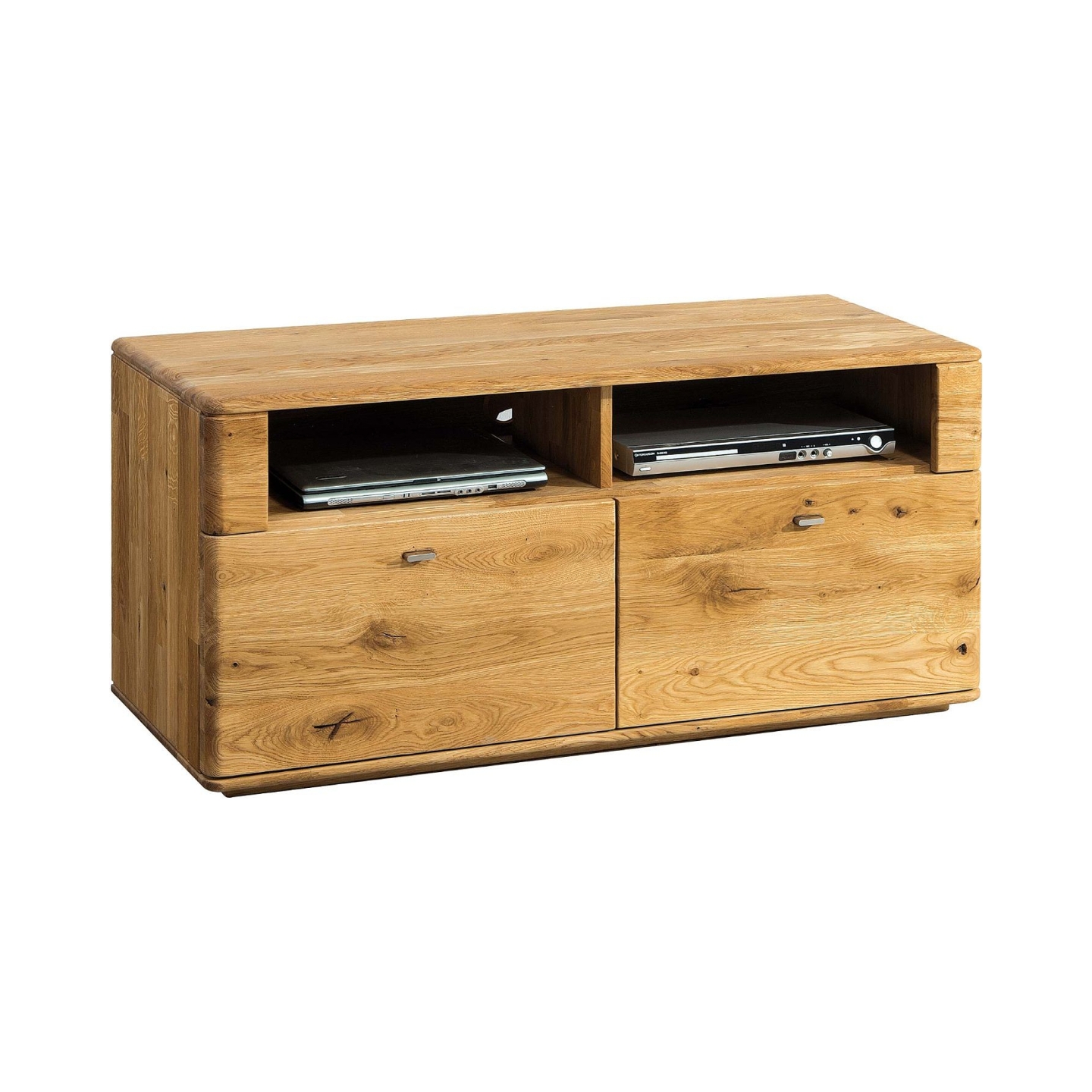 Prezentujemy Państwu stylową i funkcjonalną szafkę RTV Denver I, wykonaną z wysokiej jakości drewna dębowego. Ten nowoczesny i elegancki mebel to doskonałe rozwiązanie do każdego salonu, dodając mu ciepła i naturalnego uroku. Fronty szafki wykonane są z litego drewna dębowego o charakterystycznym rysunku sękatej deski, a korpus również z litego dębu, co gwarantuje wyjątkową trwałość i solidność na lata. Dostępna jest w dwóch pięknych wybarwieniach: klasyczny dąb naturalny lub głęboki dąb palony, co pozwala idealnie dopasować szafkę do indywidualnych preferencji. Powierzchnia mebla jest starannie wykończona woskiem lub olejem, a także szczotkowana, co uwydatnia naturalne słoje drewna i nadaje jej niepowtarzalny charakter. Na załączonym zdjęciu widoczna jest szafka z dwoma otwartymi półkami na sprzęt multimedialny oraz dwiema pojemnymi szufladami, co zapewnia optymalną przestrzeń do organizacji.