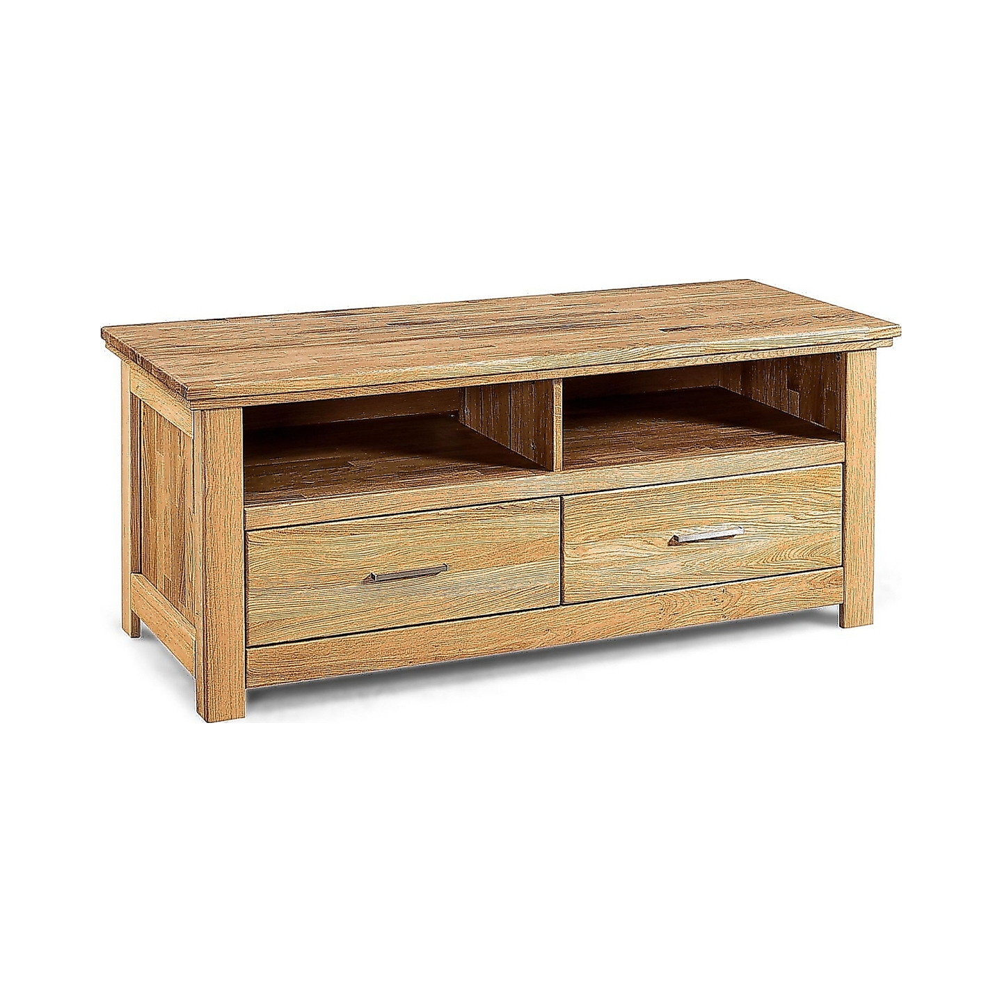 Szafka RTV dębowa I Porto olej natura to stabilny mebel z masywu dębowego, który łączy trwałą konstrukcję z funkcjonalnym układem dwóch otwartych wnęk i dwóch szuflad. Front z litego dębu oraz korpus z dębu mikrowczep zapewniają odporność na obciążenia i spójny, naturalny wygląd. Wykończenie olejem natura podkreśla rysunek drewna i ułatwia bieżącą pielęgnację.