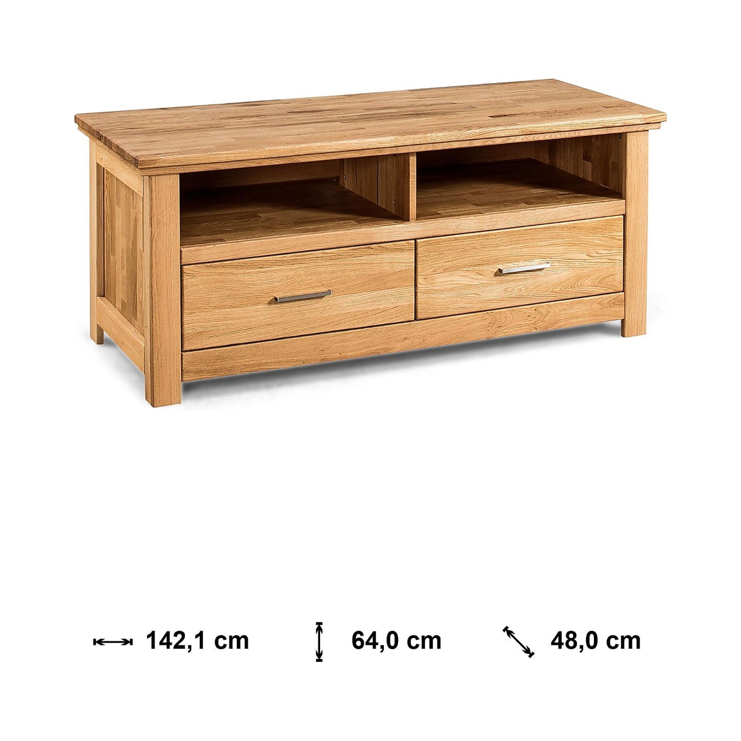 | Dodatkowe informacje | Masyw dębowy (mikrowczep – korpus, lity dąb – front), 2 szuflady, 2 otwarte wnęki, cena nie zawiera oświetlenia |
