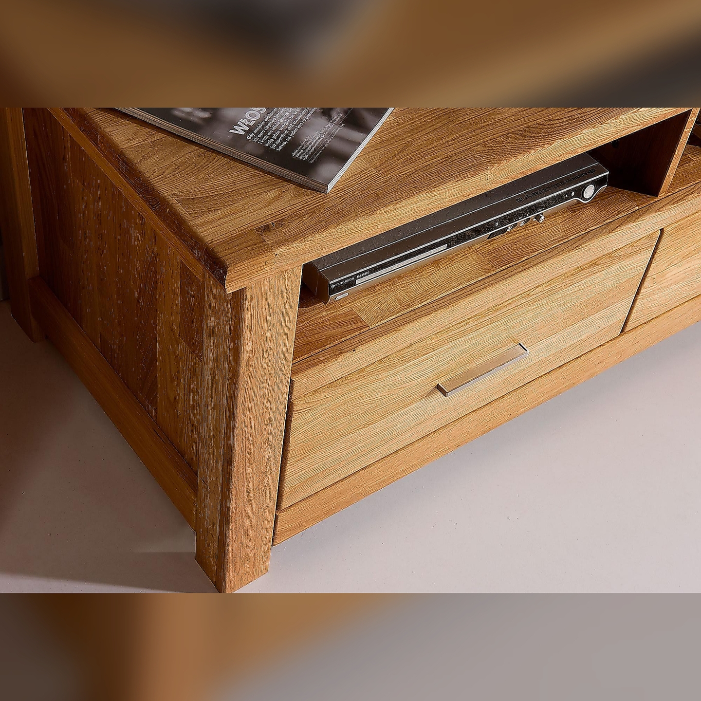 Korpus i front wykonane z litego dębu łączonego w technologii mikrowczep zapewniają trwałość i odporność na codzienne użytkowanie. Głębokie półki, duża szuflada i otwarta wnęka pozwalają wygodnie uporządkować dekoder, router, przewody i akcesoria, a otwarta przestrzeń ułatwia dostęp do sprzętu używanego na co dzień.