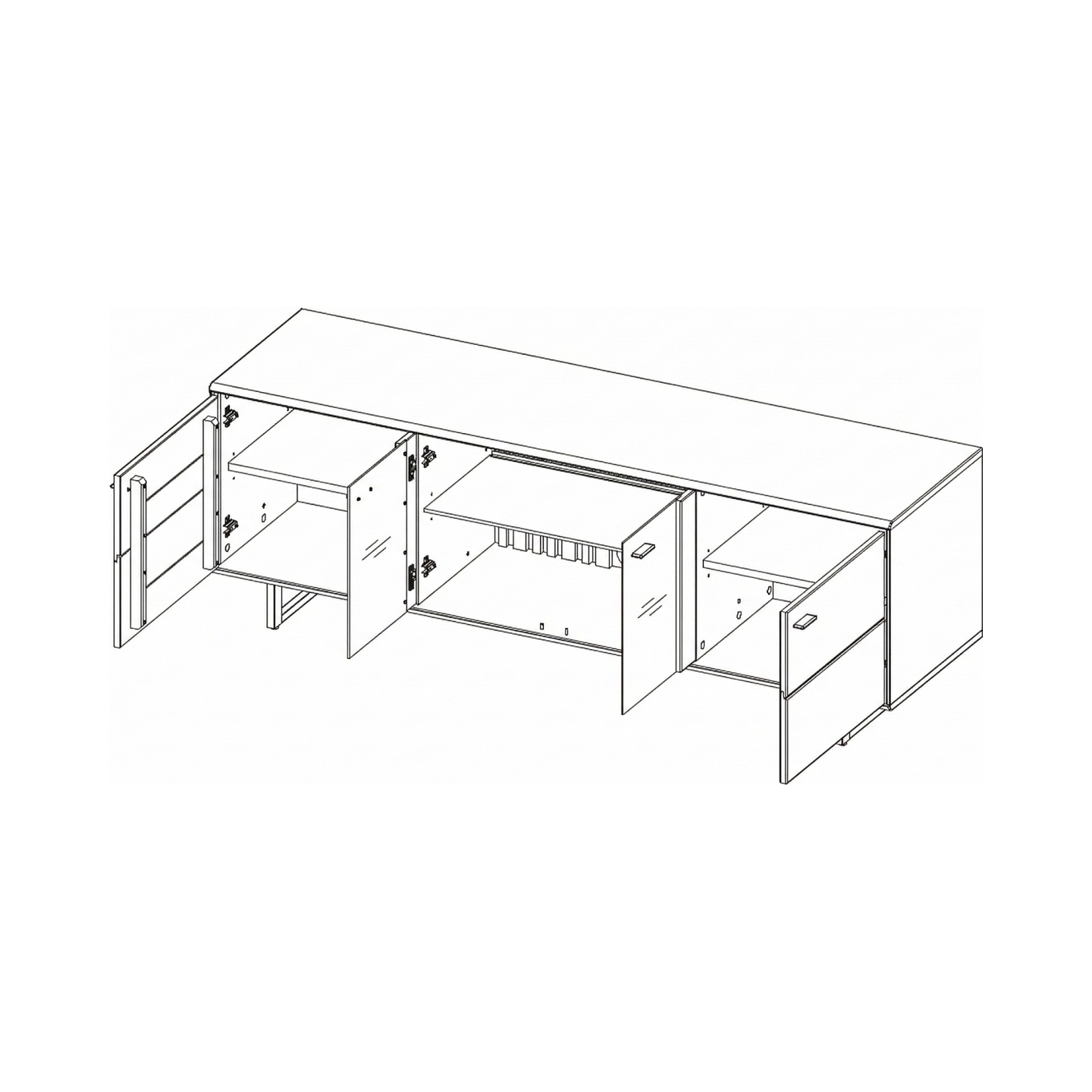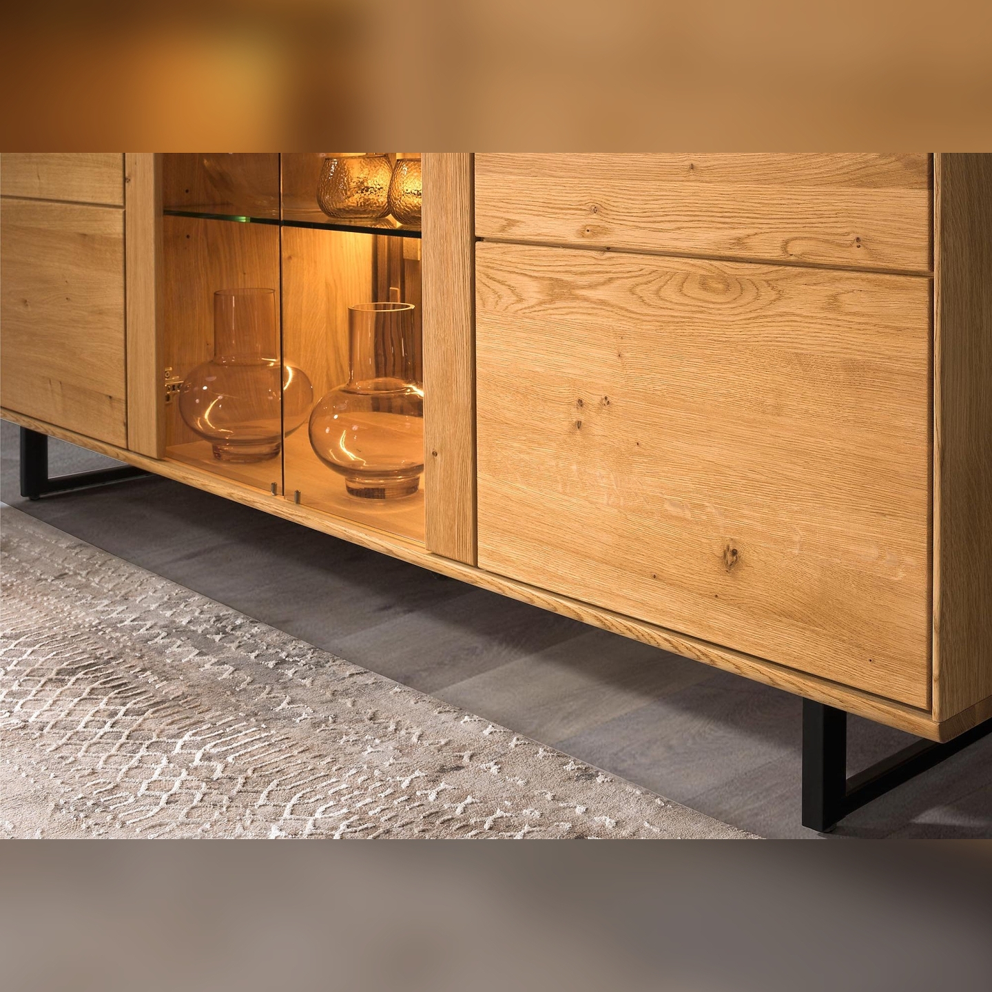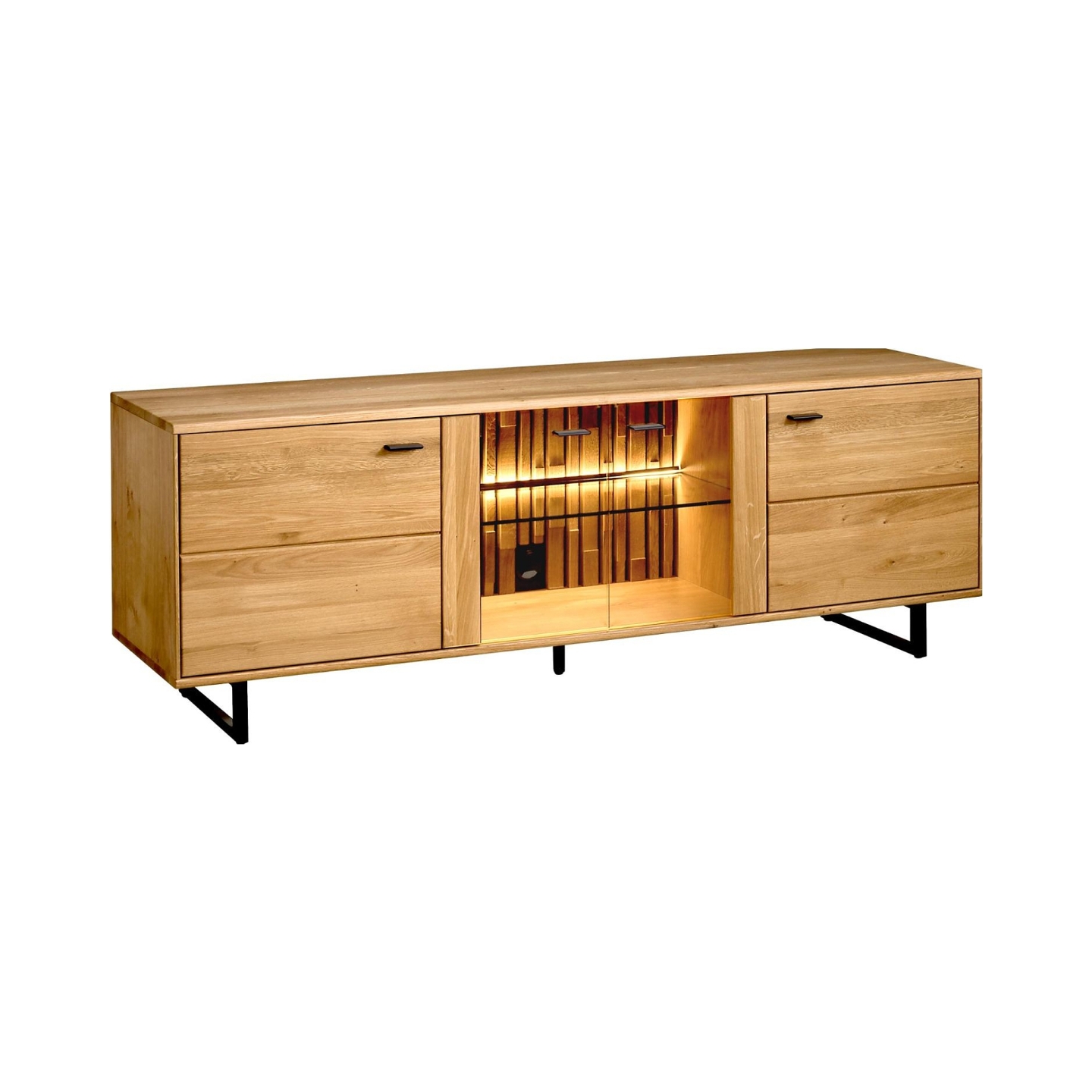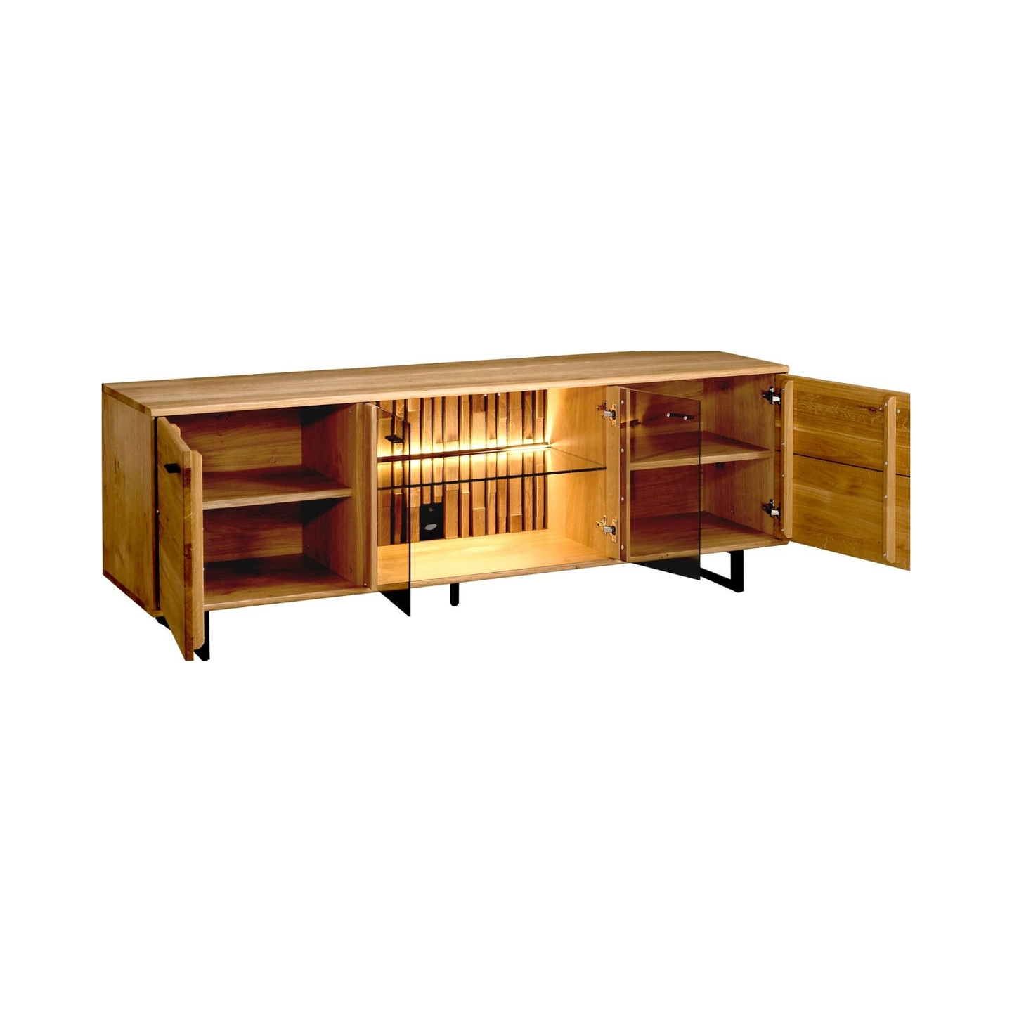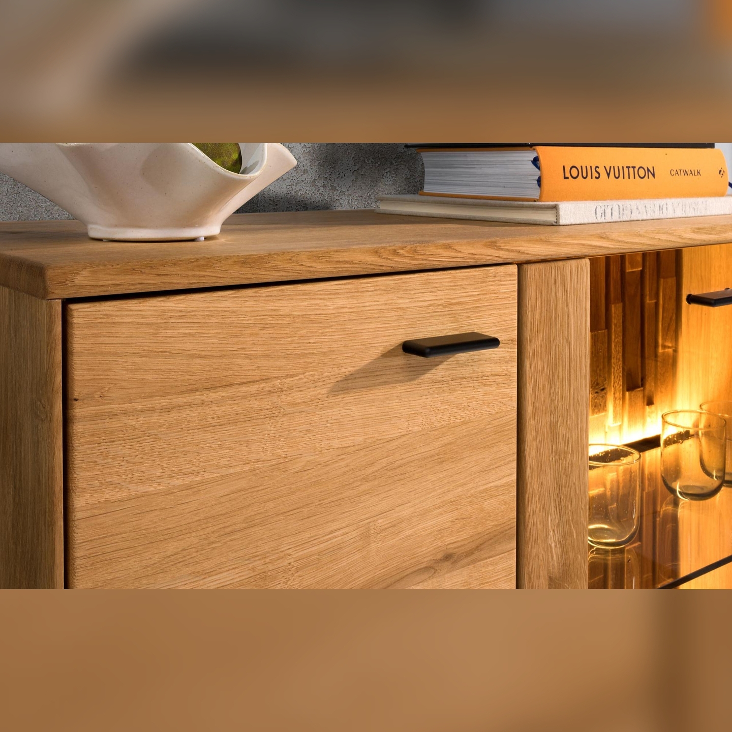 Prezentujemy Szafkę RTV II dębową Tramonto, która stanowi idealne połączenie funkcjonalności, naturalnego piękna drewna dębowego oraz nowoczesnego designu z metalowymi akcentami i zintegrowanym oświetleniem. Ta elegancka szafka RTV, widoczna na załączonym zdjęciu z efektownym podświetleniem centralnej wnęki, jest perfekcyjnym rozwiązaniem do każdego salonu, oferując przestronne miejsce na sprzęt multimedialny i akcesoria. Drzwi i wieniec wykonane są z dębu sęcznego ciętego po długości i szczotkowanego, co podkreśla unikalny rysunek drewna, a listwy ściany tylnej z dębu sęcznego mikrowczepu dodatkowo wzmacniają estetykę mebla. Całość wykończona jest olejem/woskiem natura, co wydobywa głębię koloru i naturalne piękno dębu.