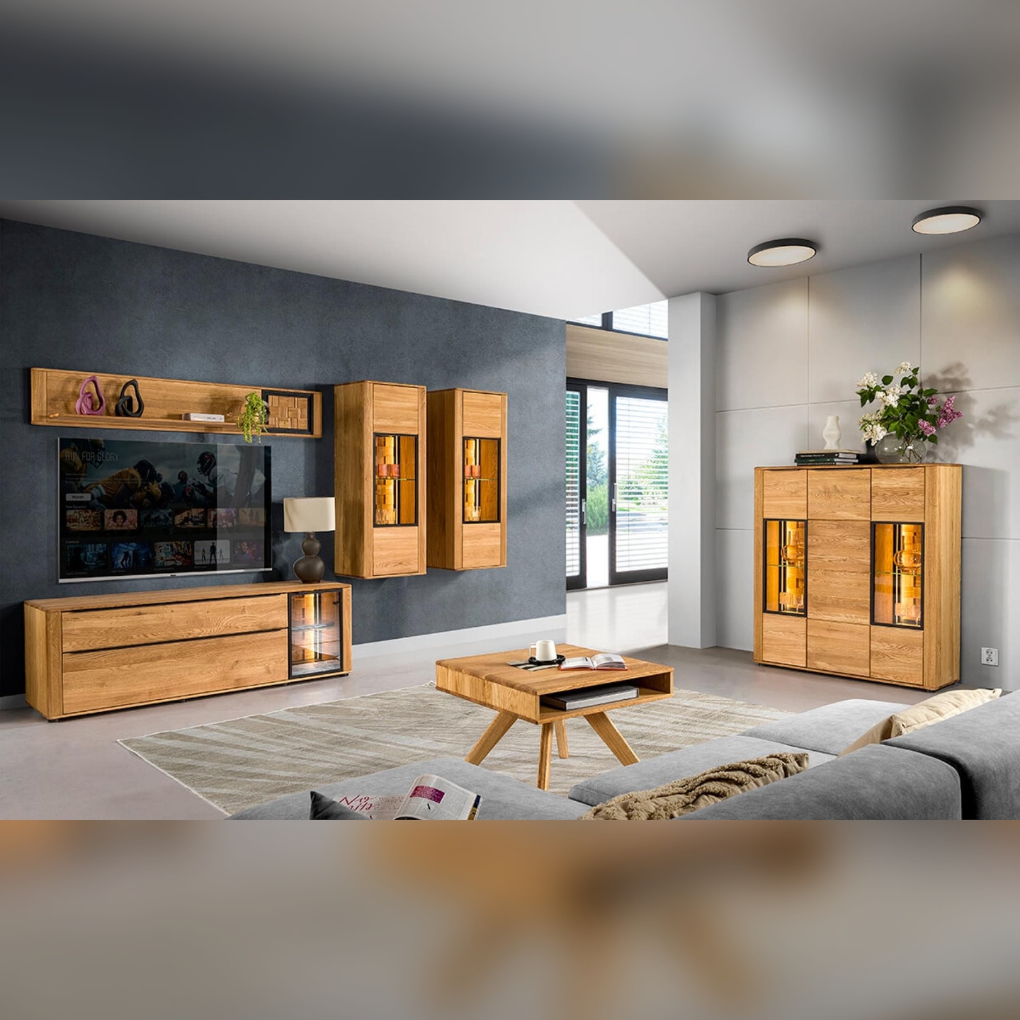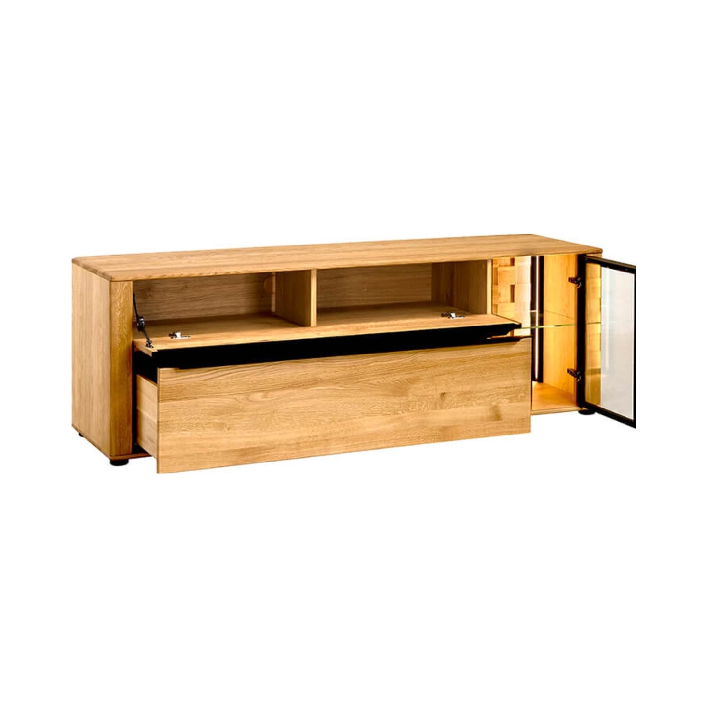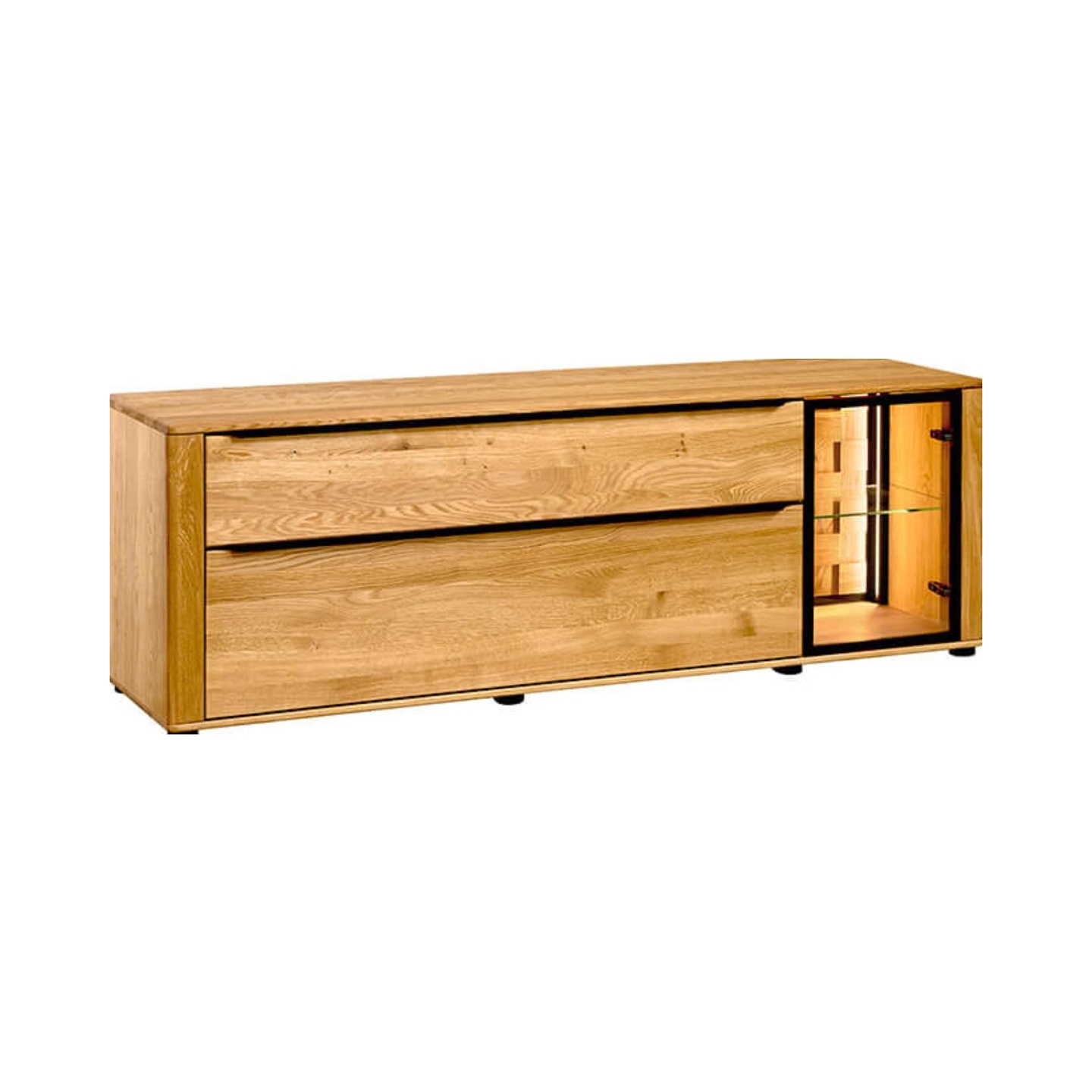 Wzbogać swój salon o nowoczesną i funkcjonalną szafkę RTV II Luna, która doskonale łączy elegancję dębu z innowacyjnym designem. Prezentowana na zdjęciu szafka, z eleganckim oświetleniem w bocznej witrynie, stanowi centralny punkt każdego wnętrza. Wykonana z dębu sęcznego ciętego po długości (fronty) oraz płyty wiórowej fornirowanej dębem sęcznym (korpus), jest synonimem trwałości i naturalnego piękna. Jej szczotkowana powierzchnia i wykończenie naturalnym olejem podkreślają unikalne usłojenie drewna, nadając meblowi ciepłego i szlachetnego wyglądu. Z dwiema przestronnymi szufladami i przeszkloną witryną boczną z oświetleniem, szafka Luna oferuje mnóstwo miejsca do przechowywania sprzętu RTV, płyt czy akcesoriów, jednocześnie eksponując ulubione dekoracje. Jest to mebel dostarczany w całości, zmontowany i gotowy do natychmiastowego użytku, co oszczędza Twój czas i wysiłek.