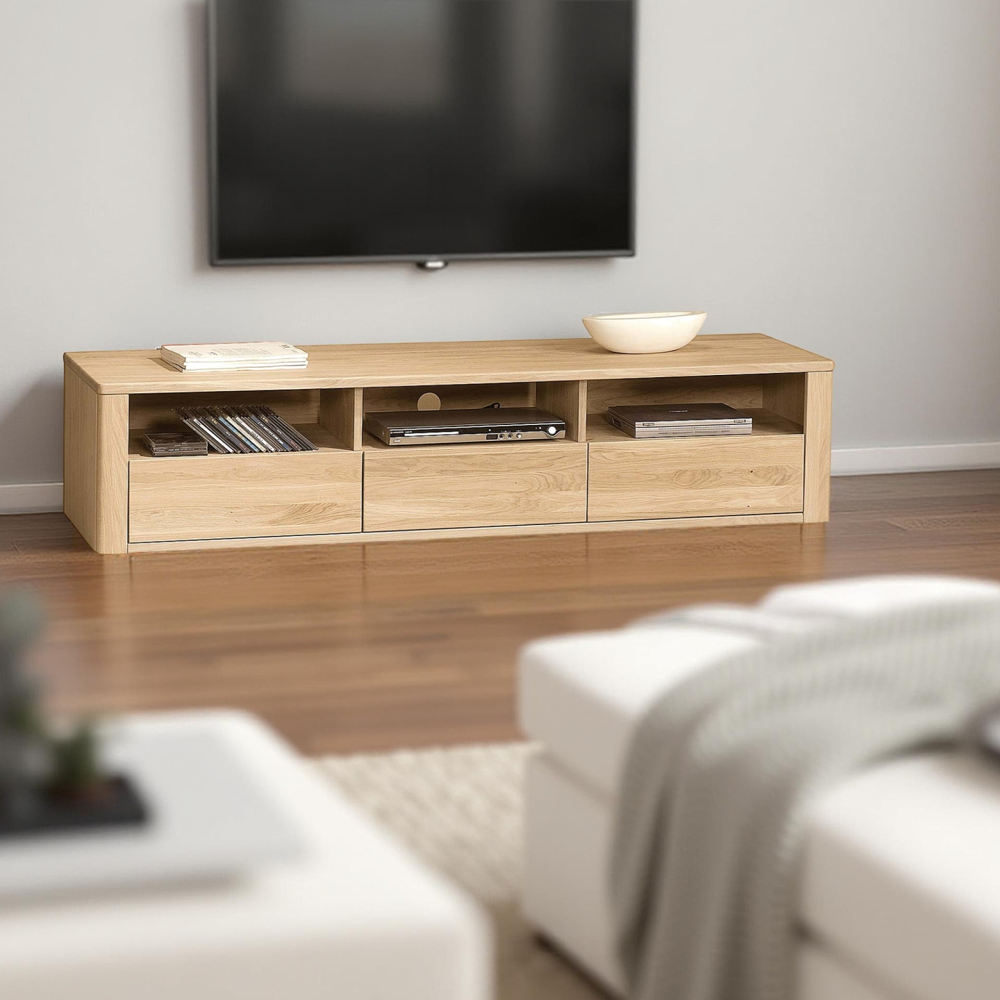 Podnieś estetykę swojego salonu z szafką RTV II dębową Orlando w nowoczesnym wykończeniu olej bianco. Ta przestronna i funkcjonalna szafka, wyposażona w trzy szuflady, jest idealnym rozwiązaniem do przechowywania sprzętu multimedialnego oraz akcesoriów w sposób uporządkowany i elegancki. Jasne, rozbielone drewno dębowe doskonale wpasuje się w jasne i przestronne wnętrza, dodając im lekkości i skandynawskiego uroku. Dzięki solidnemu wykonaniu z dębu, szafka RTV Orlando gwarantuje trwałość i stabilność, będąc zarówno praktycznym meblem, jak i centralnym punktem każdej przestrzeni wypoczynkowej. Widoczna na zdjęciach, szafka prezentuje się jako spójny element wystroju salonu.