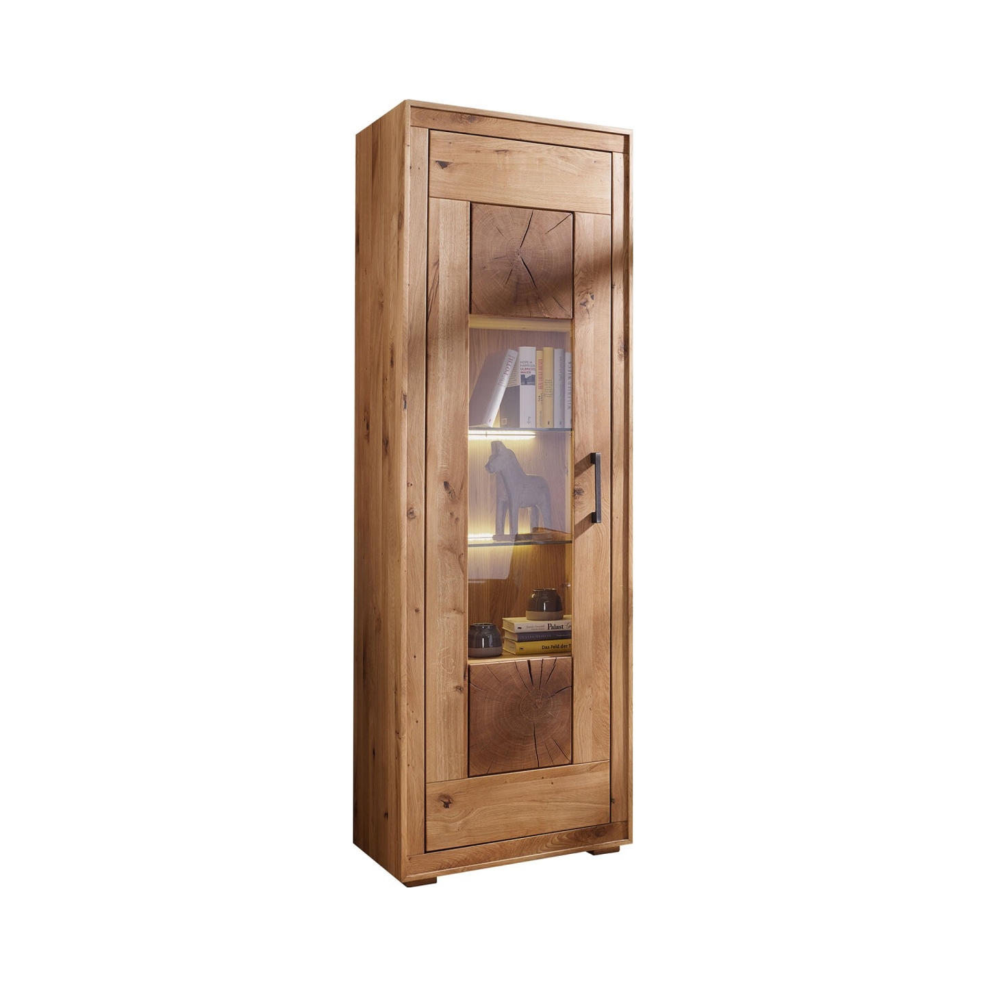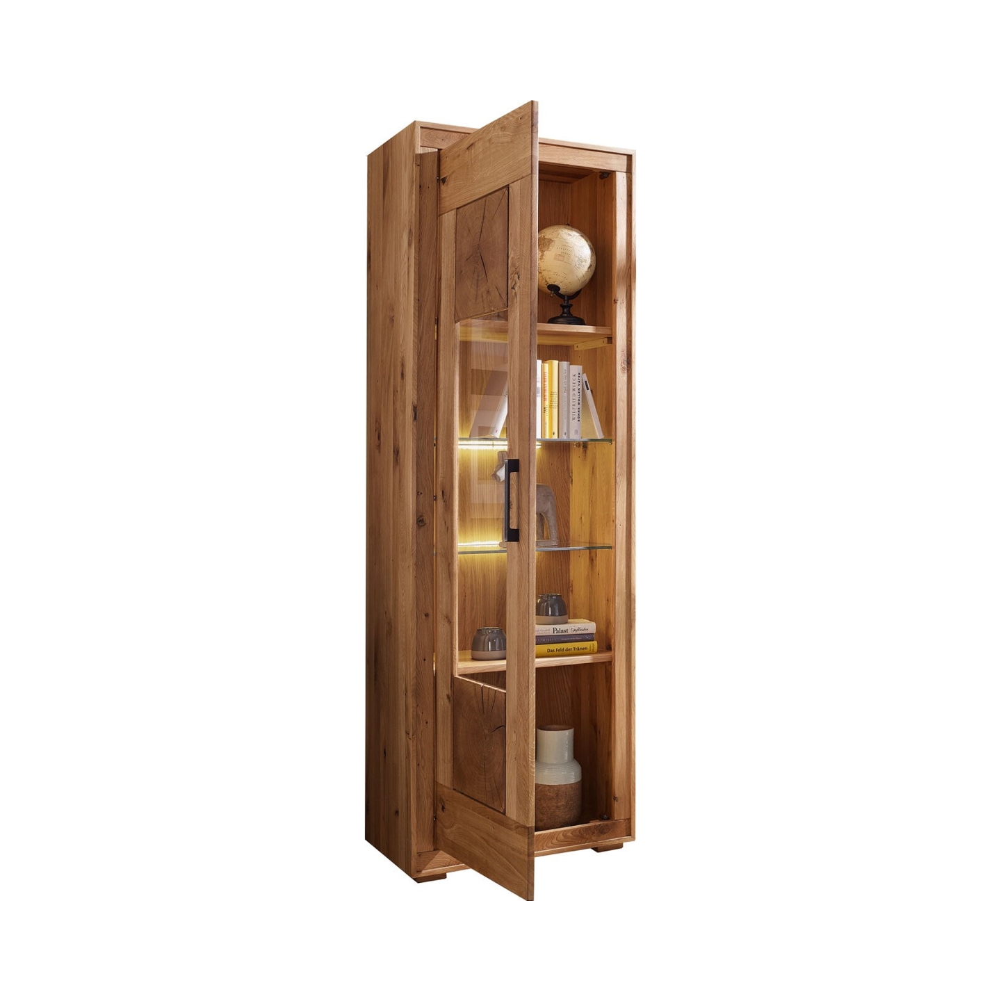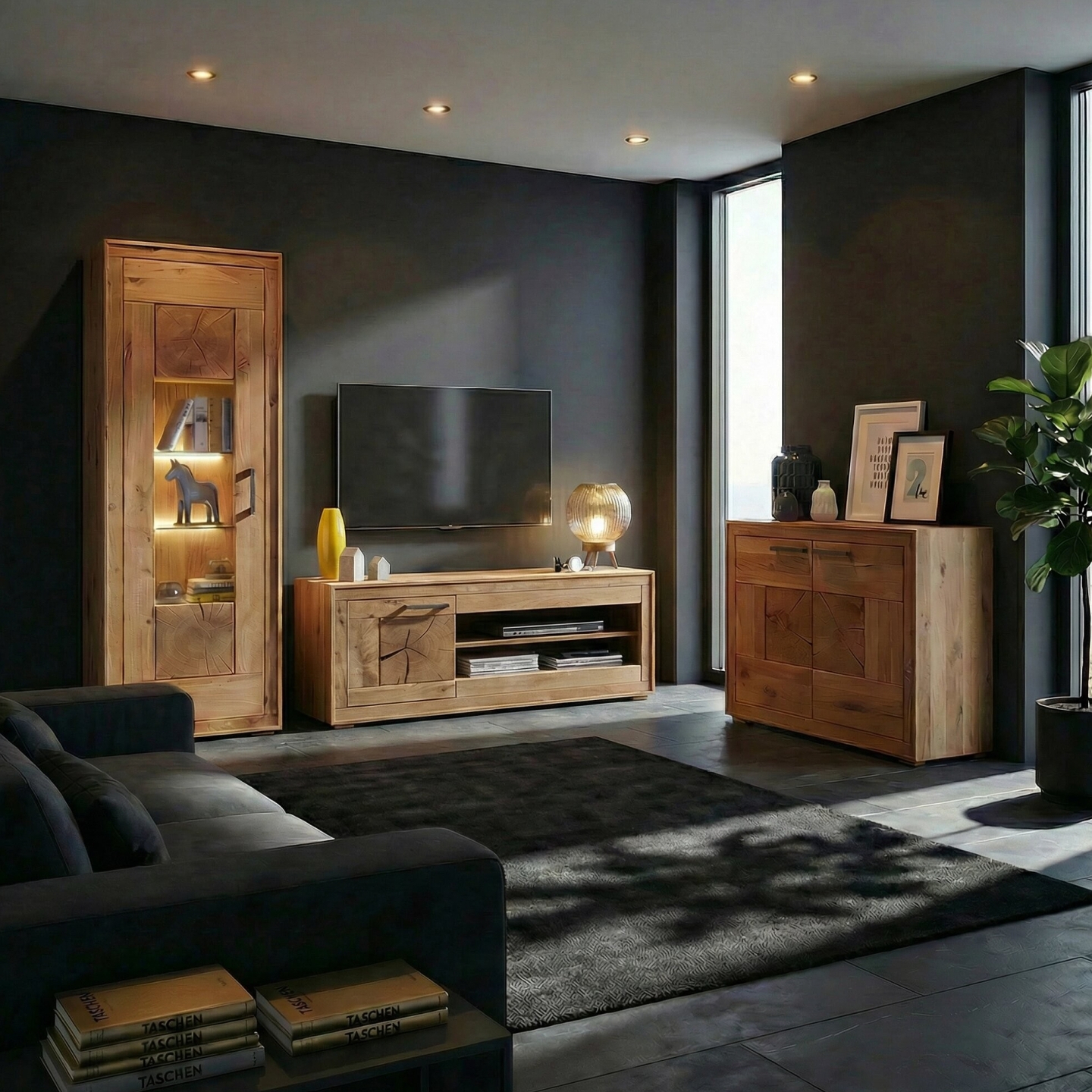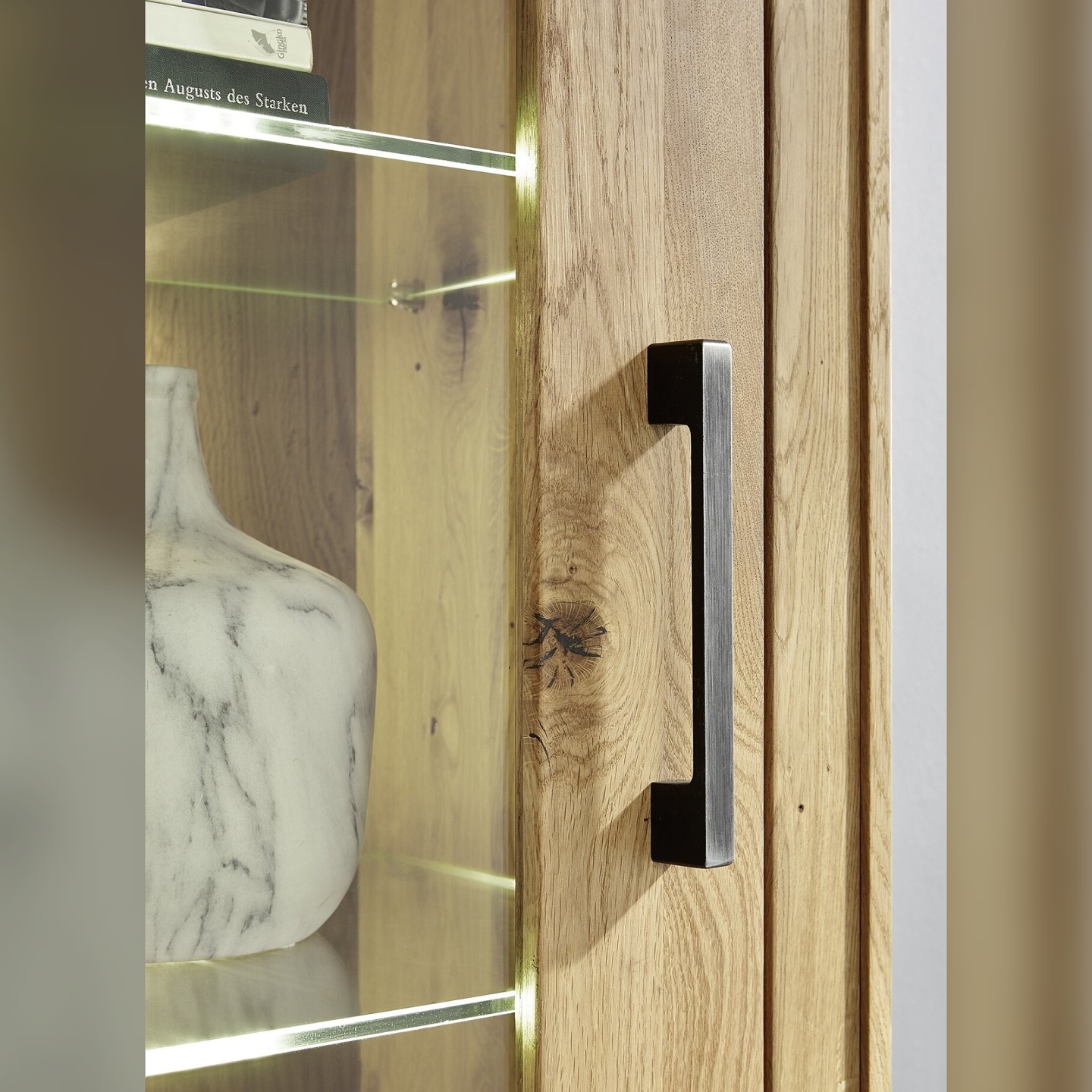 Witryna Dębowa I Andromeda powstaje w całości z litego dębu polskiego pochodzenia, dzięki czemu nie odkształca się z czasem i zachowuje naturalny rysunek drewna. Przeszklony front pozwala eksponować dekoracje, książki lub porcelanę, a solidna konstrukcja gwarantuje stabilność przez długie lata.