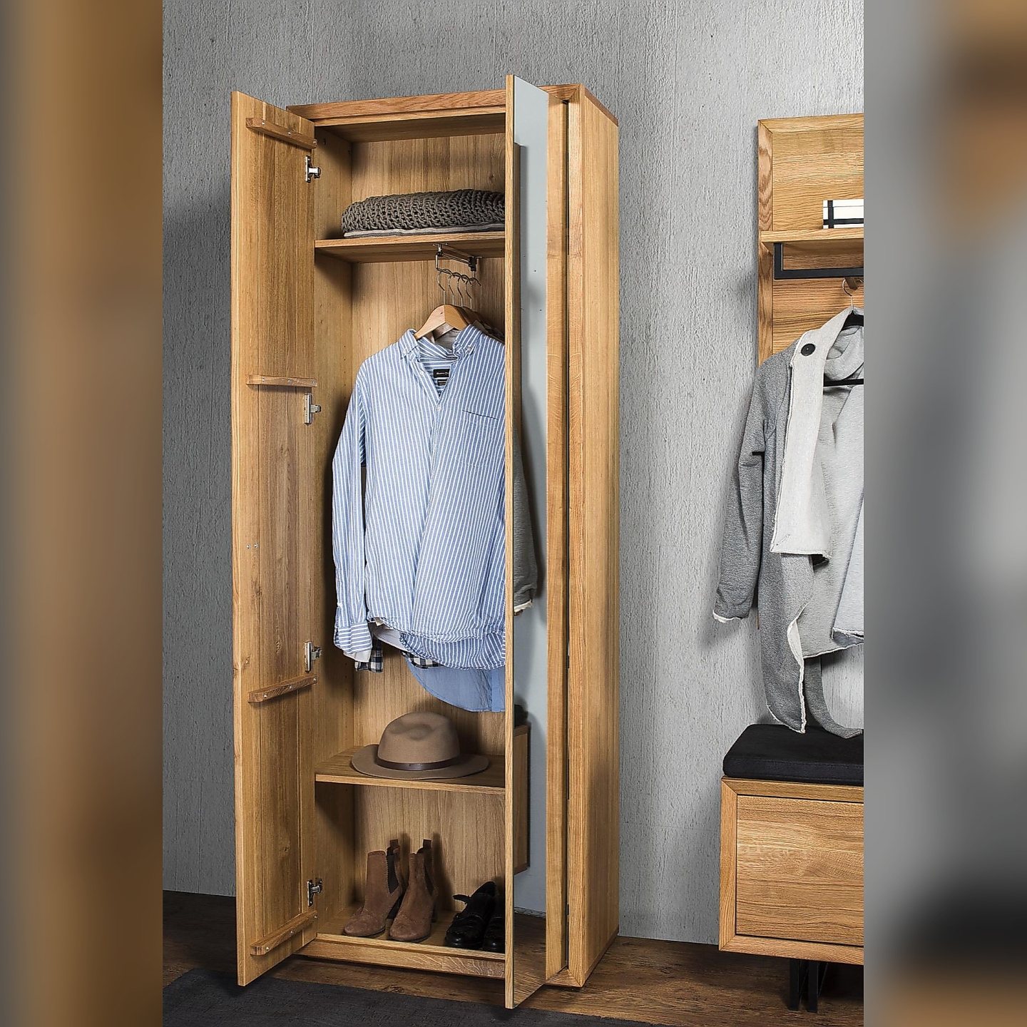 Odkryj połączenie funkcjonalności i naturalnego piękna z naszą nową szafą na ubrania Vigo w odcieniu dąb olej natura. Ta stylowa szafa została wykonana z najwyższej jakości litego drewna dębowego na frontach oraz trwałej fornirowanej płyty wiórowej na korpusie, co gwarantuje jej solidność i wytrzymałość. Naturalna okleina w kolorze dąb natura, wykończona woskiem lub olejem i subtelnie szczotkowana, podkreśla unikalny charakter drewna. Prezentowana na zdjęciu wysoka szafa z jednymi drzwiami drewnianymi i jednymi z lustrem to idealne rozwiązanie do każdej sypialni lub garderoby, oferując zarówno przestrzeń do przechowywania ubrań, jak i praktyczne lustro.