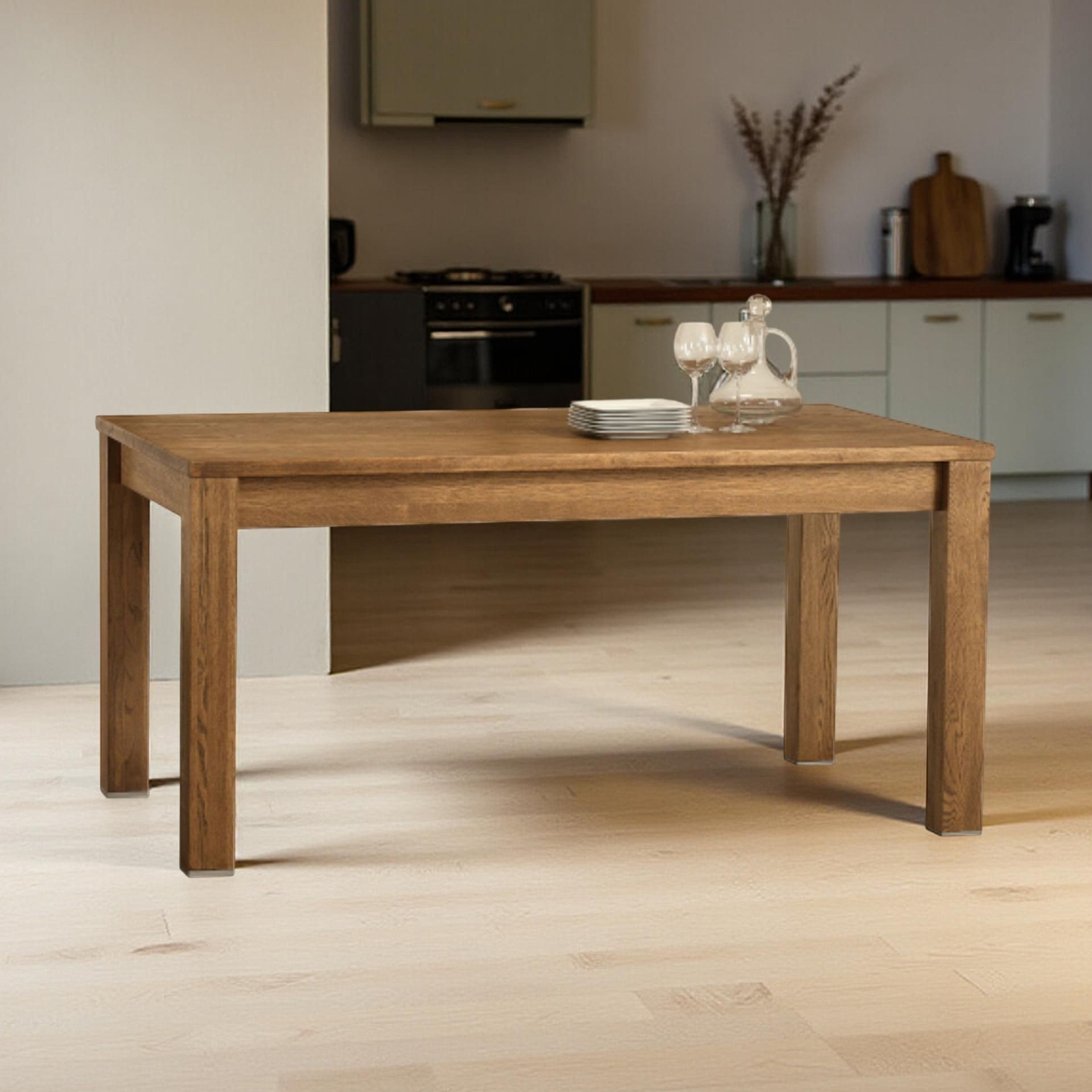 Stół dębowy Orlando to mebel, który staje się centralnym punktem każdego wnętrza, sprzyjając wspólnym chwilom i tworzeniu niezapomnianych wspomnień. Widoczny na zdjęciu stół w jasnym odcieniu dębu, z prostym, ale eleganckim blatem i solidnymi nogami, doskonale odzwierciedla jego funkcjonalność i ponadczasowy urok. Naczynia i miska z owocami na blacie podkreślają jego gotowość do przyjęcia gości. Dzięki możliwości rozłożenia, z łatwością przekształcisz go z kameralnego stołu rodzinnego w przestronne miejsce na większe uroczystości. Wybierz swoje ulubione wykończenie i ciesz się pięknem i praktycznością stołu Orlando, który wniesie do Twojego domu elegancję i komfort.