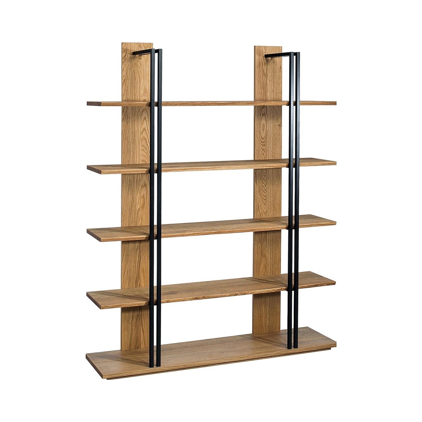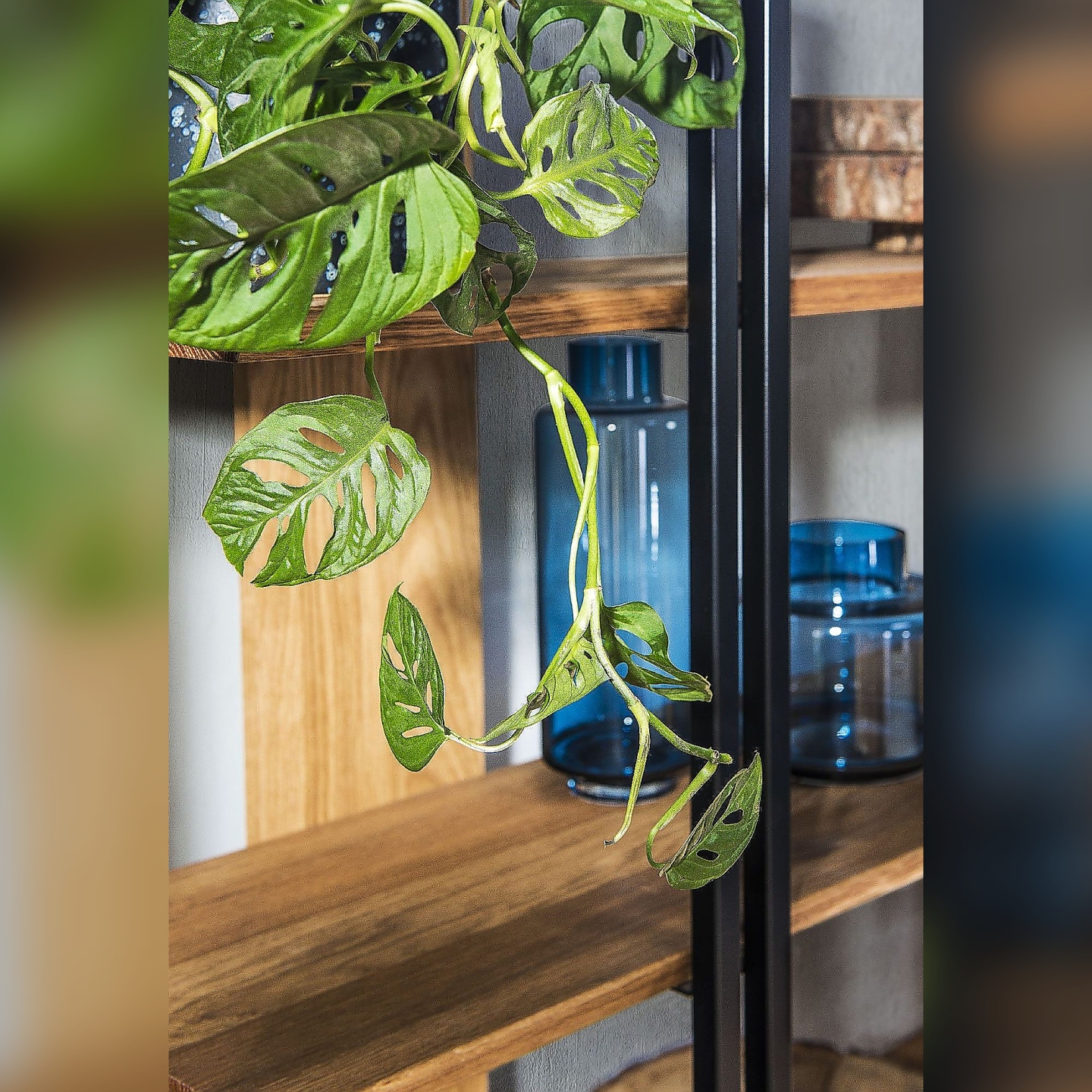 Przedstawiamy designerski i funkcjonalny regał Vigo, wykonany z wysokiej jakości drewna dębowego w wybarwieniu dąb olej natura. Ten nowoczesny regał, doskonale widoczny na załączonym zdjęciu, łączy w sobie surowość loftowego stylu z ciepłem naturalnego drewna. Charakteryzuje się otwartą konstrukcją z pięcioma przestronnymi półkami i czarnymi, metalowymi elementami pionowymi, które nadają mu lekkości i industrialnego charakteru. Fronty z litego, sękatego dębu oraz korpus z fornirowanej płyty wiórowej gwarantują trwałość i solidność na lata, a naturalne sęki w drewnie podkreślają jego autentyczność i unikalny charakter.