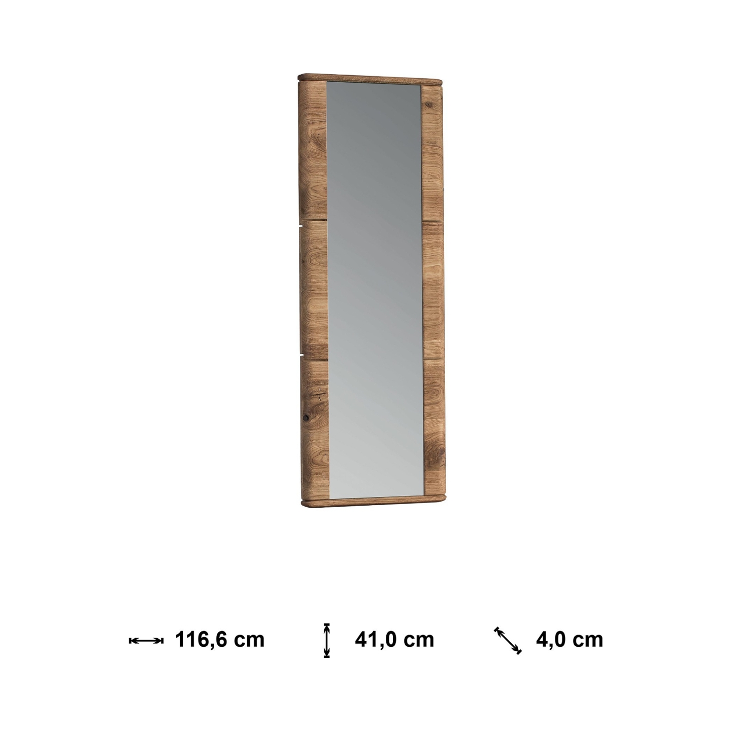 Przedstawiamy Państwu eleganckie lustro dębowe Denver I, które dzięki swojej smukłej formie i naturalnemu wykończeniu ramy z szczotkowanego, litego dębu ciętego po długości, idealnie wkomponuje się w przestrzeń przedpokoju lub garderoby. To niezbędny element wyposażenia każdego domu, który nie tylko umożliwia codzienne przeglądanie się, ale również optycznie powiększa wnętrze i dodaje mu więcej światła. Widoczne na zdjęciu lustro o szerokości 41 cm, wysokości 116,6 cm i głębokości 3,8 cm doskonale sprawdzi się zarówno w nowoczesnych, jak i rustykalnych aranżacjach, stanowiąc stylowy akcent dekoracyjny.