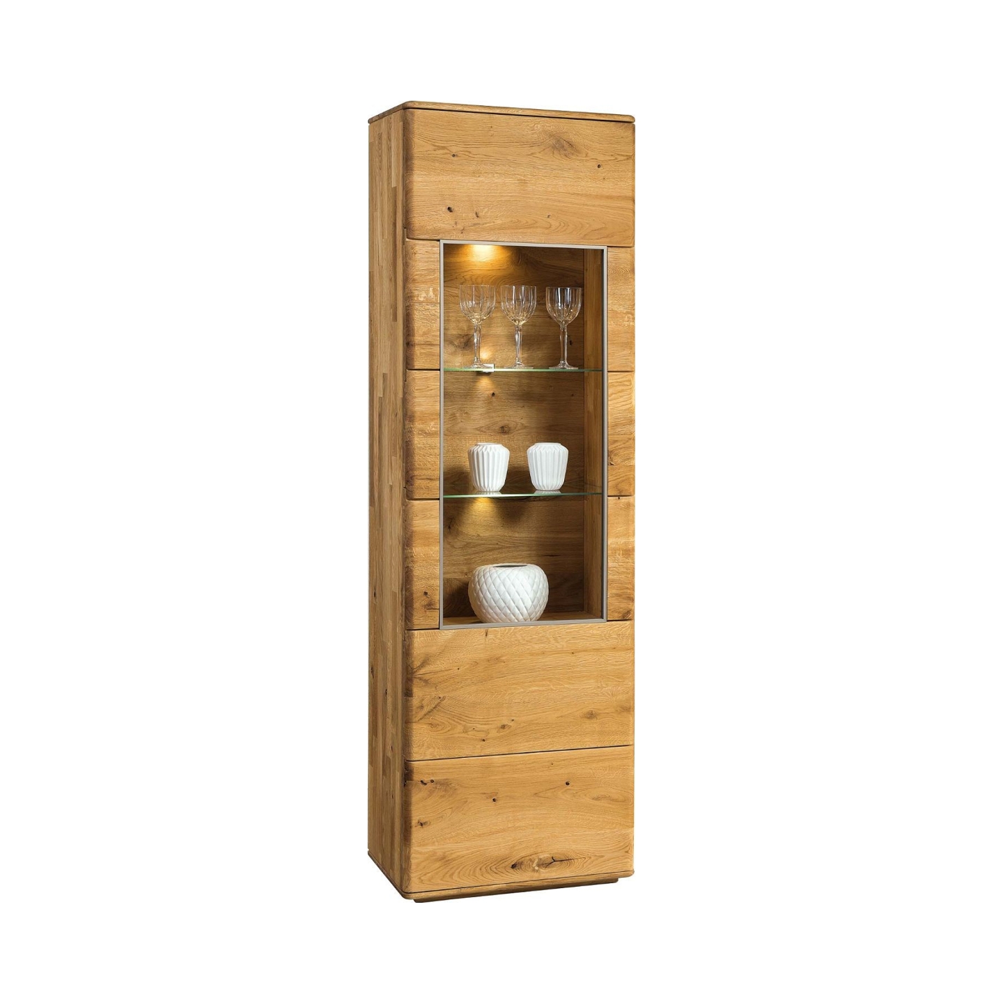 Przedstawiamy Państwu stylową i funkcjonalną witrynę pojedynczą Denver, wykonaną z wysokiej jakości drewna dębowego. Ten nowoczesny i elegancki mebel to doskonałe rozwiązanie do każdego salonu czy jadalni, dodając mu ciepła i naturalnego uroku. Fronty witryny wykonane są z litego drewna dębowego o charakterystycznym rysunku sękatej deski, a korpus również z litego dębu, co gwarantuje wyjątkową trwałość i solidność na lata. Dostępna jest w dwóch pięknych wybarwieniach: klasyczny dąb naturalny lub głęboki dąb palony, co pozwala idealnie dopasować witrynę do indywidualnych preferencji. Powierzchnia mebla jest starannie wykończona woskiem lub olejem, a także szczotkowana, co uwydatnia naturalne słoje drewna i nadaje jej niepowtarzalny charakter. Na załączonym zdjęciu widoczna jest wysoka, przeszklona witryna z oświetleniem wewnętrznym, idealna do eksponowania dekoracji i pamiątek.