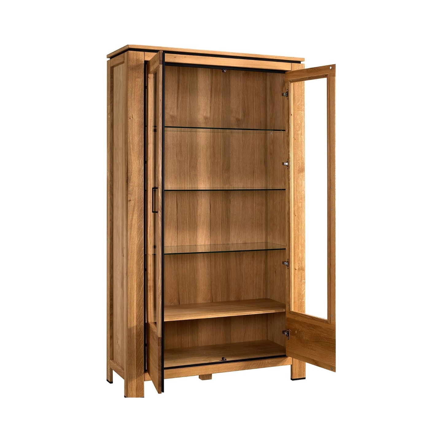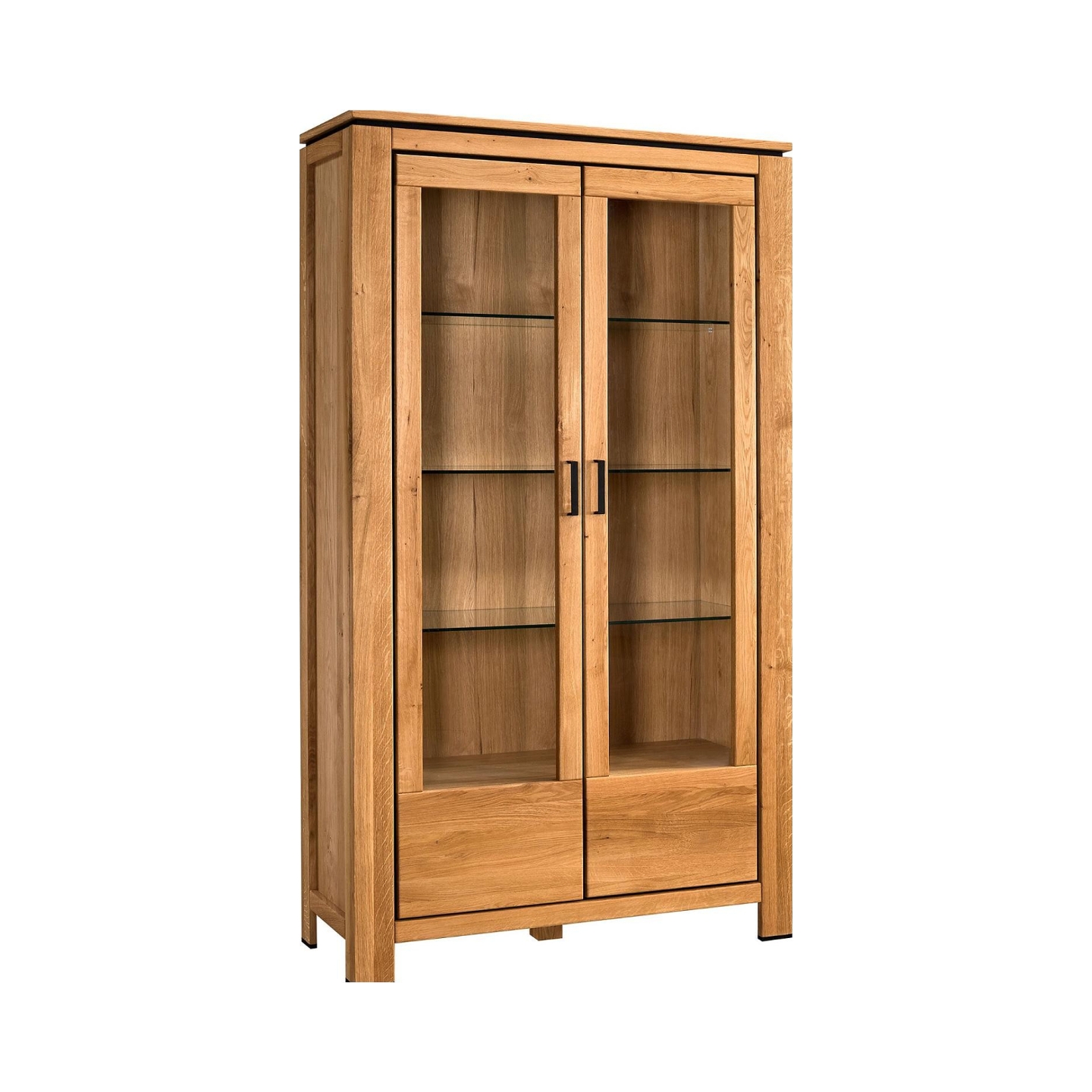 Prezentujemy Witrynę 2-drzwiową Faro II – majestatyczny i funkcjonalny mebel, który stanie się centralnym punktem każdego wnętrza, wnosząc do niego elegancję naturalnego dębu sęcznego i nowoczesne akcenty. Ta imponująca witryna, idealna do przestronnego salonu czy jadalni, została wykonana z najwyższą dbałością o detale, co gwarantuje jej trwałość i estetykę na lata. Fronty z dębu sęcznego ciętego po długości oraz masywny wieniec górny z litego dębu, w połączeniu z korpusem z płyty wiórowej fornirowanej dębem, tworzą spójną i solidną całość. Wykończenie olejem/woskiem natura podkreśla naturalne piękno drewna, a gładka, nie szczotkowana powierzchnia frontów i korpusu dodaje jej nowoczesnego charakteru. Czarne metalowe uchwyty oraz dyskretne czarne akcenty wokół drzwi i pod wieńcem górnym, wraz z czarnymi ślizgaczami z płyty MDF, nadają witrynie industrialnego sznytu, tworząc harmonijną kompozycję kontrastów.