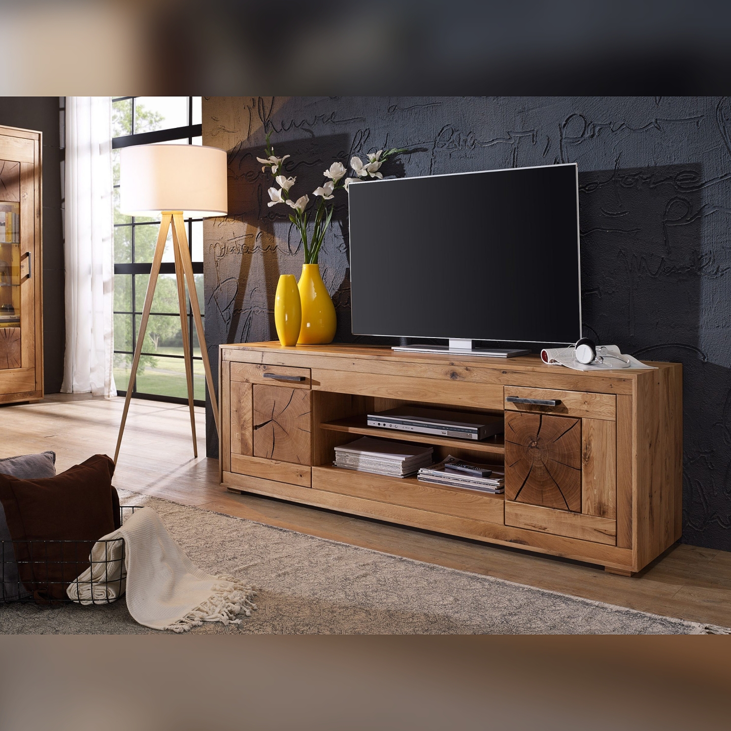Bezbarwny olej w macie zabezpiecza powierzchnię, zachowując jasny, świeży kolor dębu oraz jego surową, przyjemną w dotyku fakturę. Przy szerokości 200 cm szafka dobrze komponuje się z dużymi ekranami, porządkuje strefę RTV i zachowuje wizualną równowagę we wnętrzu.