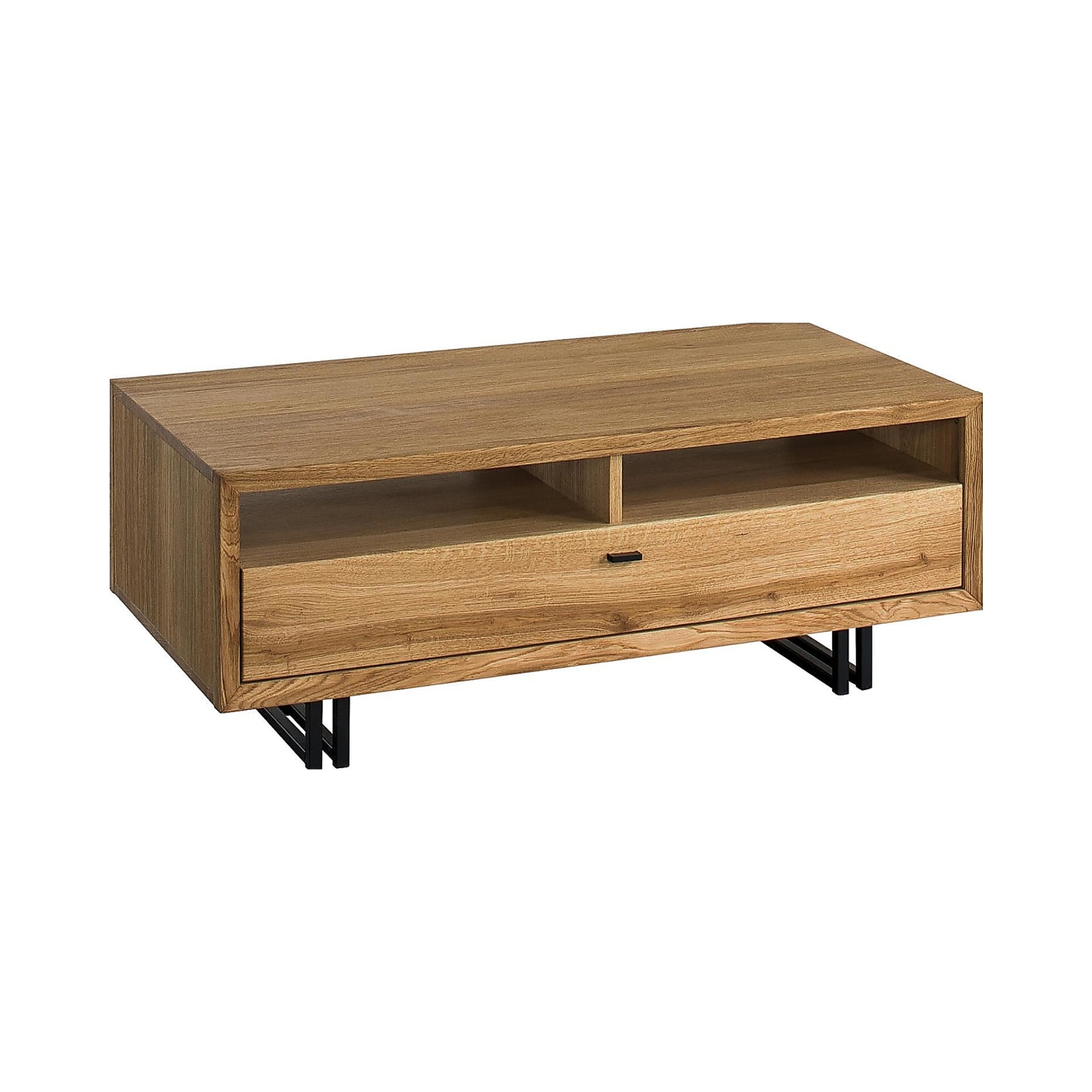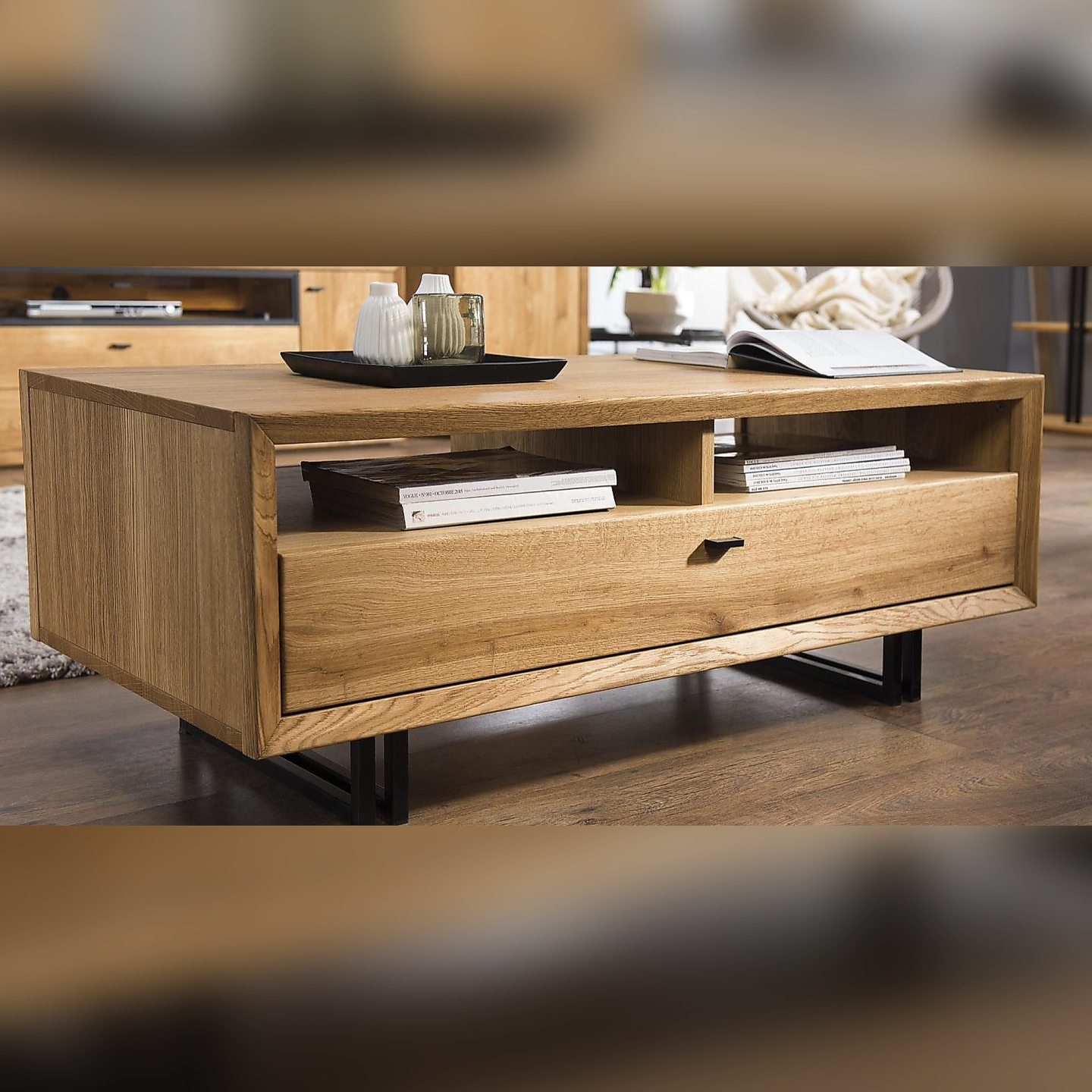 Przedstawiamy Stolik kawowy Vigo, wykończony w naturalnym odcieniu dębu olejowanego. Ten niezwykle funkcjonalny mebel, widoczny na załączonym zdjęciu, wyróżnia się prostą, a zarazem modernistyczną formą, która doskonale wkomponuje się w nowoczesne i minimalistyczne wnętrza. Stolik Vigo to idealne uzupełnienie każdej strefy wypoczynkowej, oferujące komfortowe miejsce na kawę, przekąski oraz sprytne rozwiązania do przechowywania.