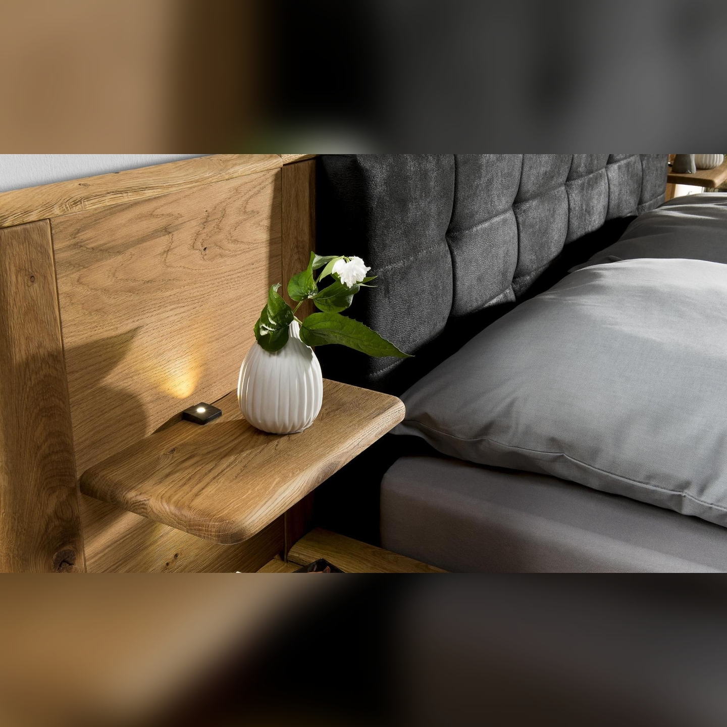 Prezentujemy funkcjonalną i stylową szafkę nocną/półkę ścienną Denver Typ 35, zaprojektowaną jako wariant prawy, idealny do uzupełnienia Twojej sypialni. Wykonana z wysokiej jakości drewna dębowego w wykończeniu dąb olej natura, łączy w sobie naturalne piękno materiału z nowoczesnym designem. Jak widać na załączonym zdjęciu, mebel charakteryzuje się masywnym, pionowym panelem z zaokrąglonym górnym rogiem po prawej stronie, do którego przymocowana jest solidna, wystająca półka. Fronty z litego dębu sękatego oraz korpus z fornirowanej dębowej płyty stolarskiej gwarantują trwałość i solidność, a naturalne sęki w drewnie podkreślają jej autentyczność i unikalny charakter.