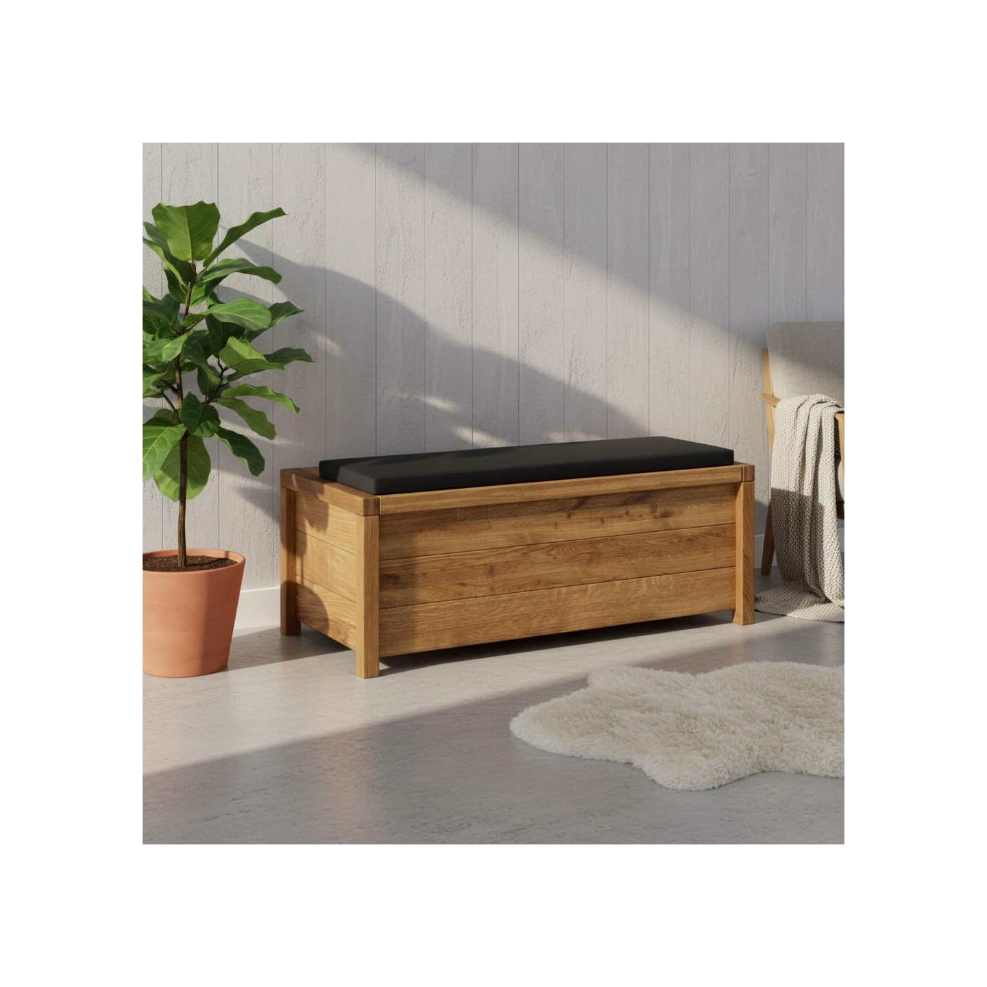 Przekształć swoją dużą skrzynię Denver w komfortowe miejsce do wypoczynku dzięki poduszce Typ 12. Ta dedykowana nakładka została zaprojektowana z myślą o większych modułach kolekcji, oferując szeroką i wygodną powierzchnię do siedzenia. Połączenie litego dębu z miękkim, czarnym wykończeniem to kwintesencja nowoczesnej elegancji, która nada Twojemu wnętrzu luksusowego charakteru.