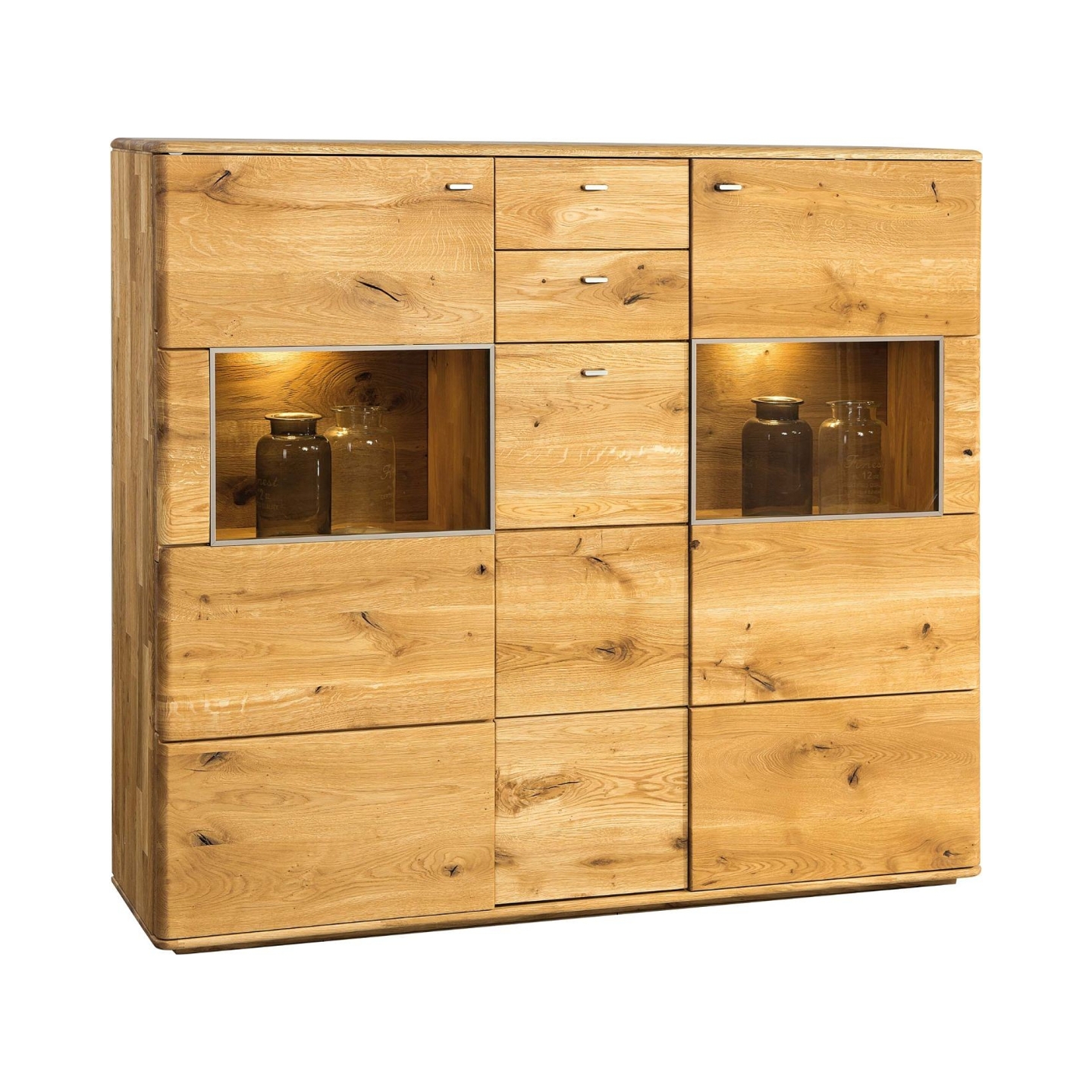 Przedstawiamy Państwu stylowy i funkcjonalny kredens Denver II, wykonany z najwyższej jakości drewna dębowego. Ten nowoczesny i elegancki mebel to doskonałe rozwiązanie do każdego salonu, jadalni czy gabinetu, łączące w sobie estetykę z praktycznością. Fronty kredensu są zrobione z litego drewna dębowego o charakterystycznym rysunku sękatej deski, a korpus również z litego dębu, co gwarantuje jego wyjątkową trwałość i solidność na lata. Dostępny w dwóch pięknych wybarwieniach: klasyczny dąb naturalny lub głęboki dąb palony, pozwala idealnie dopasować kredens do indywidualnych preferencji. Powierzchnia mebla jest starannie wykończona woskiem lub olejem, a także szczotkowana, co uwydatnia naturalne słoje drewna i nadaje mu niepowtarzalny charakter. Na załączonym zdjęciu widoczny jest kredens z przeszkloną witryną, szufladami i zamykaną szafką, co zapewnia wszechstronne możliwości przechowywania i eksponowania.