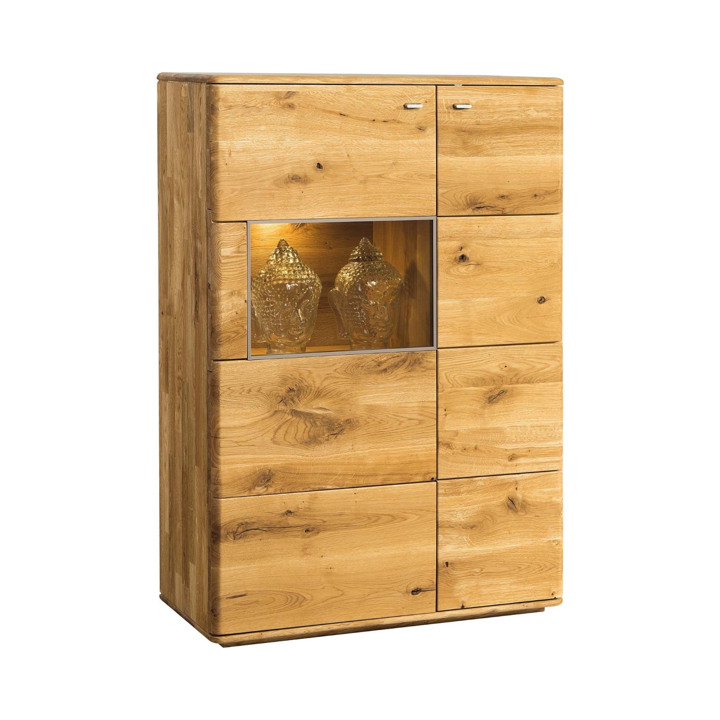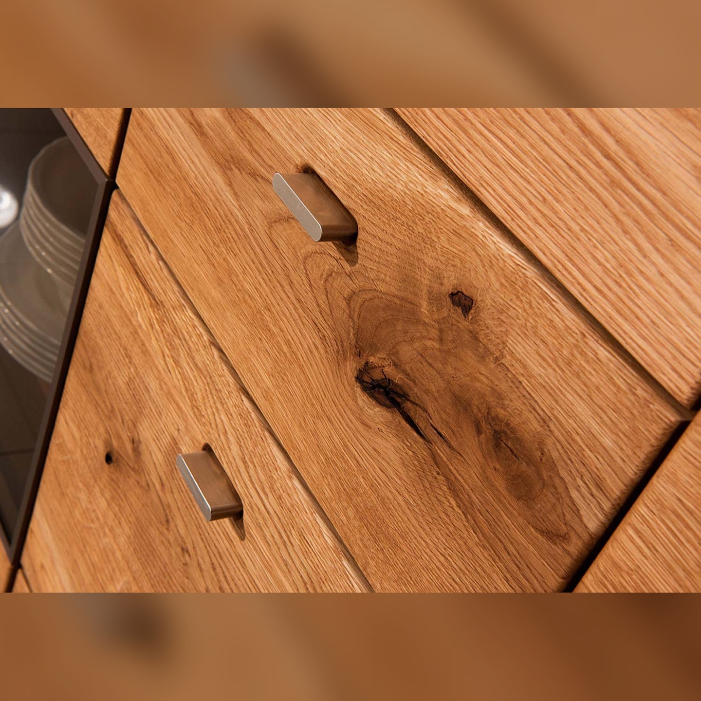 Przedstawiamy Państwu elegancki i funkcjonalny kredens Denver I, wykonany z wysokiej jakości drewna dębowego. Ten nowoczesny i stylowy mebel doskonale wkomponuje się w każde wnętrze, dodając mu ciepła i naturalnego uroku. Fronty kredensu wykonane są z litego drewna dębowego o charakterystycznym rysunku sękatej deski, a korpus również z litego dębu, co gwarantuje wyjątkową trwałość i solidność na lata. Dostępny jest w dwóch wybarwieniach: klasyczny dąb naturalny lub wyrazisty dąb palony, co pozwala idealnie dopasować kredens do indywidualnych preferencji. Powierzchnia mebla jest starannie wykończona woskiem lub olejem, a także szczotkowana, co uwydatnia naturalne słoje drewna. Na załączonym zdjęciu widoczny jest kredens z przeszkloną witryną po lewej stronie, szufladą i zamykaną szafką, co zapewnia wszechstronne możliwości przechowywania i eksponowania.
