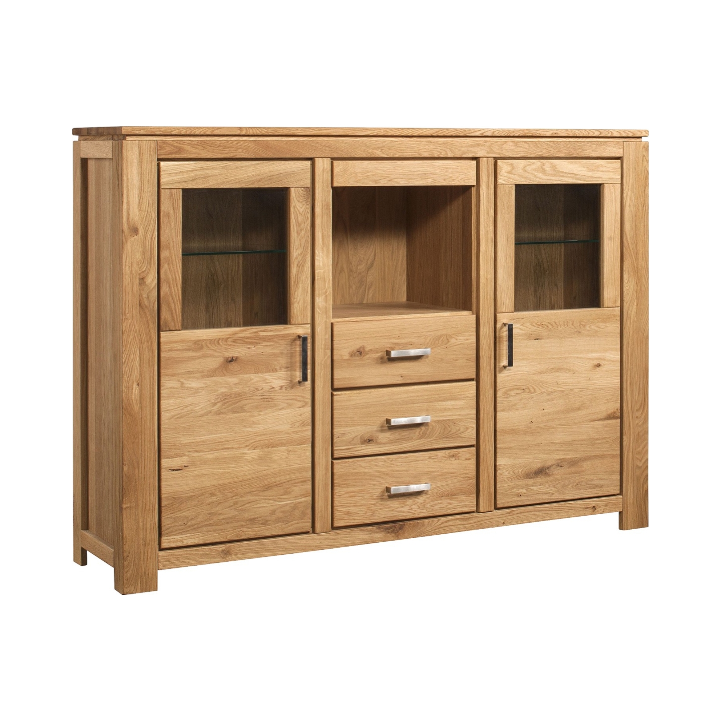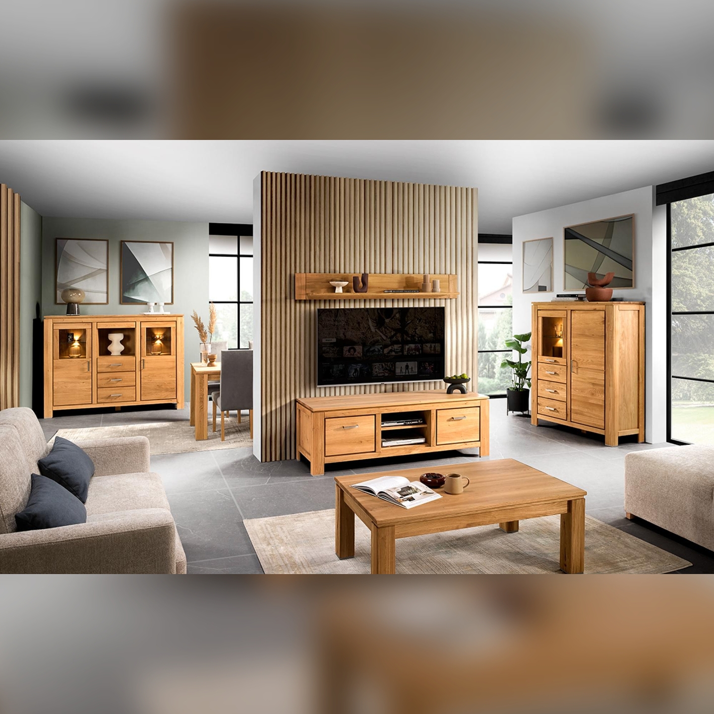 Przedstawiamy Kredens II Faro z dębu sęcznego – mebel, który zachwyca swoją estetyką, funkcjonalnością oraz niezrównaną jakością i precyzją wykonania. Ten imponujący kredens, widoczny na załączonym zdjęciu, przyciąga uwagę harmonijnym połączeniem różnorodnych materiałów: pięknego, olejowanego drewna z unikalnymi słojami i sękami, eleganckiego szkła oraz solidnej płyty fornirowanej na korpusach. Jest to idealne rozwiązanie do salonu, jadalni czy gabinetu, gdzie zarówno przechowywanie, jak i ekspozycja mają kluczowe znaczenie.